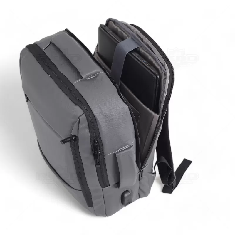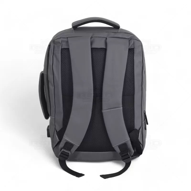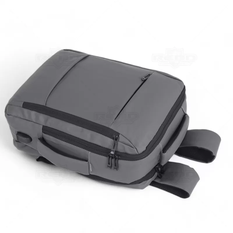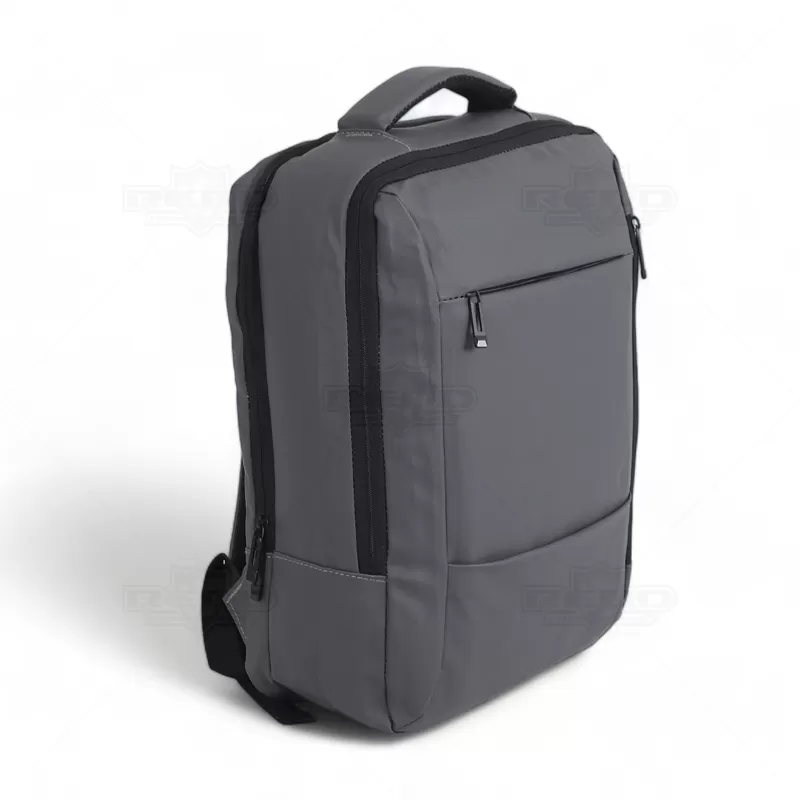Mochila pasta para notebook personalizada, produzida em tecido sintético simulando couro, com alta resistência a água e com 2 modos de transporte, estilo híbrida (2 em 1). Possui um modo mochila, com parte posterior e alças almofadadas. Também pode ser utilizada em modo pasta, com uma alça de mão reforçada e confortável. Contém 2 compartimentos principais: 1 com bolso para notebook até 15,6" e tablet; e outro com elástico para fixação de roupas, bolsos para documentos/canetas e conexão USB. Possui ainda 1 bolso frontal com zíper na verrtical de fácil acesso para carteira, documento ou qualquer objeto que queira sempre a mão e o último disfarçado "anti-furto" para objetos de valor, conta ainda com faixa trolley. Uma opção versátil que combina estilo e praticidade, sendo uma escolha popular para aqueles que procuram uma mochila com duas finalidades e uma estética descontraída e resistente. Imagem ilustrativa, objetos decorativos não acompanham o produto. Ideal para eventos corporativos, brindes promocionais e convenções turísticas.