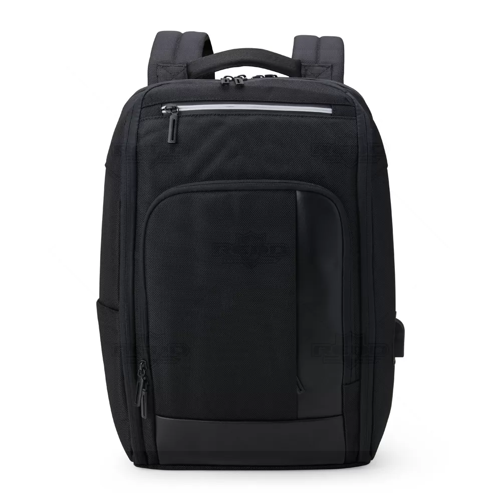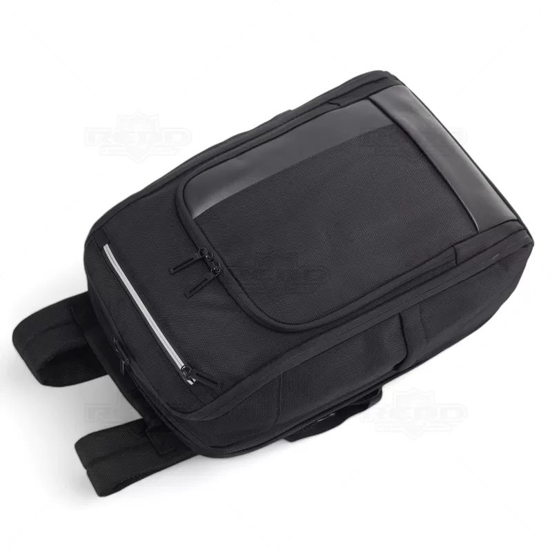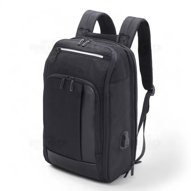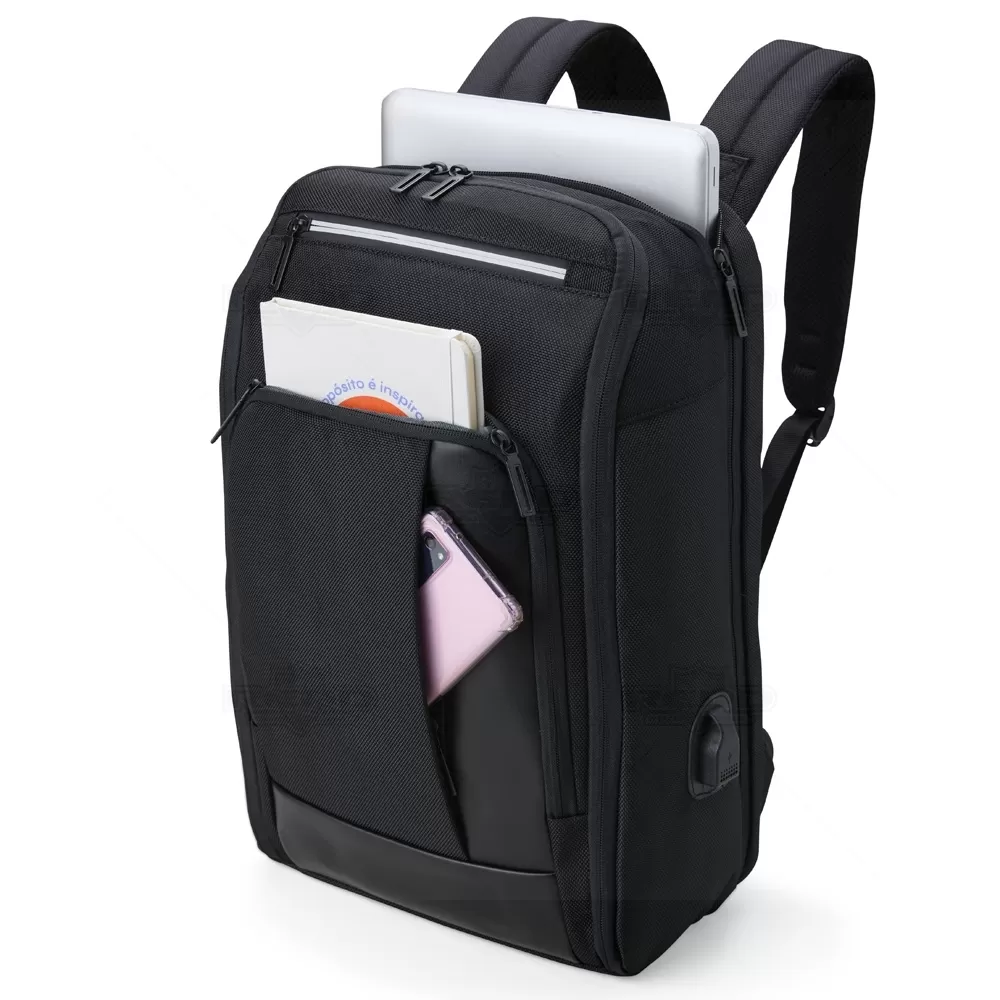 Mochila para notebook personalizada, produzida nylon com detalhe em tecido sintético simulando couro. Possui parte posterior e alças almofadadas ajustáveis com suporte para óculos e bolso para cartão, bolso antifurto com fechamento em zíper e alça trolley. Conta com 2 compartimentos principais: 1 com bolso para notebook até 15,6", periféricos e outro com diversos bolsos para documentos, canetas, pastas e ainda dois laterais internos sendo um com acesso para a porta USB para conexão de power bank (não incluso). Possui ainda 2 bolsos frontais com zíper de fácil acesso. Uma opção versátil que combina estilo e praticidade, sendo uma escolha popular para aqueles que procuram em uma mochila uma estética descontraída e resistente. Imagem ilustrativa, objetos decorativos não acompanham o produto. Ideal para eventos corporativos, brindes promocionais.