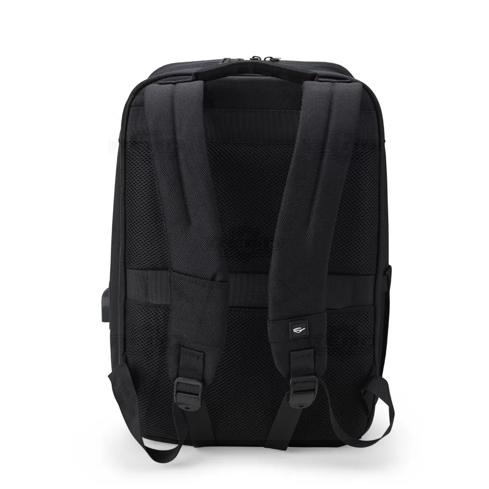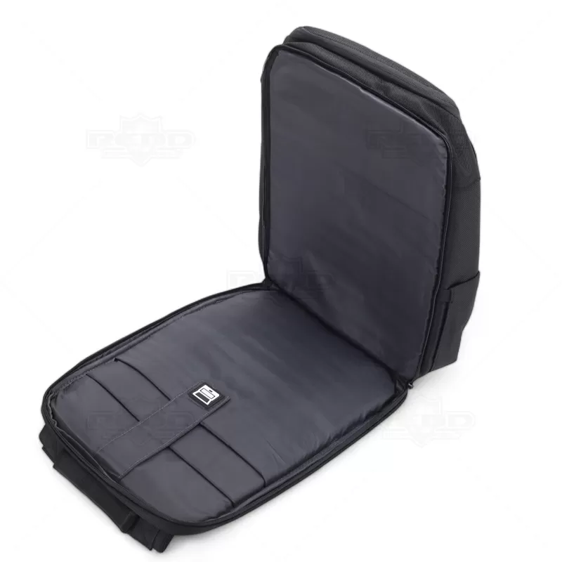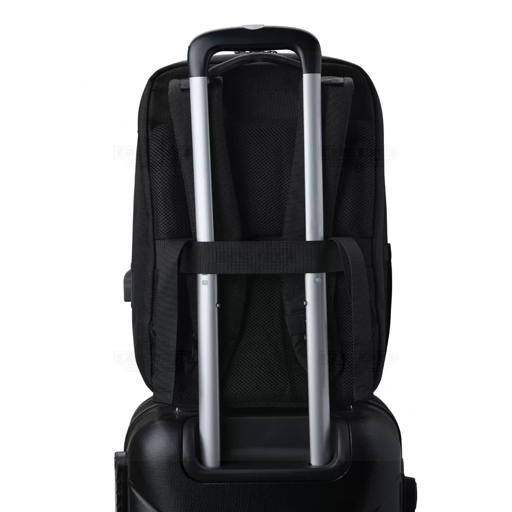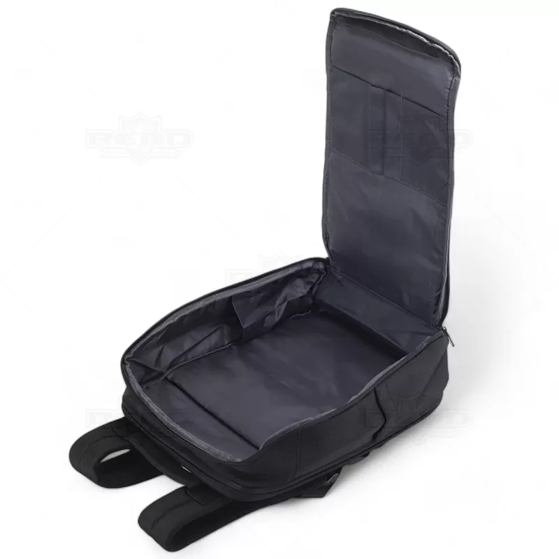 Mochila para notebook personalizada, produzida nylon com detalhe em tecido sintético simulando couro. Possui parte posterior e alças almofadadas ajustáveis com suporte para óculos e bolso para cartão, bolso antifurto com fechamento em zíper e alça trolley. Conta com 2 compartimentos principais: 1 com bolso para notebook até 15,6", periféricos e outro com diversos bolsos para documentos, canetas, pastas e ainda dois laterais internos sendo um com acesso para a porta USB para conexão de power bank (não incluso). Possui ainda 2 bolsos frontais com zíper de fácil acesso. Uma opção versátil que combina estilo e praticidade, sendo uma escolha popular para aqueles que procuram em uma mochila uma estética descontraída e resistente. Imagem ilustrativa, objetos decorativos não acompanham o produto. Ideal para eventos corporativos, brindes promocionais.