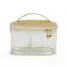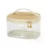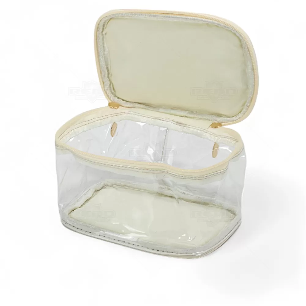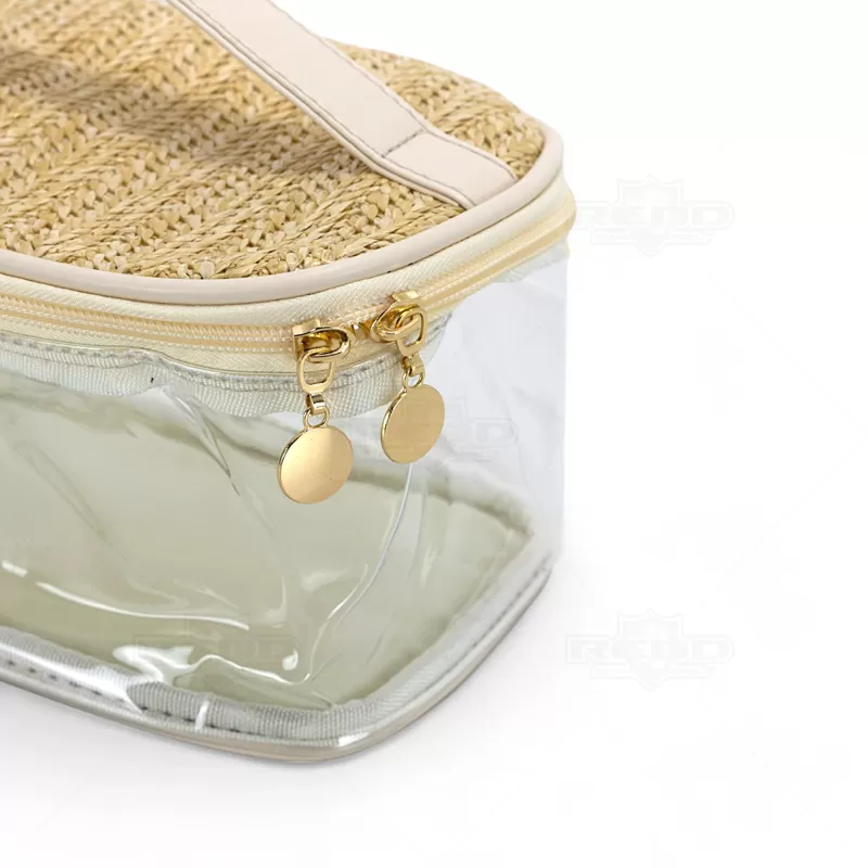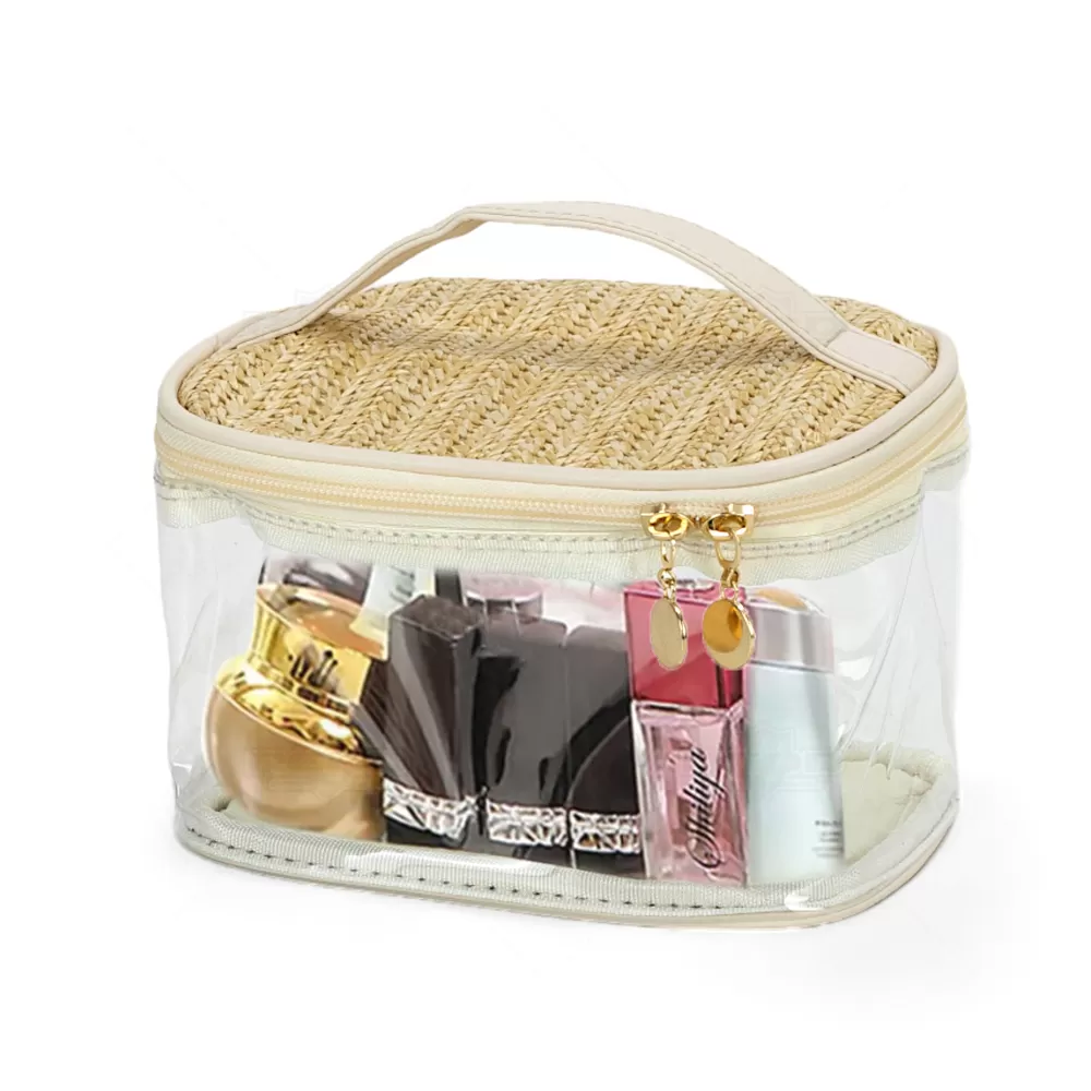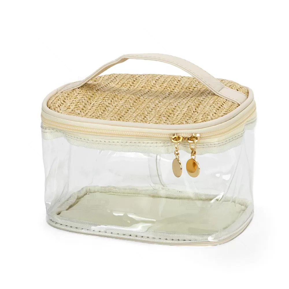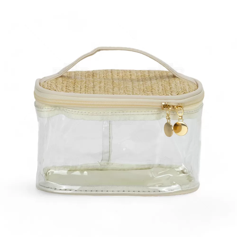 A necessaire personalizada é confeccionada em PVC transparente de alto brilho e translúcido, oferecendo um visual moderno e elegante. Com alça de mão e zíper com puxadores dourados, é ideal para viagens, academia, trabalho e outros deslocamentos. A tampa e a base são feitas em junco, adicionando um toque de sofisticação, permitindo armazenar e transportar maquiagens, cremes e cosméticos em geral com muita praticidade. Totalmente maleável e fácil de lavar, é uma solução prática para organizar seus itens pessoais. Perfeita para brindes promocionais e eventos corporativos, a necessaire destaca sua marca de forma funcional e estilosa, proporcionando aos seus clientes e colaboradores um produto útil e sofisticado. Imagem Ilustrativa.