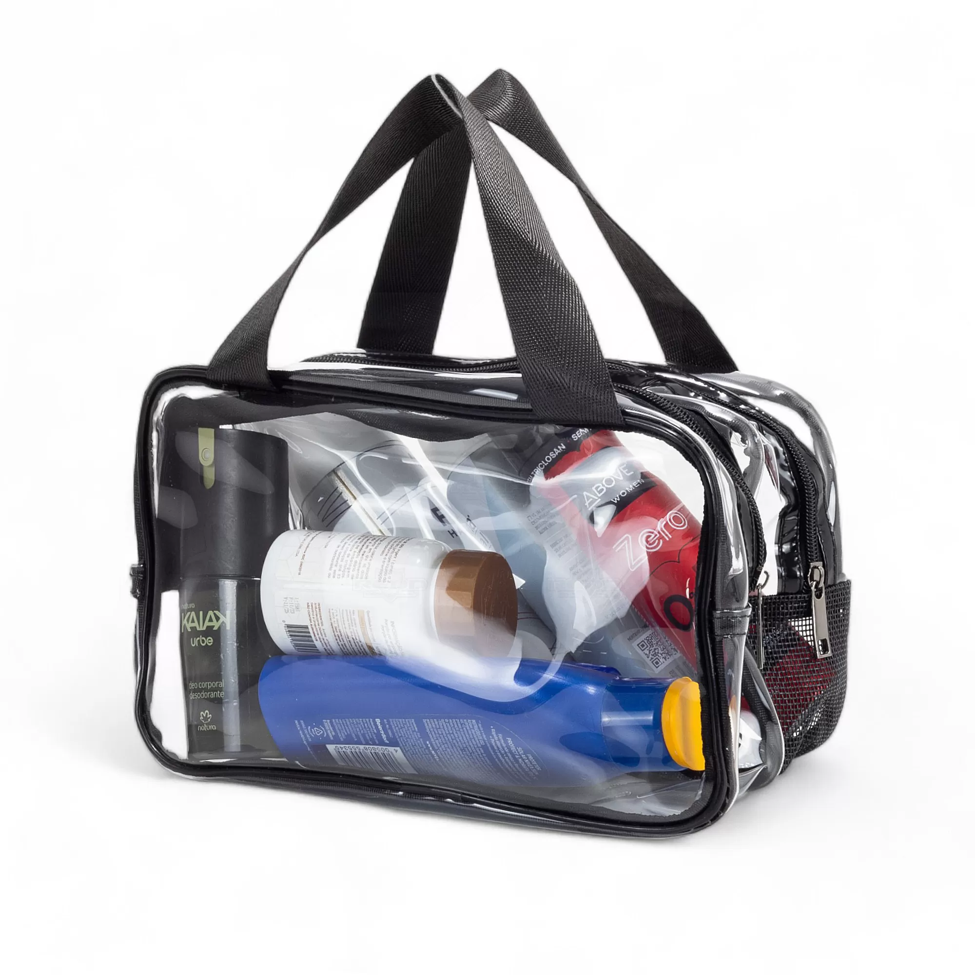 Esta necessaire é confeccionada em PVC transparente e tecido sintético, oferecendo uma combinação de estilo e durabilidade. Seu design resistente a água em garante que seus itens fiquem protegidos contra umidade em um compartimento e o outro proporcionando o inverso, com sua base telada deixando com que haja ventilação e os seus itens "respirem", tornando-a ideal para viagens ou uso diário. A visualização permite que acesse facilmente o conteúdo, facilitando o acesso aos itens armazenados. As duas alças laterais de mão em nylon proporcionam um transporte confortável e seguro. O fechamento em zíper assegura que tudo permaneça no lugar, evitando derramamentos ou perdas. Prática e elegante, esta necessaire é perfeita para organizar produtos de higiene pessoal, maquiagem ou outros pequenos itens. Seu estilo versátil a torna adequada tanto para homens quanto para mulheres, sendo uma excelente opção para presentes personalizados ou brindes promocionais em eventos corporativos. Combine funcionalidade e sofisticação com esta necessaire, que certamente agradará a todos que a receberem. Imagem ilustrativa.