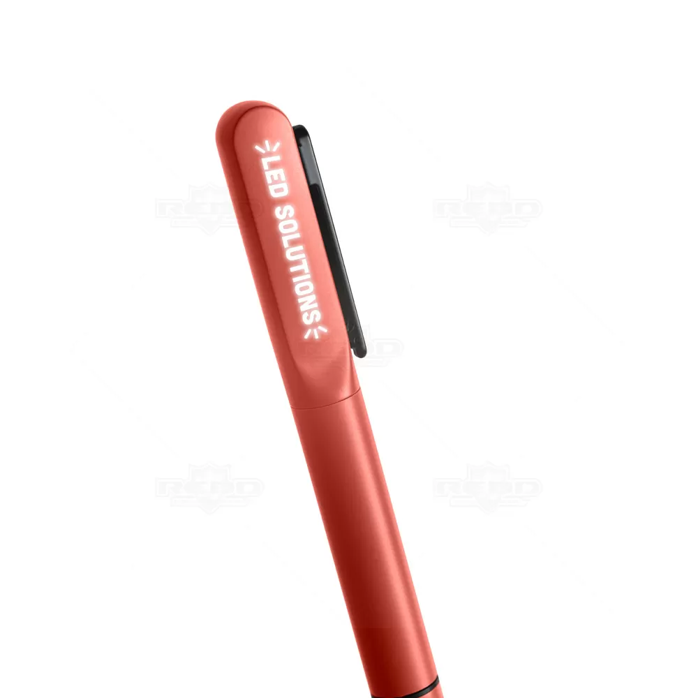 Feita em alumínio 94% reciclado, esta esferográfica é uma escolha sustentável e inovadora para suas necessidades de escrita. A tinta azul proporciona uma escrita suave e consistente. O diferencial desta esferográfica é a capacidade de iluminar o logotipo ou a personalização gravada na parte superior, próximo ao clip, que acende ao ser rodado, criando um efeito visual impactante e moderno. Ideal para profissionais, estudantes e eventos corporativos, esta esferográfica combina funcionalidade e estilo, tornando-se uma excelente opção para brindes promocionais e presentes personalizados. Uma escolha sustentável que destaca sua marca de forma inovadora e elegante.