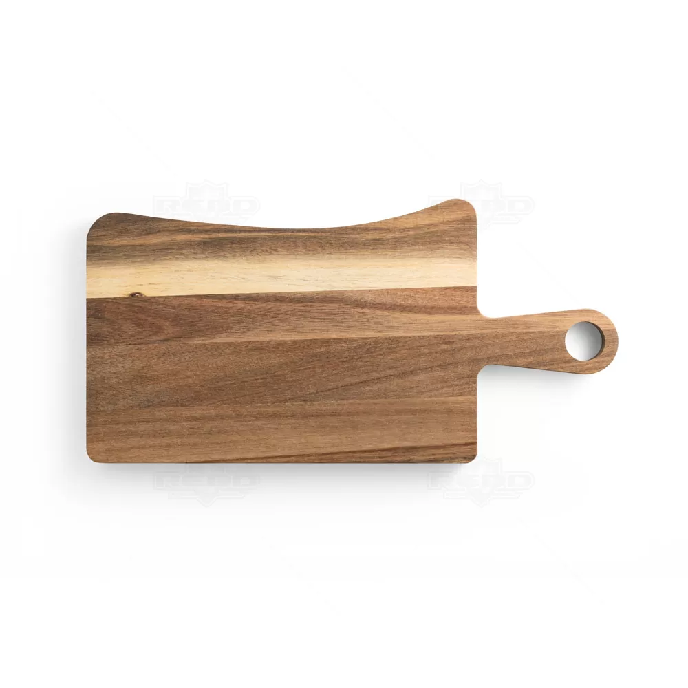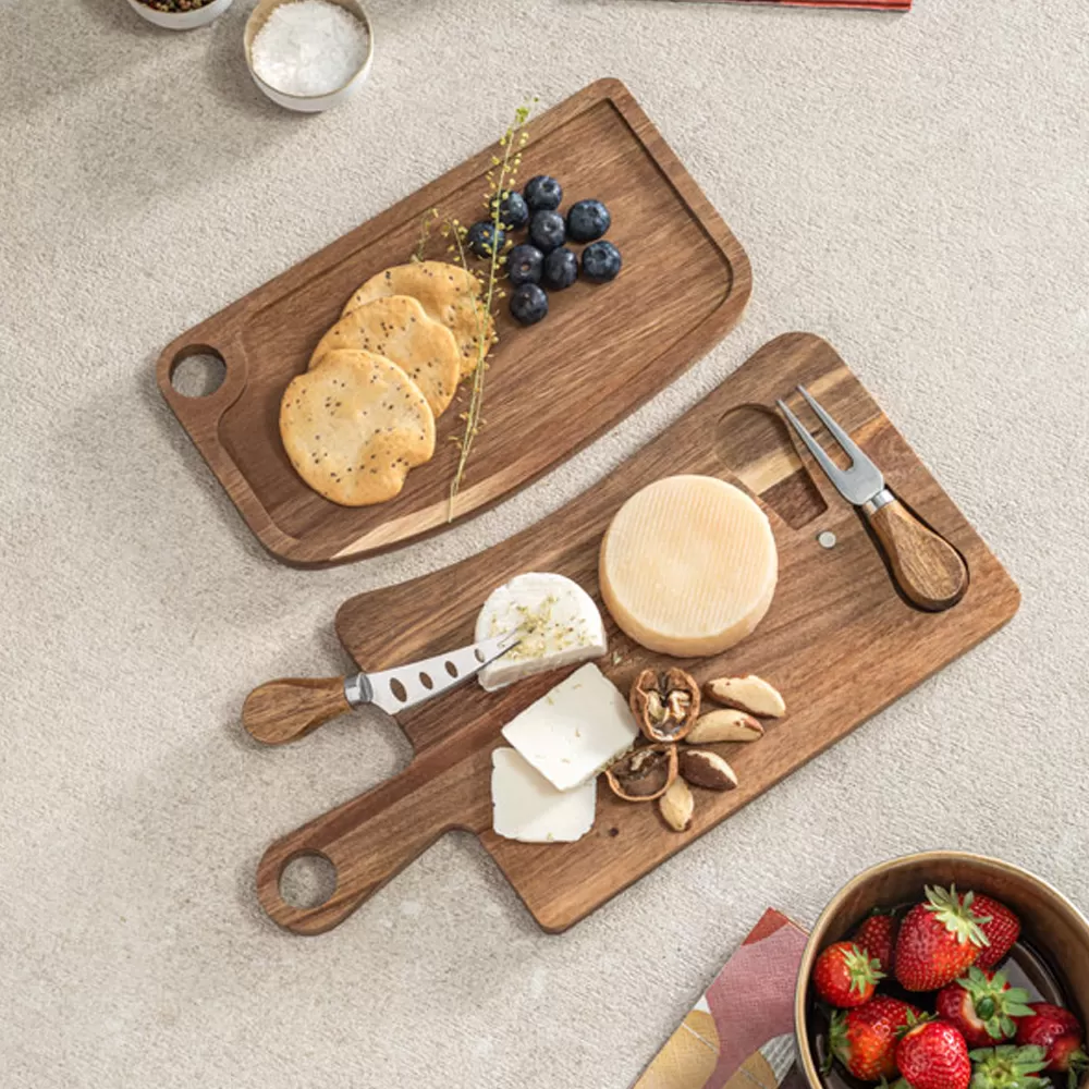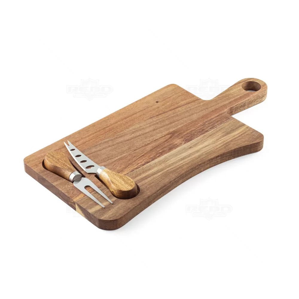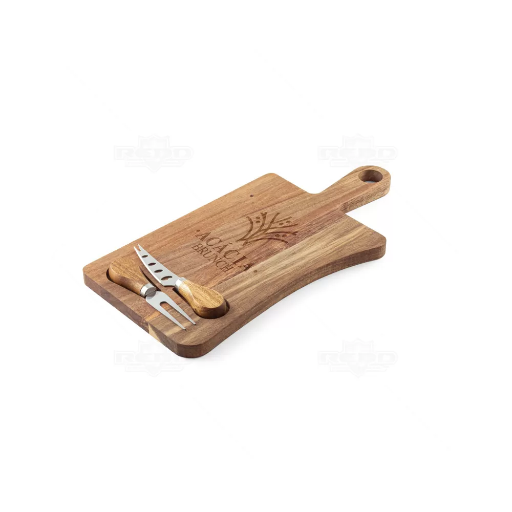 Feita de madeira de acácia proveniente de gestão florestal sustentável, esta tábua de queijos combina elegância e funcionalidade. Acompanha dois utensílios essenciais, uma faca e um garfo, ambos em madeira de acácia e aço inox. Os utensílios são mantidos no lugar por uma ranhura magnética na tábua, garantindo organização e praticidade. A tábua possui uma pega que facilita o transporte e o manuseio, além de permitir pendurá-la para uma melhor arrumação. A cor e o resultado da impressão podem variar devido às características naturais da madeira, tornando cada peça única. Fornecida em uma caixa presente de papel kraft reciclado, esta tábua é ideal para amantes de queijos, cozinheiros e apreciadores de utensílios de cozinha sustentáveis, tornando-a perfeita para brindes promocionais, eventos corporativos e presentes personalizados.