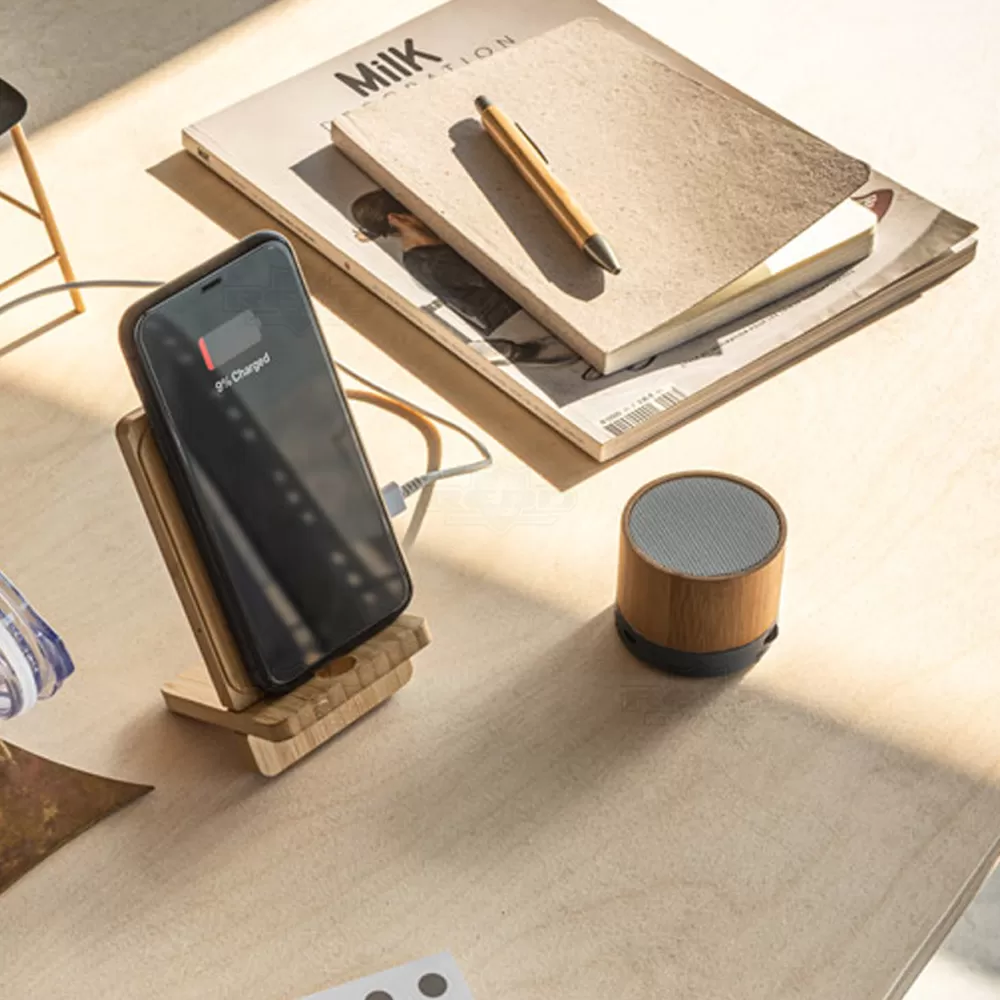 A caixa de som portátil com microfone, feita em bambu e ABS 100% reciclado, combina sustentabilidade e funcionalidade. Com transmissão sem fios Bluetooth 5.3, oferece uma potência de 3W e uma bateria de 400 mAh, garantindo uma autonomia aproximada de 4h30. Além de reproduzir música, esta caixa de som permite atender chamadas, possui leitor de cartões microSD, entrada AUX e reprodução automática via porta USB-A. Acompanha um cabo de carregamento USB, proporcionando praticidade no uso diário. Fornecida em uma caixa presente de papel kraft, é perfeita para brindes personalizados e eventos corporativos. A cor e o resultado da impressão nos materiais naturais podem variar entre produtos, tornando cada peça única. Ideal para quem busca um presente sustentável e funcional, esta caixa de som portátil destaca-se pela sua versatilidade e compromisso com o meio ambiente.