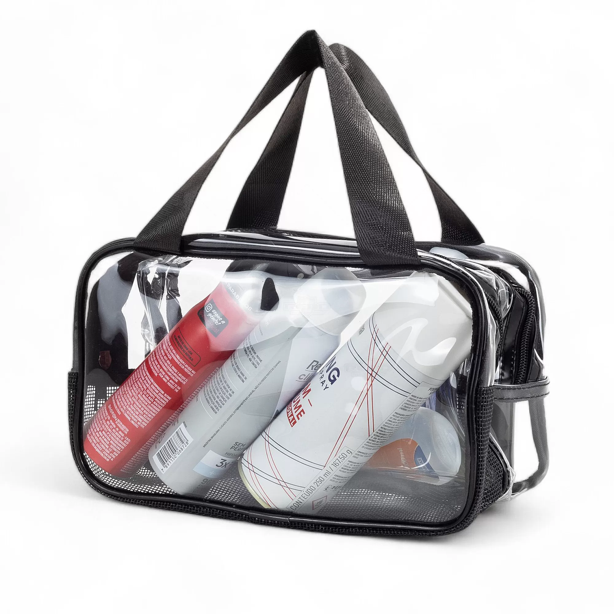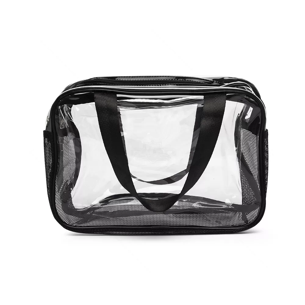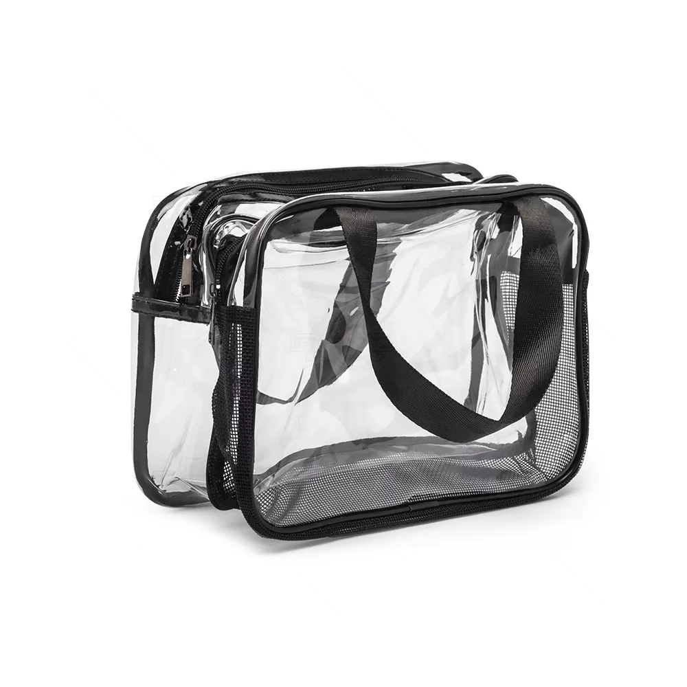 Esta necessaire é confeccionada em PVC transparente e tecido sintético, oferecendo uma combinação de estilo e durabilidade. Seu design resistente a água em garante que seus itens fiquem protegidos contra umidade em um compartimento e o outro proporcionando o inverso, com sua base telada deixando com que haja ventilação e os seus itens "respirem", tornando-a ideal para viagens ou uso diário. A visualização permite que acesse facilmente o conteúdo, facilitando o acesso aos itens armazenados. As duas alças laterais de mão em nylon proporcionam um transporte confortável e seguro. O fechamento em zíper assegura que tudo permaneça no lugar, evitando derramamentos ou perdas. Prática e elegante, esta necessaire é perfeita para organizar produtos de higiene pessoal, maquiagem ou outros pequenos itens. Seu estilo versátil a torna adequada tanto para homens quanto para mulheres, sendo uma excelente opção para presentes personalizados ou brindes promocionais em eventos corporativos. Combine funcionalidade e sofisticação com esta necessaire, que certamente agradará a todos que a receberem. Imagem ilustrativa.