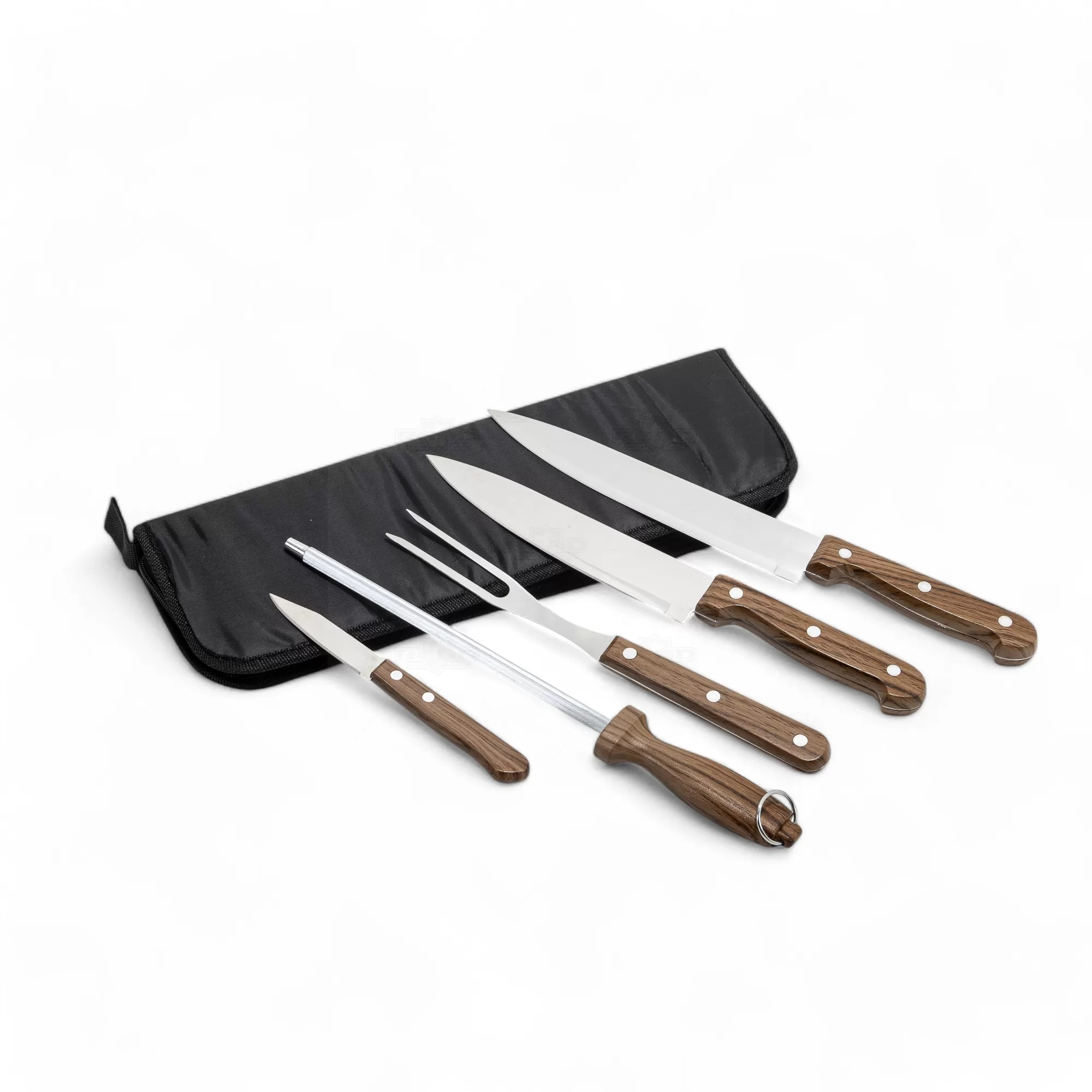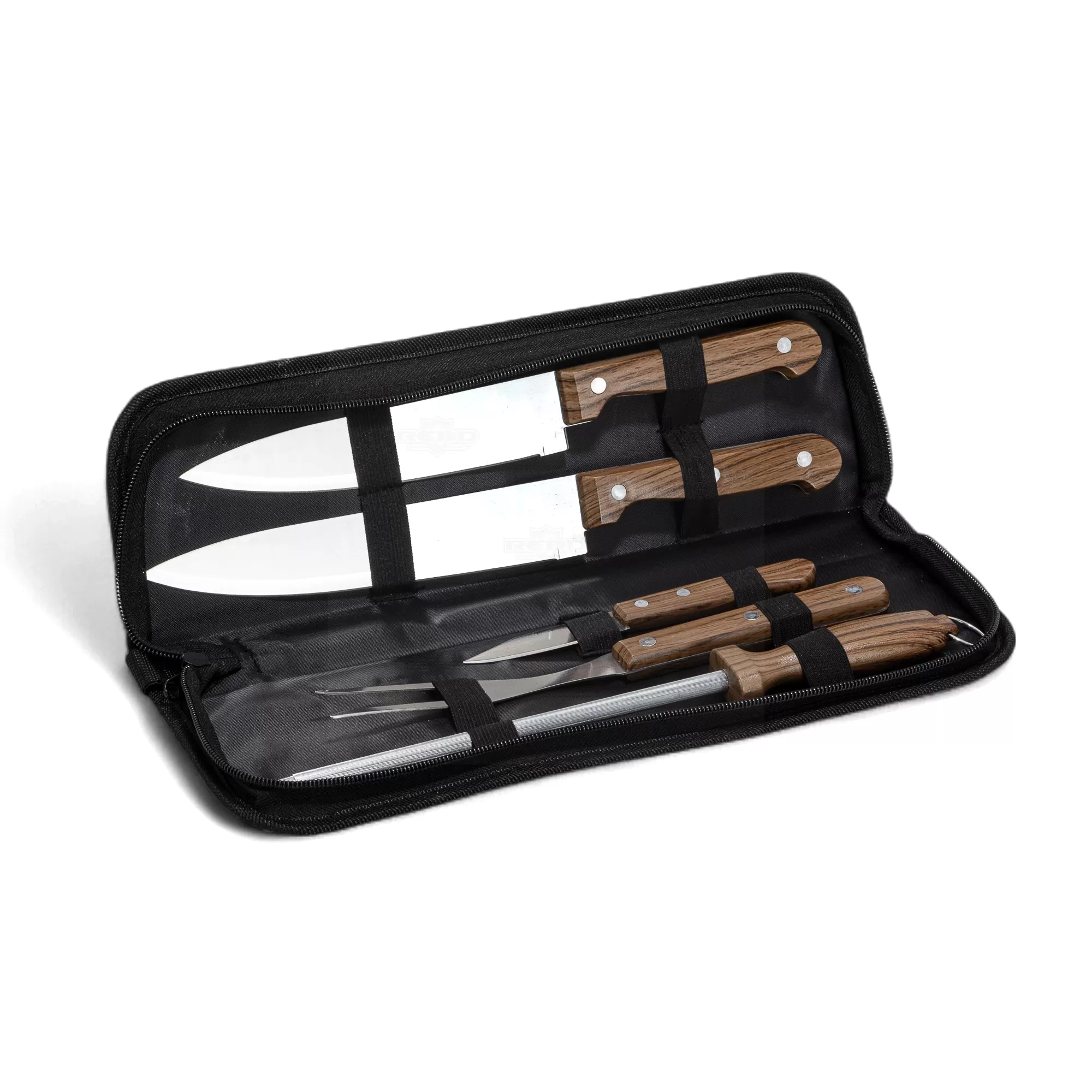 O kit churrasco personalizado é um conjunto essencial para os entusiastas de churrasco, composto por cinco peças indispensáveis, este kit vem em um estojo prático para transporte, ideal para garantir que você tenha sempre os utensílios certos à mão. Feito de material resistente, oferece proteção e durabilidade, mantendo os utensílios organizados e seguros, equipado com uma alça robusta, facilita o transporte, permitindo que você leve seu kit para qualquer lugar com comodidade. As peças são fixadas por elásticos, garantindo que permaneçam seguras e organizadas, este sistema de fixação facilita o acesso rápido aos utensílios quando necessário. Inclui três, sendo 02 facas de corte ("CHEF" de 07" e 06") e uma de legumes (de 03"), feitas de aço inoxidável; uma chaira de alta qualidade para manter as facas sempre afiadas, garantindo cortes precisos e um garfo trinchante, essencial para diversas tarefas culinárias. Utensílios versáteis que podem ser usados no dia a dia da cozinha para uma variedade de preparações, é a combinação perfeita de funcionalidade, qualidade e estilo, tornando-se um item indispensável para levar a visibilidade que a sua marca merece com a personalização deste item.