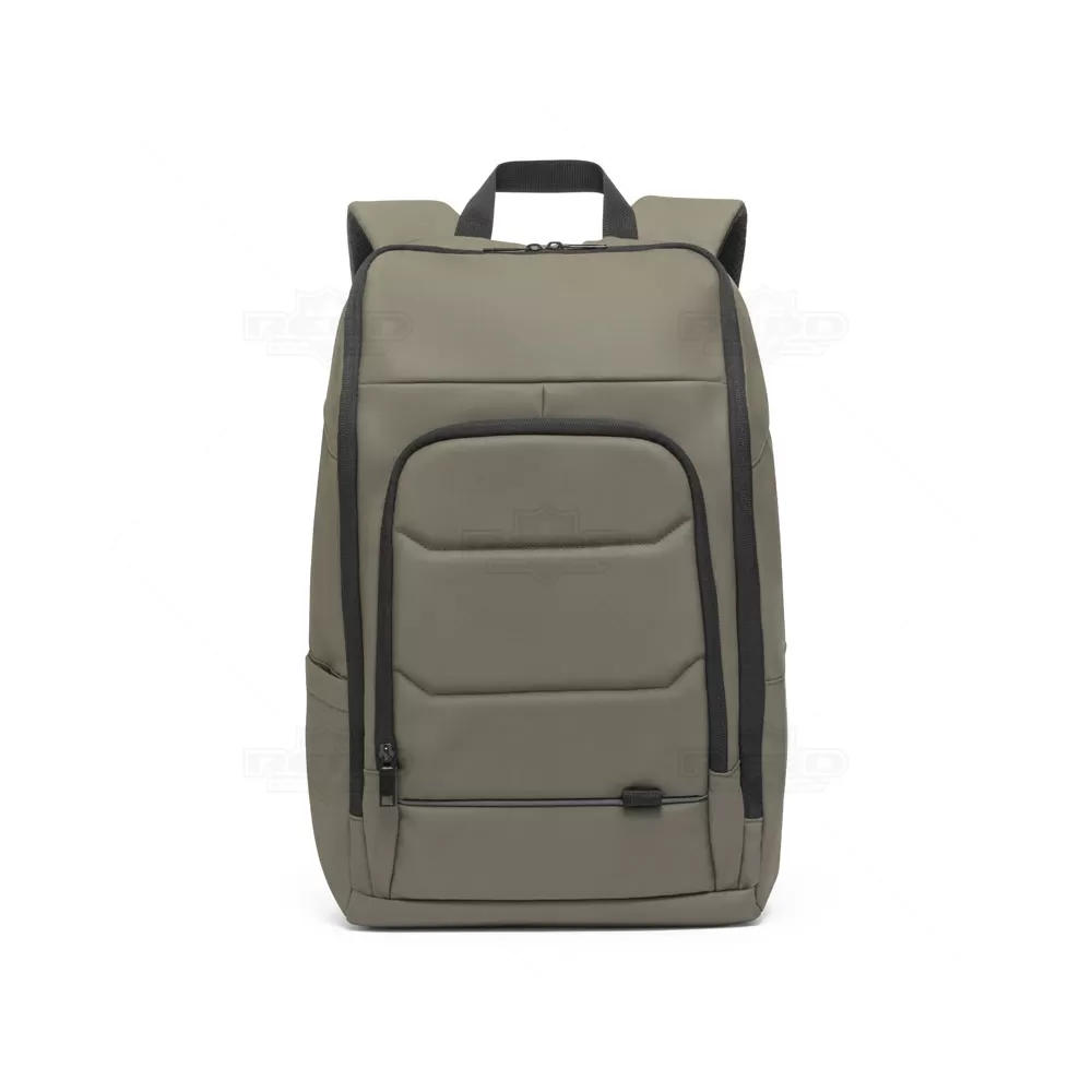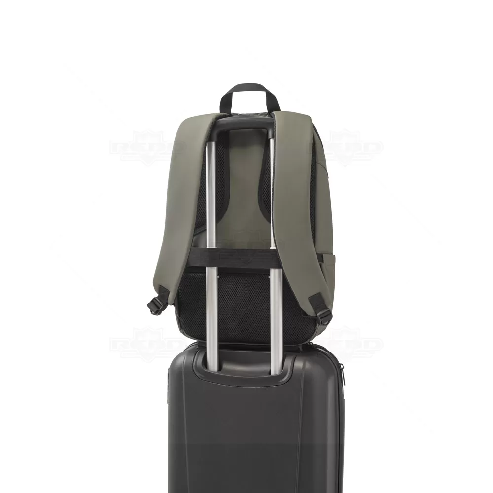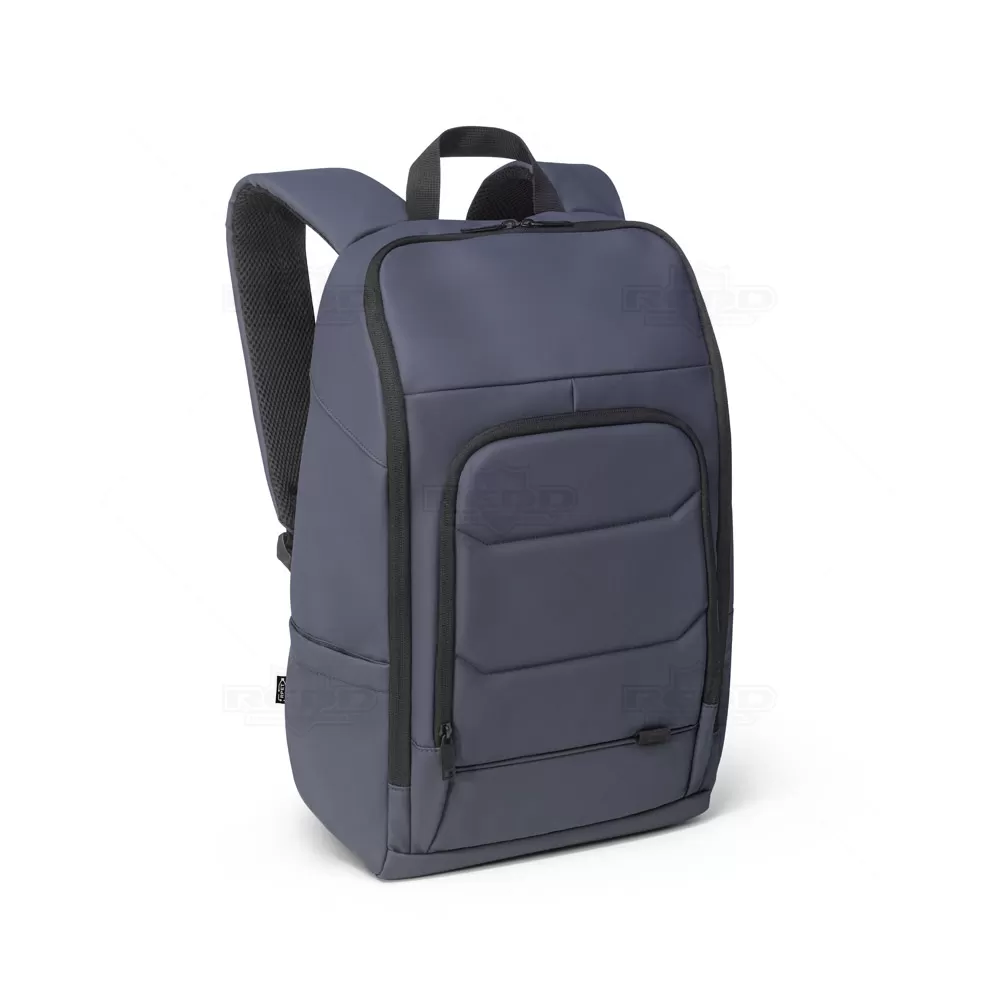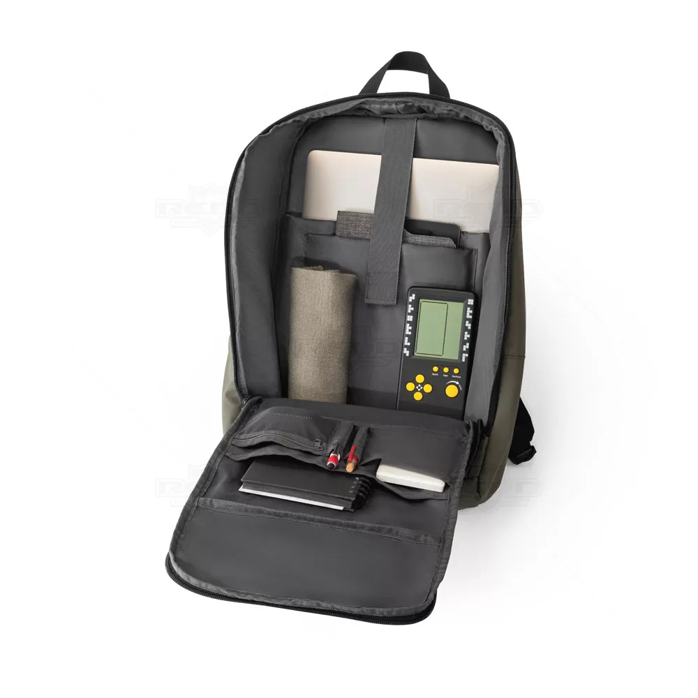 Esta mochila para notebook é confeccionada em poliéster reciclado (100% rPET) de alta densidade 600D, oferecendo durabilidade e sustentabilidade. O revestimento resistente à água e o forro em poliéster reciclado 210D garantem proteção adicional contra intempéries. O compartimento principal é espaçoso, contendo diversos bolsos e duas divisórias almofadadas, ideais para notebooks de 16" e tablets de 10", proporcionando organização e segurança para seus dispositivos. O bolso frontal com zíper inclui divisórias interiores para facilitar o acesso a itens menores. Um bolso lateral é perfeito para carregar seu squeeze. A parte posterior da mochila possui acolchoamento extra para maior conforto durante o uso e alça trolley, facilitando o transporte em viagens. A faixa refletora na frente da mochila aumenta a visibilidade em condições de baixa luminosidade. Com capacidade de 19 litros, esta mochila é ideal para profissionais e estudantes que procuram uma solução prática, confortável e ecológica para transportar seus equipamentos e acessórios.