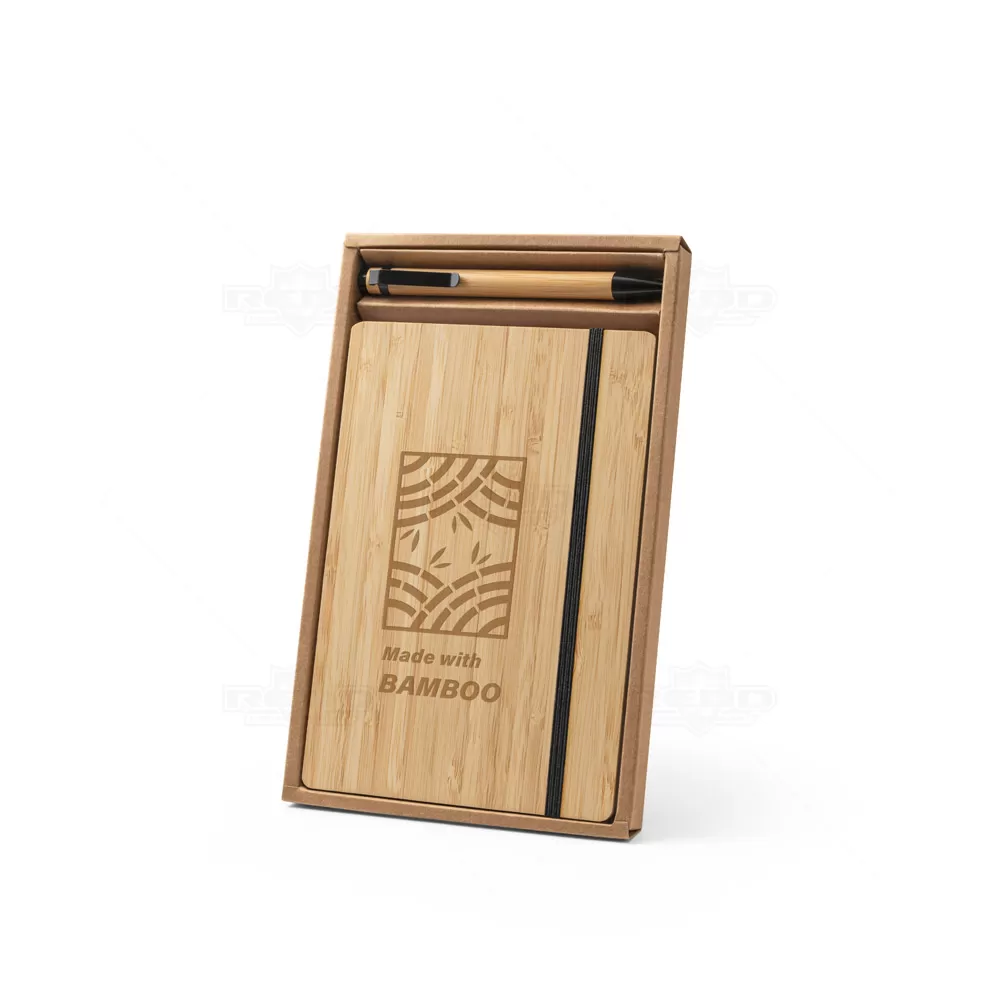 O conjunto de caderno e esferográfica em bambu é uma escolha elegante e sustentável para brindes personalizados ou eventos corporativos. O caderno possui capa e contracapa em placa de bambu, reforçando o apelo ecológico, enquanto a lombada é confeccionada em poliéster 100% reciclado (rPET). Com 96 folhas pautadas em papel reciclado, ele é ideal para anotações no dia a dia, em reuniões ou em atividades escolares. O suporte integrado mantém a esferográfica, também em bambu, sempre ao alcance, oferecendo praticidade. O fecho em elástico garante que o caderno permaneça bem organizado. A esferográfica oferece escrita suave em tinta preta, complementando a funcionalidade do conjunto. Fornecido em uma caixa presente de papel kraft reciclado, este produto destaca a sua marca com elegância e responsabilidade ambiental. É ideal para campanhas promocionais que valorizem a sustentabilidade e o uso de materiais naturais, com a possibilidade de variação na cor e impressão devido às características únicas dos materiais naturais.