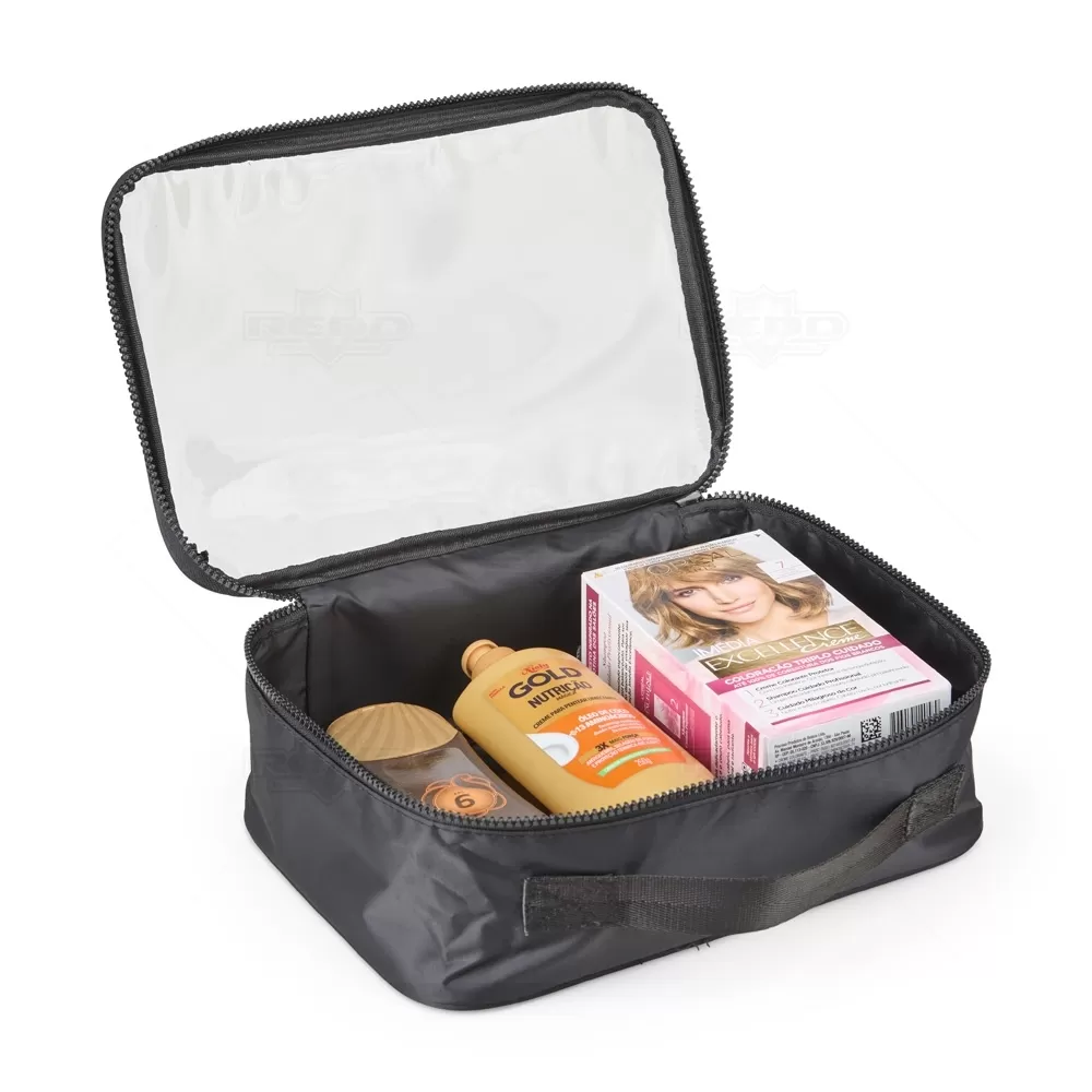 Necessaire personalizada, confeccionada em nylon oferecendo praticidade e estilo em um único item. Com frente transparente, permite fácil visualização dos itens internos, ideal para facilitar o acesso rápido aos produtos. O fechamento por zíper garante segurança, mantendo todos os itens bem protegidos. Além disso, possui uma alça superior, que facilita o transporte no dia a dia, e uma alça adicional em nylon, oferecendo mais opções de uso. Perfeito para brinde personalizado em eventos corporativos ou como presente em campanhas promocionais, essa necessaire combina funcionalidade e design moderno, sendo uma escolha versátil para diferentes públicos.