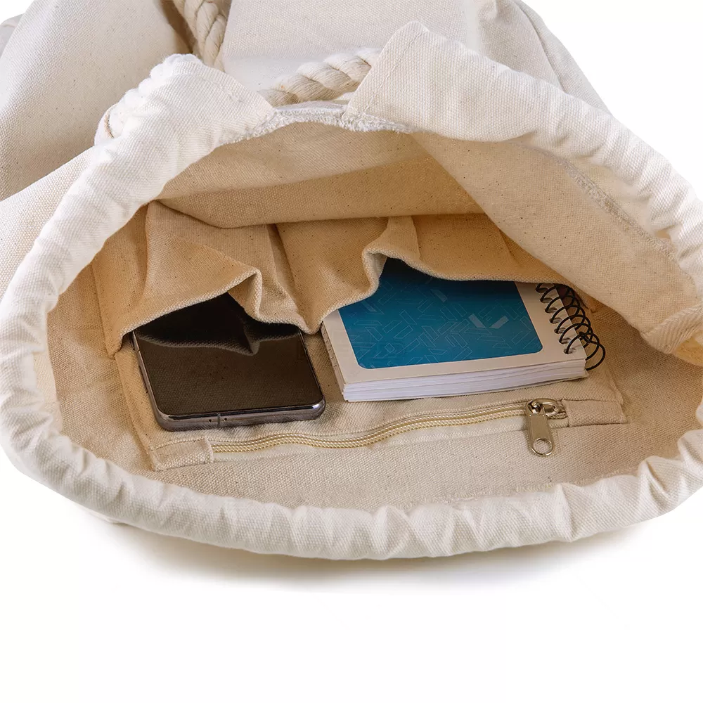 Mochila saco confeccionada em algodão cru de alta resistência, com gramatura de 450g/m², garantindo durabilidade e aspecto natural. Seu design versátil permite utilizá-la tanto como mochila quanto como bolsa de ombro, graças à alça trançada ajustável e à alça lateral de apoio. O fechamento é prático, feito por cordão trançado, que confere estilo rústico e ao mesmo tempo funcionalidade. O interior é bem organizado, com três compartimentos, sendo um deles com fechamento em zíper, ideal para guardar objetos de maior valor ou que necessitam de maior segurança. A ampla capacidade permite transportar cadernos, livros, celular e acessórios do dia a dia, tornando-a uma opção prática para passeios, rotina escolar ou atividades casuais. Além disso, o algodão cru proporciona excelente área para personalização, tornando o produto ainda mais atrativo em ações de marketing. Por essas características, é uma escolha perfeita como brinde sustentável e diferenciado para eventos, empresas ou campanhas promocionais.