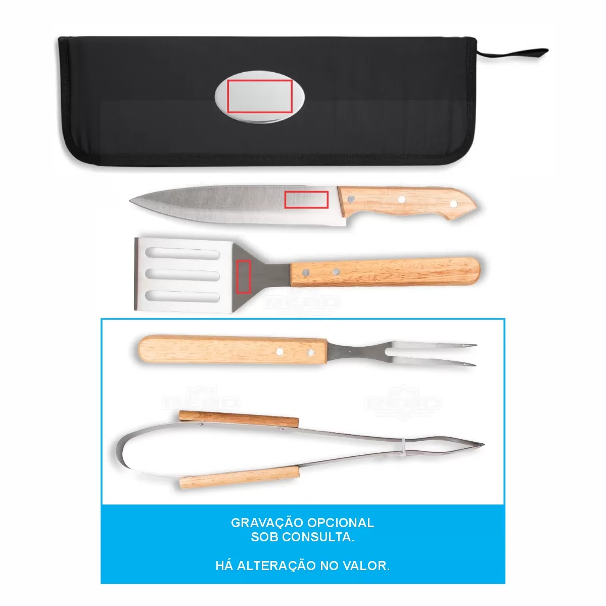 O kit churrasco com 4 peças acondicionadas em estojo de nylon é ideal para quem aprecia um churrasco bem preparado com praticidade e estilo. O conjunto inclui 01 pegador, 01 garfo, 01 faca e 01 espátula, todos com cabo de madeira, garantindo resistência e conforto na utilização. O estojo de nylon contém uma pequena alça para facilitar o transporte e uma parte interna com elástico, que organiza e mantém as peças seguras. A faca e o garfo possuem proteções plásticas, oferecendo mais segurança no armazenamento. A plaquinha para personalização torna o kit perfeito para brindes promocionais ou presentes personalizados, sendo uma excelente opção para eventos corporativos ou especiais. Compacto, funcional e elegante, é a escolha ideal para churrascos e momentos de lazer ao ar livre.