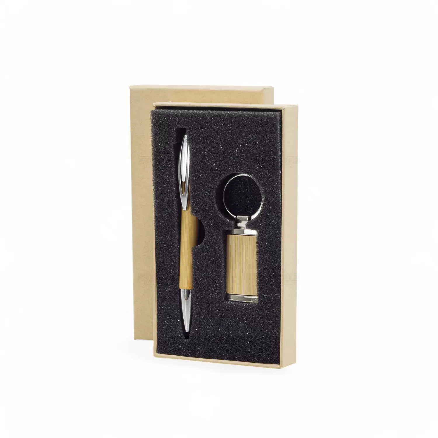 Este conjunto é a escolha ideal para quem valoriza praticidade e design natural. Composto por uma caneta de bambu com clipe metálico e carga esferográfica azul, além de um chaveiro em metal com frente de bambu e verso espelhado, ele combina funcionalidade e sofisticação. O estojo com espuma interna mantém os itens bem organizados e protegidos, garantindo fácil transporte e apresentação impecável. As peças aliam a durabilidade do metal à beleza orgânica do bambu, resultando em um visual elegante e resistente. Cada detalhe destaca o charme natural desse material sustentável, tornando o conjunto uma opção refinada para brindes personalizados ou presentes corporativos. Ideal para profissionais e empresas que apreciam qualidade e estilo, este kit tem praticidade, estética e responsabilidade ambiental em um único produto.