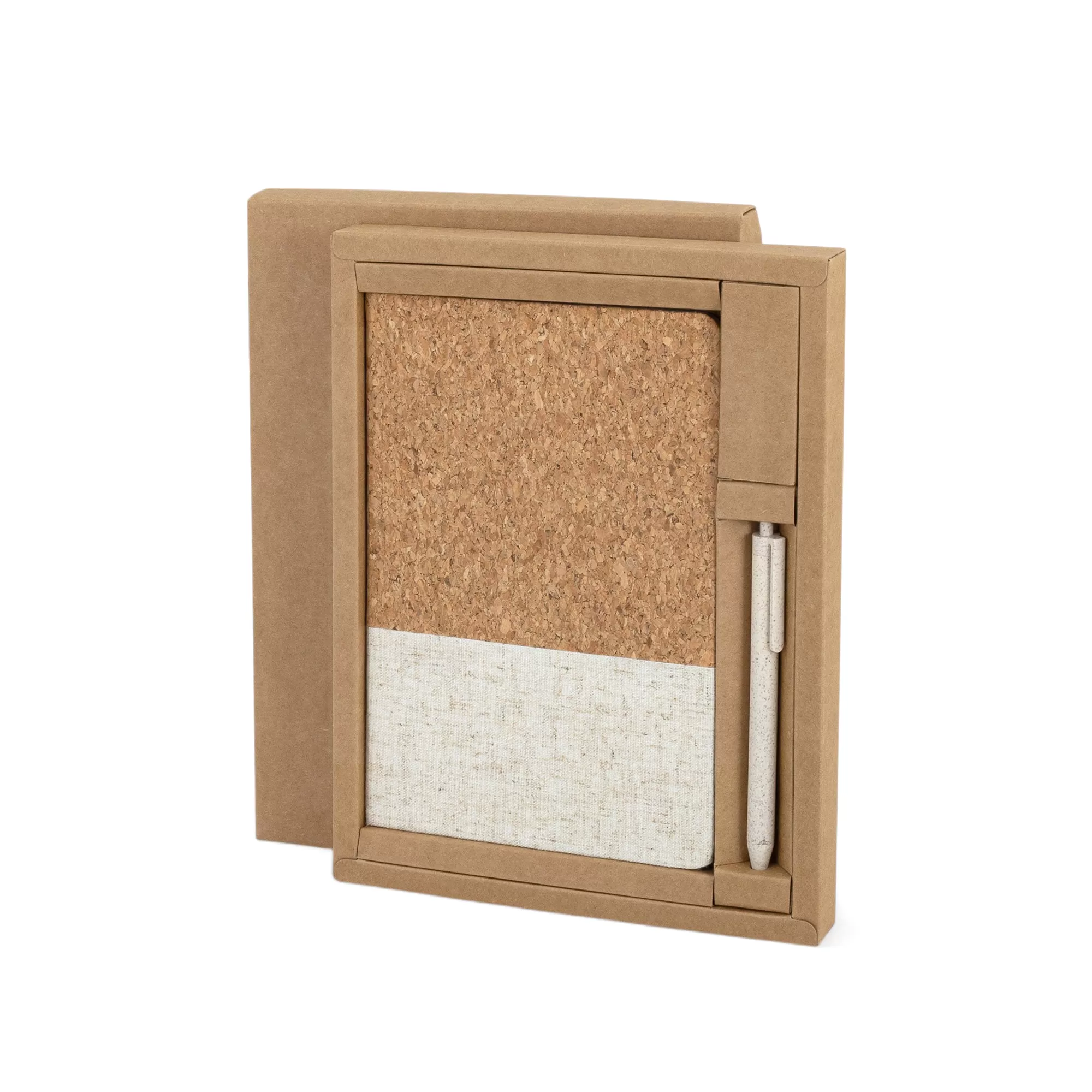 Kit prático e sustentável composto por caderno de anotações e caneta. A caneta é fabricada em plástico reciclado, alinhando funcionalidade e responsabilidade ambiental. O caderno de anotações possui capa dura feita de cortiça, com um elegante detalhe em algodão cru, garantindo durabilidade e um toque natural. Com 80 folhas pautadas, é ideal para anotações no dia a dia, seja no trabalho, nos estudos ou em momentos de inspiração. Uma escolha perfeita para quem valoriza estilo e sustentabilidade. Tamanho caderno 21x14,5x1,3 cm, tamanho caneta 14xø1 cm.