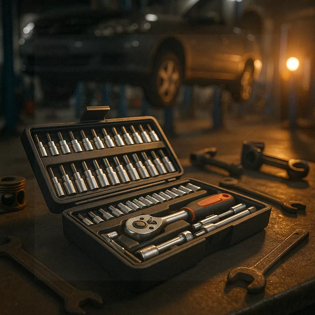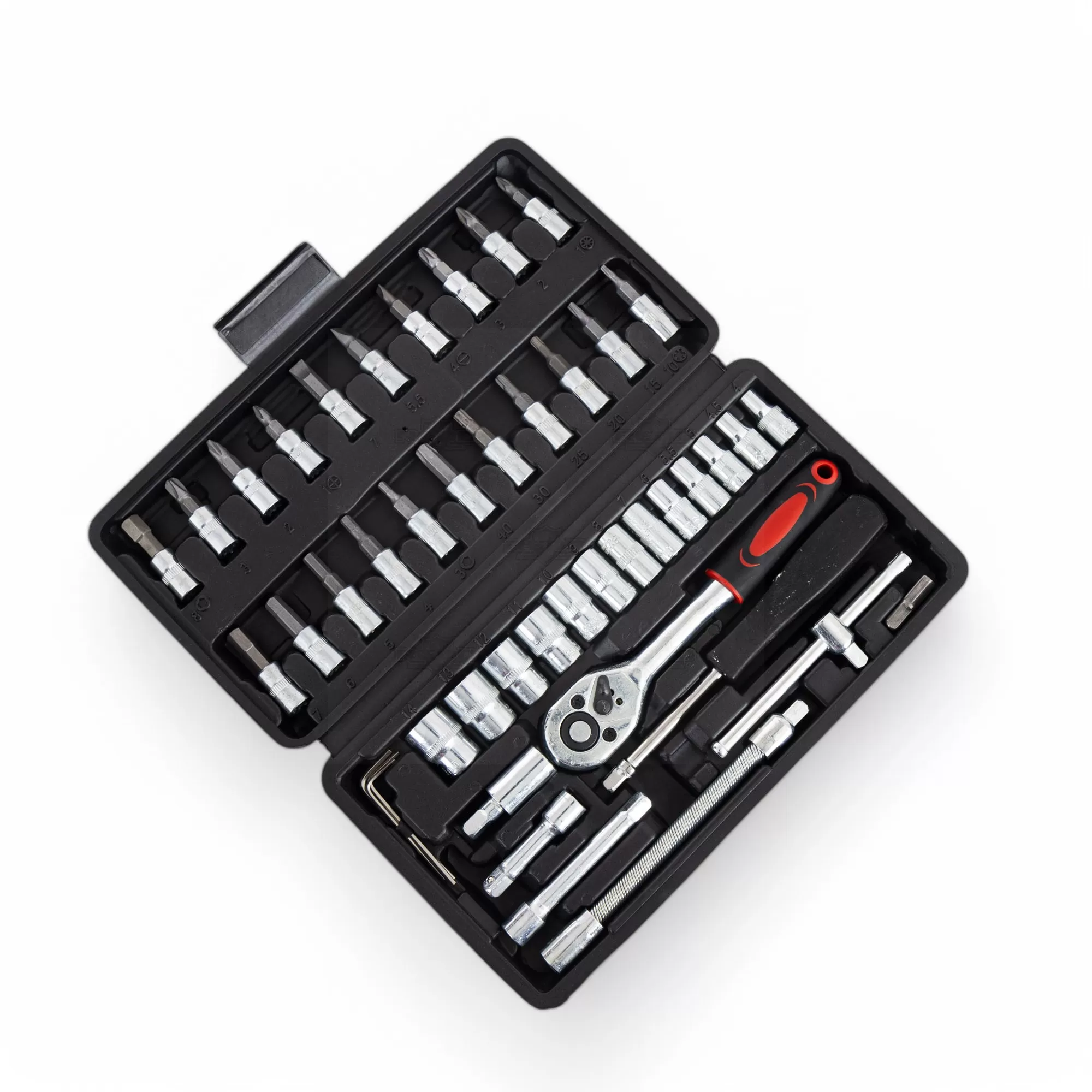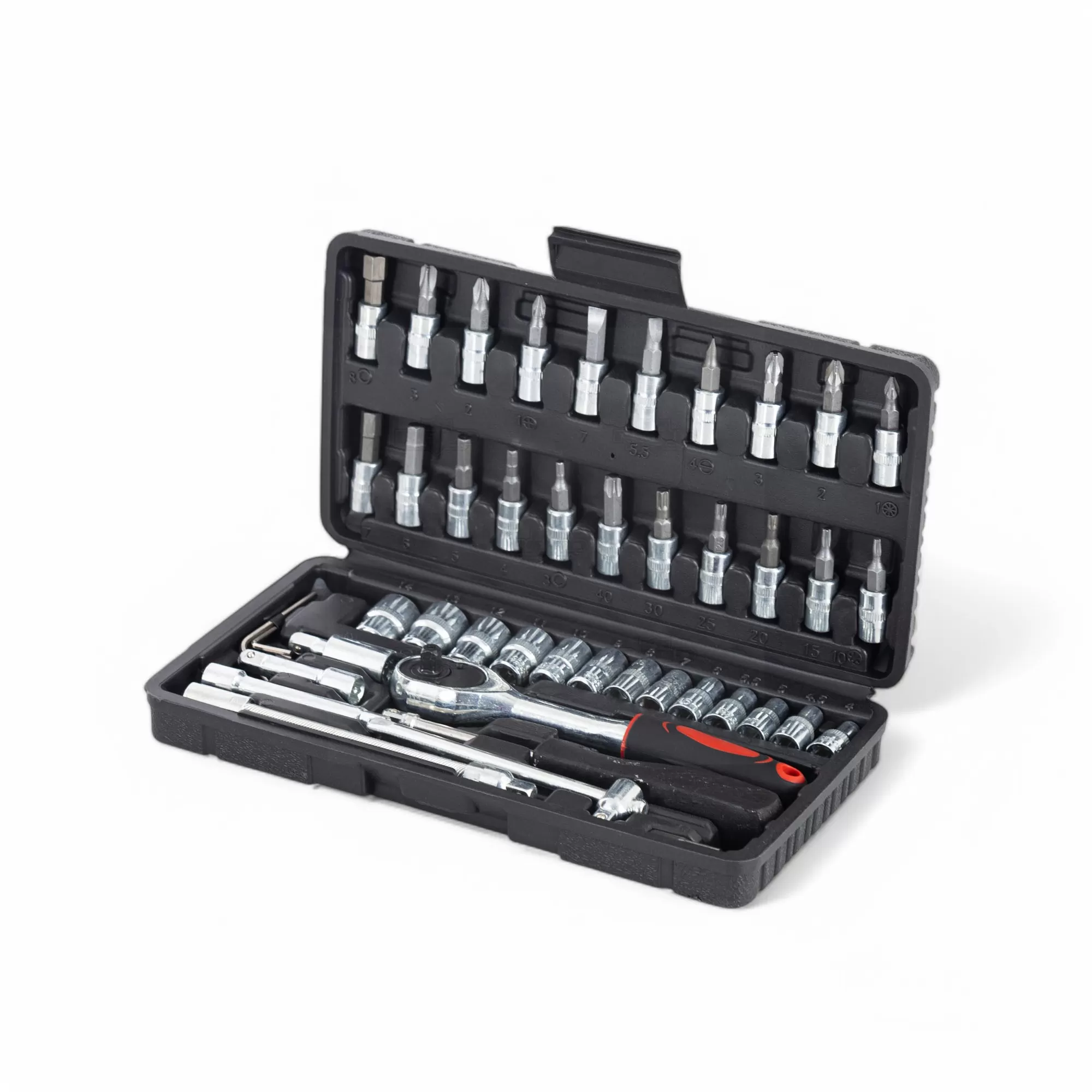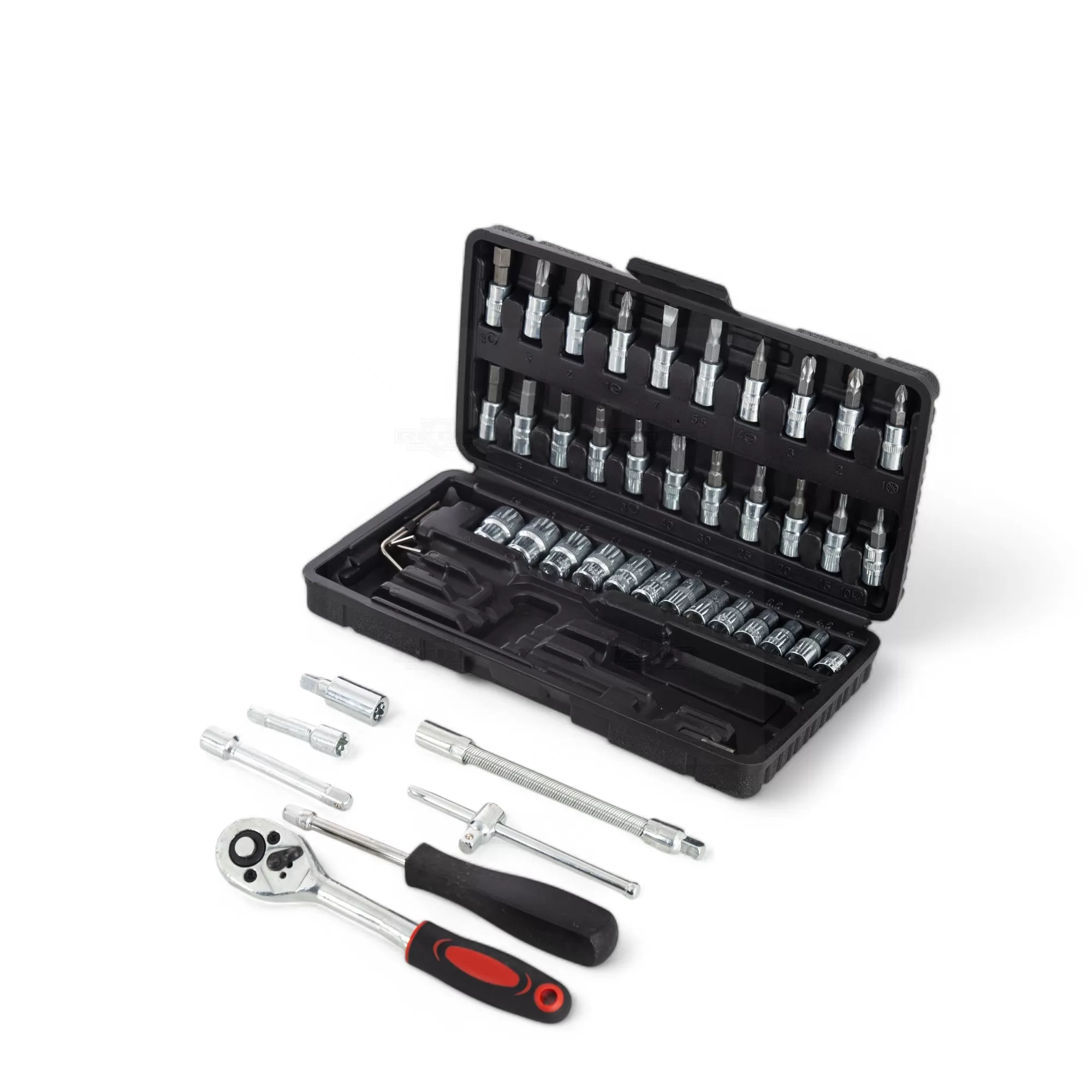 Este kit com 45 peças é a solução completa para diversas tarefas de manutenção, oferecendo versatilidade e organização. Inclui 1 chave catraca reversível, 13 soquetes, 21 soquetes com bits, 1 ponta Torx, 3 chaves hexagonais, 1 cabo fixo, 1 junta universal, 1 cabo de força em T, 1 adaptador de bits e 2 extensões flexíveis, cobrindo uma ampla gama de aplicações. As peças são armazenadas em uma maleta de plástico resistente, que facilita o transporte e mantém tudo organizado, ideal para profissionais e entusiastas de DIY. Perfeito para brindes promocionais, eventos corporativos ou presentes personalizados, este kit combina funcionalidade e durabilidade, atendendo tanto a mecânicos quanto a quem precisa de ferramentas confiáveis em casa ou no trabalho. Sua variedade de acessórios garante eficiência em qualquer projeto. Imagem ilustrativa.