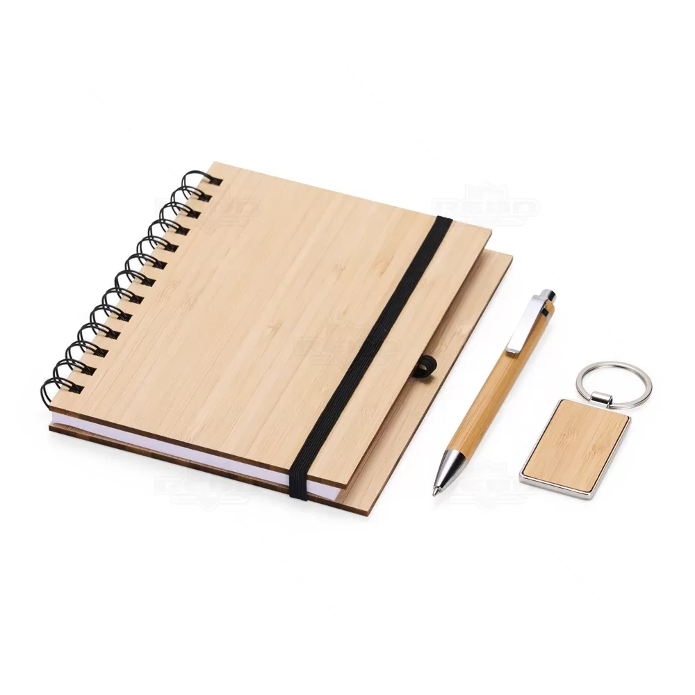 Este conjunto ecológico é composto por três peças funcionais e elegantes, todas com acabamento em bambu, destacando um apelo sustentável e moderno. A caderneta possui capa dura em bambu e cerca de 70 folhas brancas pautadas, oferecendo espaço ideal para anotações, planejamentos ou registros diários. A caneta que acompanha o kit também é feita em bambu, com clipe metálico que confere um toque refinado ao design e facilita o transporte em bolsos ou pastas. Complementando o conjunto, o chaveiro com detalhe em metal mantém a identidade visual uniforme e transmite sofisticação. A composição harmoniosa dos itens faz deste kit uma escolha prática para o uso cotidiano no ambiente corporativo, acadêmico ou pessoal. Por seu visual atrativo e materiais diferenciados, é especialmente indicado como brinde promocional em eventos, feiras e ações institucionais, valorizando a marca com uma lembrança funcional e alinhada às tendências de sustentabilidade e responsabilidade ambiental.