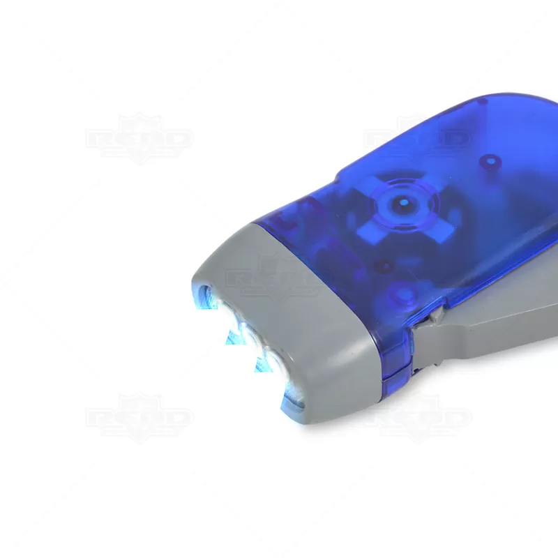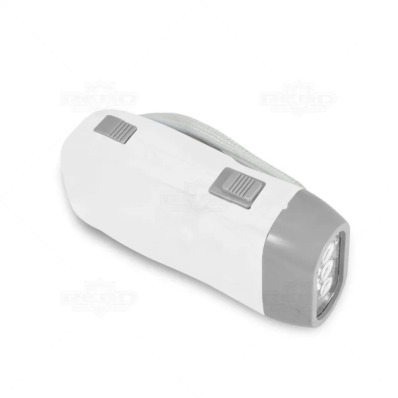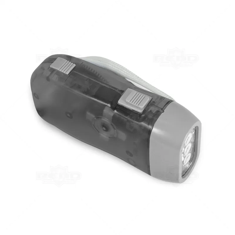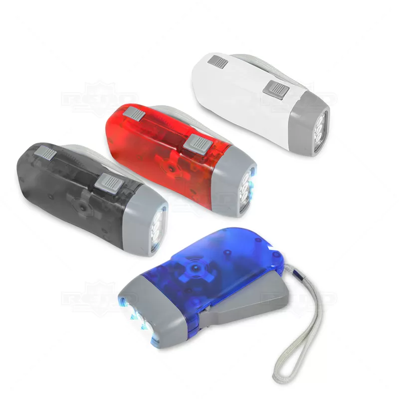 Lanterna plástica personalizada com iluminação em 3 leds, possui sistema auto recarregável quando pressionado o acionador repetidamente gera energia própria para alimentar a lanterna através do sistema Dínamo. Possui botão ligar/desliga, travar do acionado e alça em nylon. Ideal para divulgar sua empresa em eventos corporativos, brindes personalizados e campanhas promocionais.