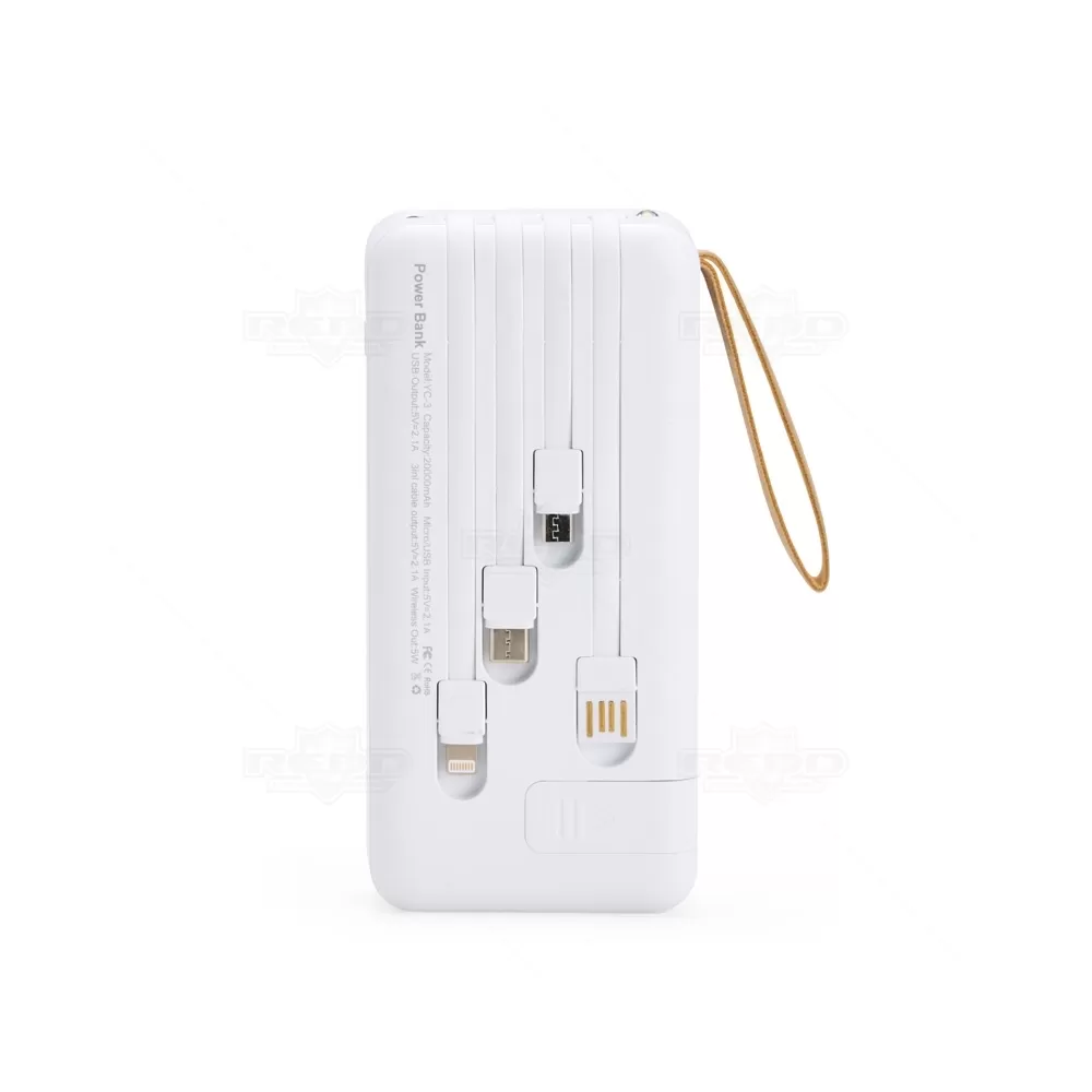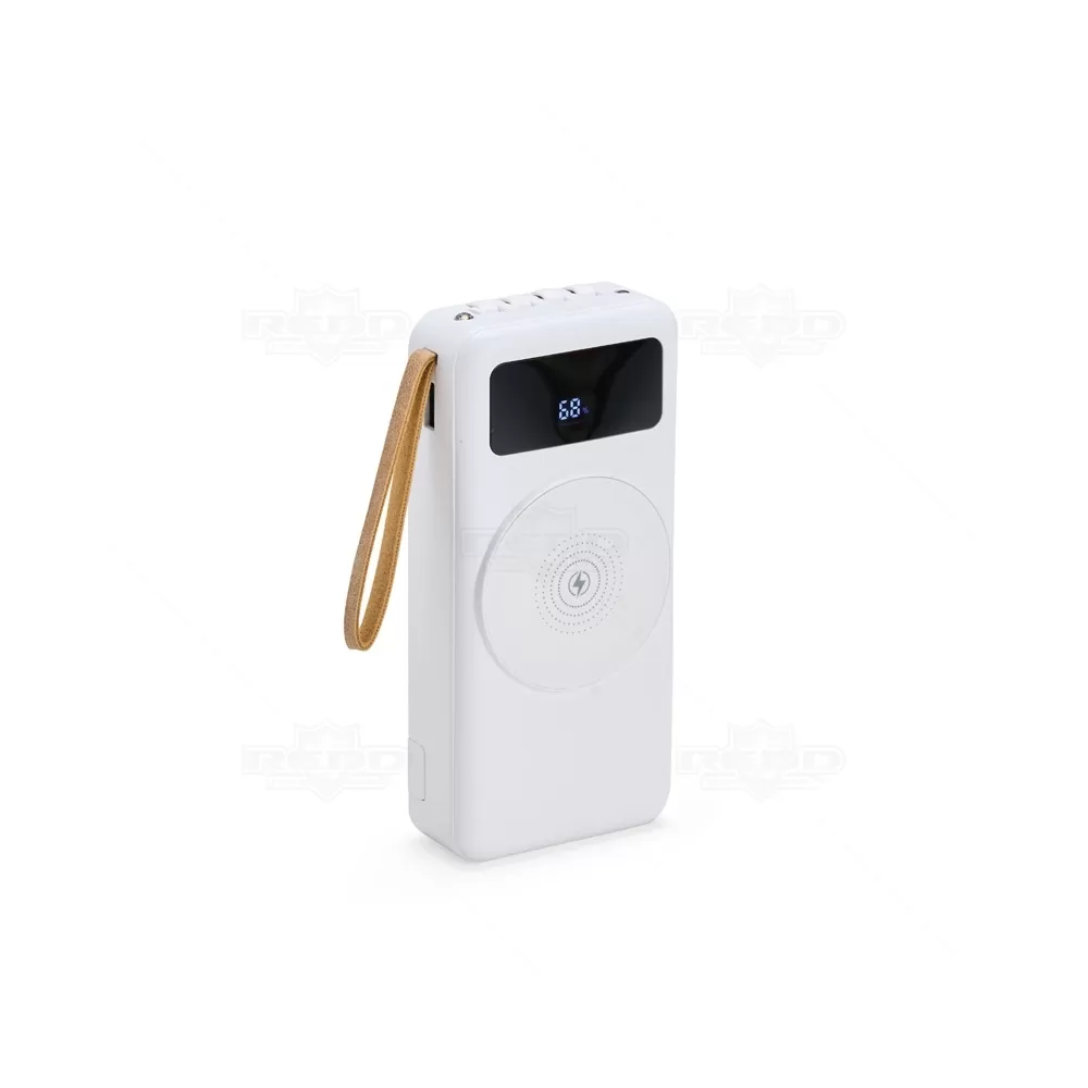Com capacidade de 20.000mAh, este power bank é uma solução completa e moderna para manter seus dispositivos carregados a qualquer momento. Fabricado em plástico resistente, possui painel LED que exibe a porcentagem de carga disponível, facilitando o controle do uso. Conta com quatro cabos acoplados: USB-C, Micro USB, Lightning e USB padrão, além de saídas adicionais USB-C, Micro USB e USB convencional, garantindo compatibilidade com uma ampla gama de aparelhos. O diferencial está no espaço reservado para carregamento por indução, que permite recarregar smartphones compatíveis de forma prática e sem uso de fios. Inclui ainda um suporte lateral para apoio do celular e uma alça em couro sintético, que facilita o transporte. Compacto e funcional, é ideal para viagens, eventos ou uso diário. Pela versatilidade e alto desempenho, é uma excelente opção de brinde personalizado para campanhas promocionais, ações corporativas ou eventos ligados à tecnologia e inovação.