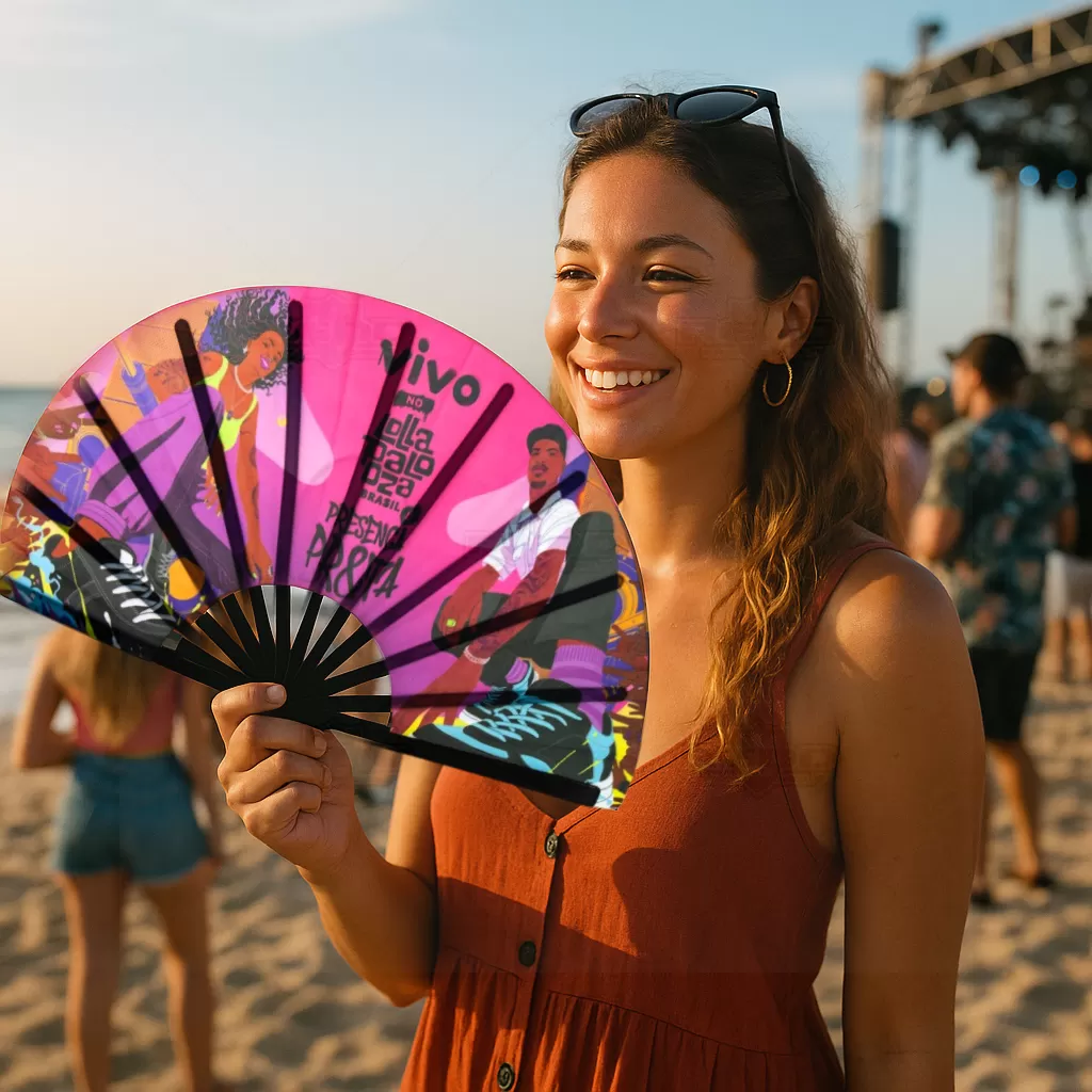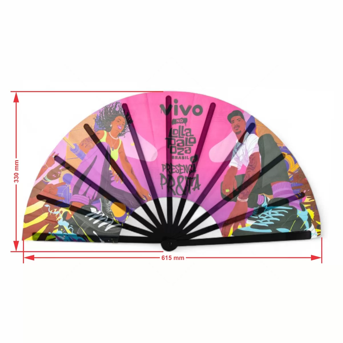 Confeccionado com tecido sublimado de alta qualidade, este leque combina leveza, durabilidade e excelente acabamento visual. As hastes são produzidas em poliestireno injetado, um tipo de plástico reconhecido por sua alta resistência e rigidez, garantindo estrutura firme e longa vida útil ao produto. O tecido permite impressões personalizadas em alta definição, resultando em cores vivas e detalhes precisos que destacam qualquer identidade visual. O sistema de abertura é suave e funcional, facilitando o uso contínuo em ambientes externos ou internos. Ideal para ações promocionais em eventos ao ar livre, festas temáticas, shows, feiras ou campanhas sazonais, o leque é um item versátil que se adapta a diferentes públicos e contextos. Além de útil em dias quentes, é uma excelente opção de brinde personalizado, permitindo que marcas se comuniquem de forma criativa e marcante, associando-se ao conforto, praticidade e ao apelo estético do produto.