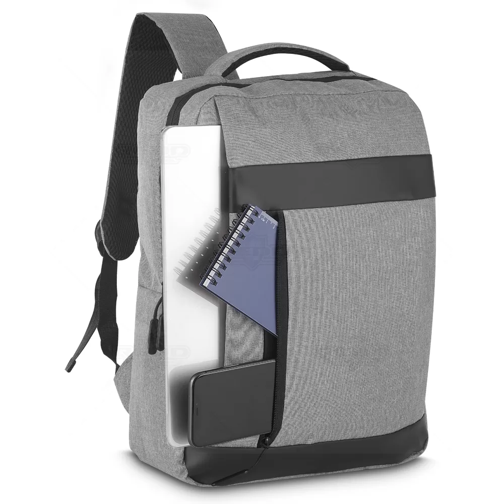 Mochila para Notebook em tecido poliéster 600D oferece resistência, praticidade e segurança para o dia a dia. Conta com dois bolsos frontais com fechamento em zíper, ideais para itens de acesso rápido, além de alça de mão reforçada e alças de ombro ajustáveis e acolchoadas que garantem maior conforto no transporte. Seu grande diferencial é o conector USB na lateral, que permite carregar dispositivos de forma prática utilizando um power bank (não incluso). O compartimento interno é espaçoso e possui divisória acolchoada para notebooks de até 15,6 polegadas, além de espaço para documentos e outros itens pessoais. O acabamento em detalhes emborrachados confere um visual elegante e profissional. Por sua versatilidade e design contemporâneo, é uma excelente escolha como brinde personalizado para eventos corporativos, ações promocionais ou campanhas institucionais, oferecendo um presente útil, sofisticado e de alto valor percebido para clientes e colaboradores.