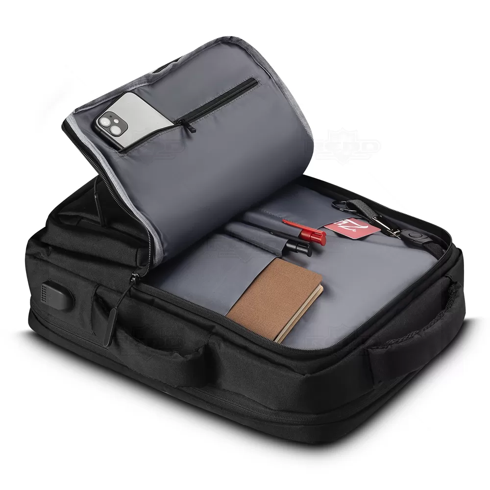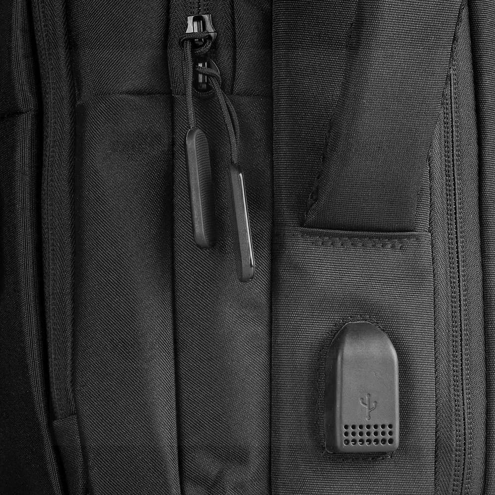 Produzida em resistente poliéster 600D, esta mochila combina praticidade e elegância para o dia a dia profissional ou acadêmico. Conta com alças de ombro ajustáveis e acolchoadas, além de alça de mão reforçada, proporcionando conforto durante o transporte. Seu design funcional inclui dois bolsos frontais com zíper e divisórias internas bem distribuídas, ideais para organizar acessórios, documentos e objetos pessoais. O compartimento principal é espaçoso e comporta notebooks de 15 polegadas com segurança. Para maior comodidade em viagens, a mochila possui alça trolley para encaixe em malas de rodinhas. Outro destaque é a porta USB lateral, que permite conectar um power bank (não acompanha) interno e carregar dispositivos eletrônicos com praticidade. Versátil e discreta, adapta-se a diferentes ambientes e perfis de uso. Sua estrutura organizada e os recursos modernos tornam este modelo uma excelente opção de brinde personalizado para ações promocionais, eventos corporativos e campanhas de relacionamento com clientes e colaboradores.