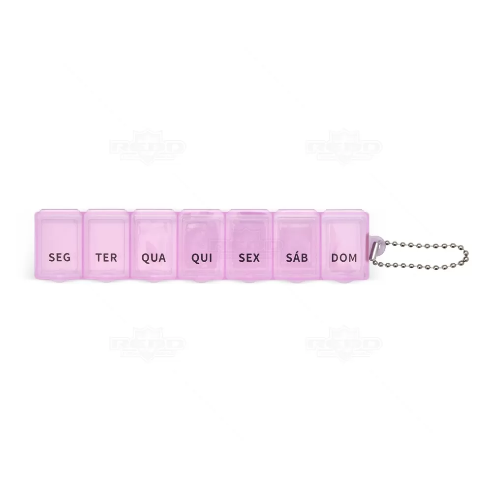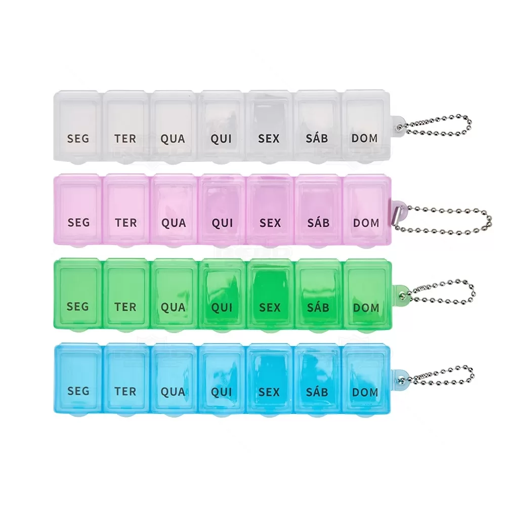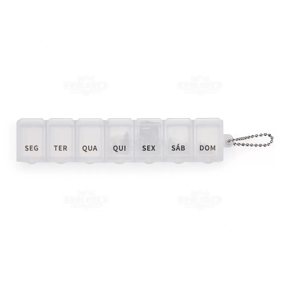 Este porta-comprimidos é produzido em plástico resistente e oferece praticidade para a organização semanal de medicamentos. Conta com sete divisórias individuais, cada uma identificada com a abreviação de um dia da semana, facilitando o controle e evitando esquecimentos na rotina de uso. Cada compartimento possui capacidade de 10 ml e tampa de fácil abertura, permitindo armazenar comprimidos, cápsulas ou vitaminas com segurança. Um diferencial funcional é a corrente de bolinhas que acompanha o produto, permitindo que ele seja preso a chaveiros, bolsas ou alças, tornando-o ideal para uso em casa, no trabalho ou durante viagens. Compacto e leve, pode ser transportado com facilidade, atendendo a públicos de todas as idades. Disponível em diversas cores, é uma excelente opção de brinde personalizado para campanhas de saúde, ações de conscientização, eventos corporativos ou feiras voltadas ao bem-estar, com ampla área para aplicação de logotipo e alta utilidade no dia a dia.