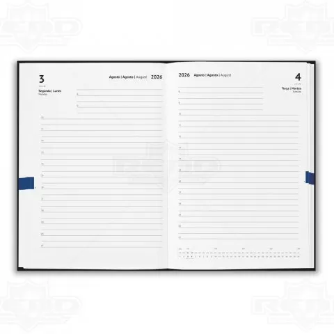 Com capa em PU texturizado e acabamento sofisticado, esta agenda no formato A5 combina funcionalidade e estilo. Seu design moderno inclui dois bolsos externos diagonais ideais para armazenar cartões, papéis ou anotações rápidas. Internamente, oferece organização diária, com cada página dedicada a um dia do ano, permitindo o planejamento detalhado de compromissos e tarefas. Conta ainda com marcador em fita que facilita o acesso rápido à data atual. As bordas arredondadas e a encadernação resistente contribuem para maior durabilidade no uso cotidiano. Por sua aparência elegante e praticidade, é indicada para profissionais, estudantes e gestores que valorizam organização no dia a dia. Sua capa pode ser personalizada, tornando-se uma excelente escolha como brinde corporativo em eventos, ações promocionais ou programas de fidelização. Um item útil e versátil que reforça a identidade da marca com sofisticação.