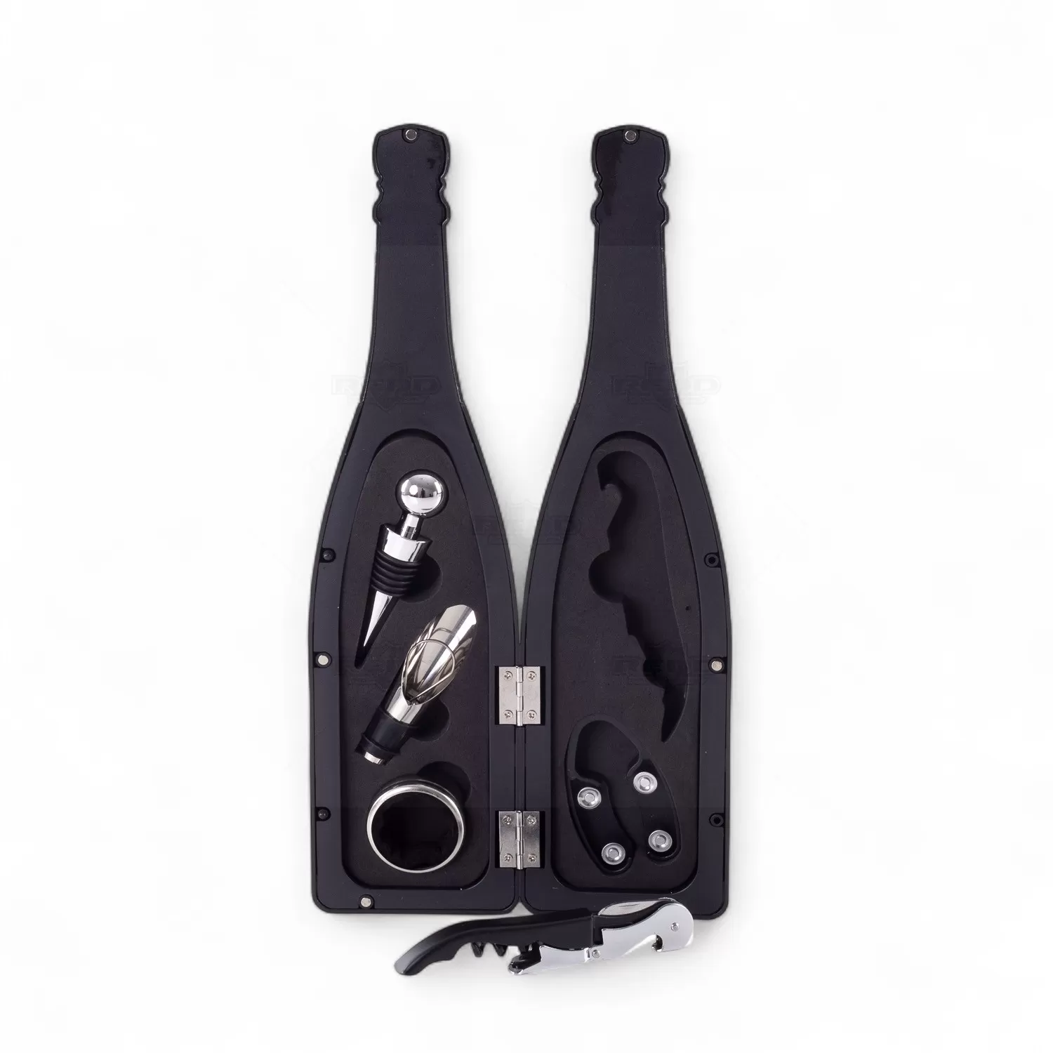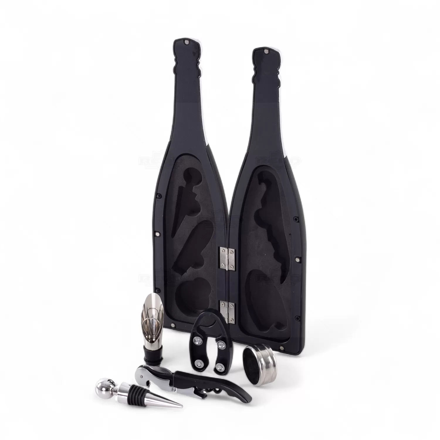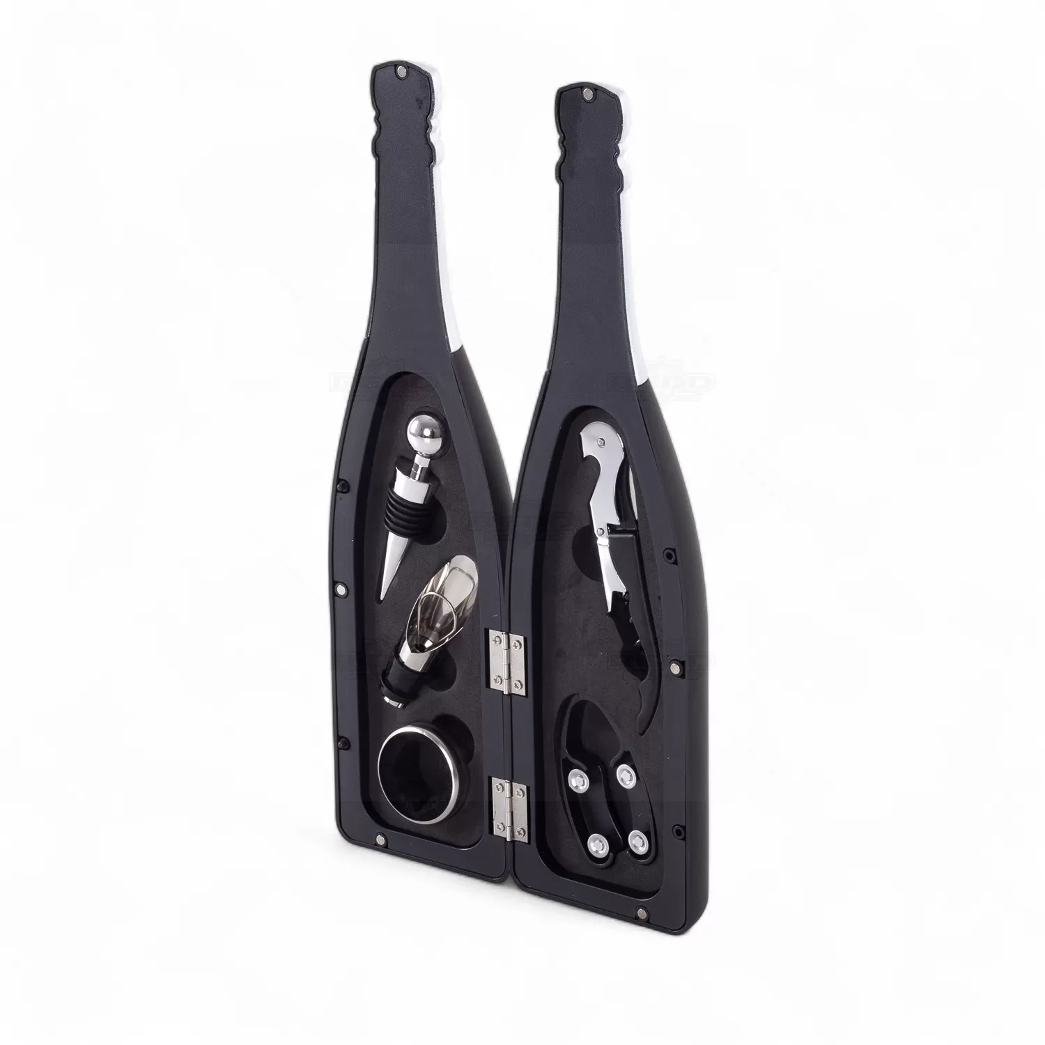 Kit vinho composto por cinco peças, apresentado em um elegante estojo no formato de garrafa, ideal para unir sofisticação e praticidade. O fechamento imantado garante segurança e facilidade no manuseio, enquanto o interior em espuma moldada mantém os acessórios organizados e bem protegidos. O conjunto inclui tampa de bico, bico condutor com tampa para servir sem desperdícios, saca-rolhas metálico 3 em 1 com lâmina de corte e abridor de garrafas, além de um wine collar e cortador de lacre, itens indispensáveis para apreciadores de vinho. Compacto e funcional, o kit é perfeito para ser utilizado em jantares, encontros sociais ou momentos especiais, agregando um toque profissional ao ritual de servir. Sua apresentação diferenciada faz dele uma excelente escolha de presente, além de se destacar como brinde promocional sofisticado para eventos corporativos, ações de relacionamento e campanhas voltadas a clientes e parceiros estratégicos.