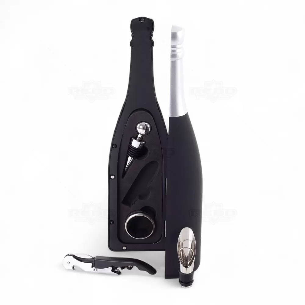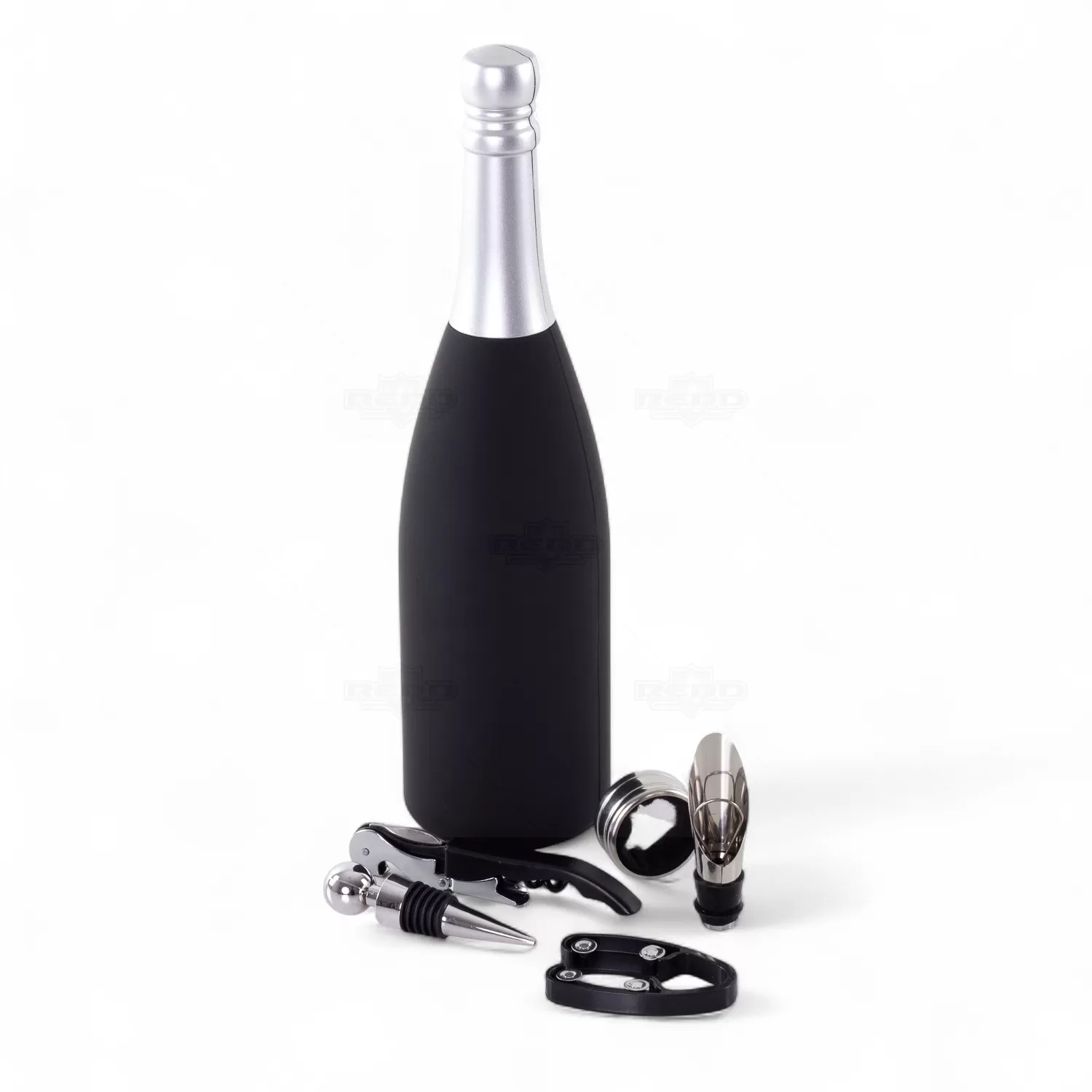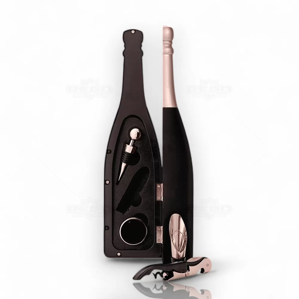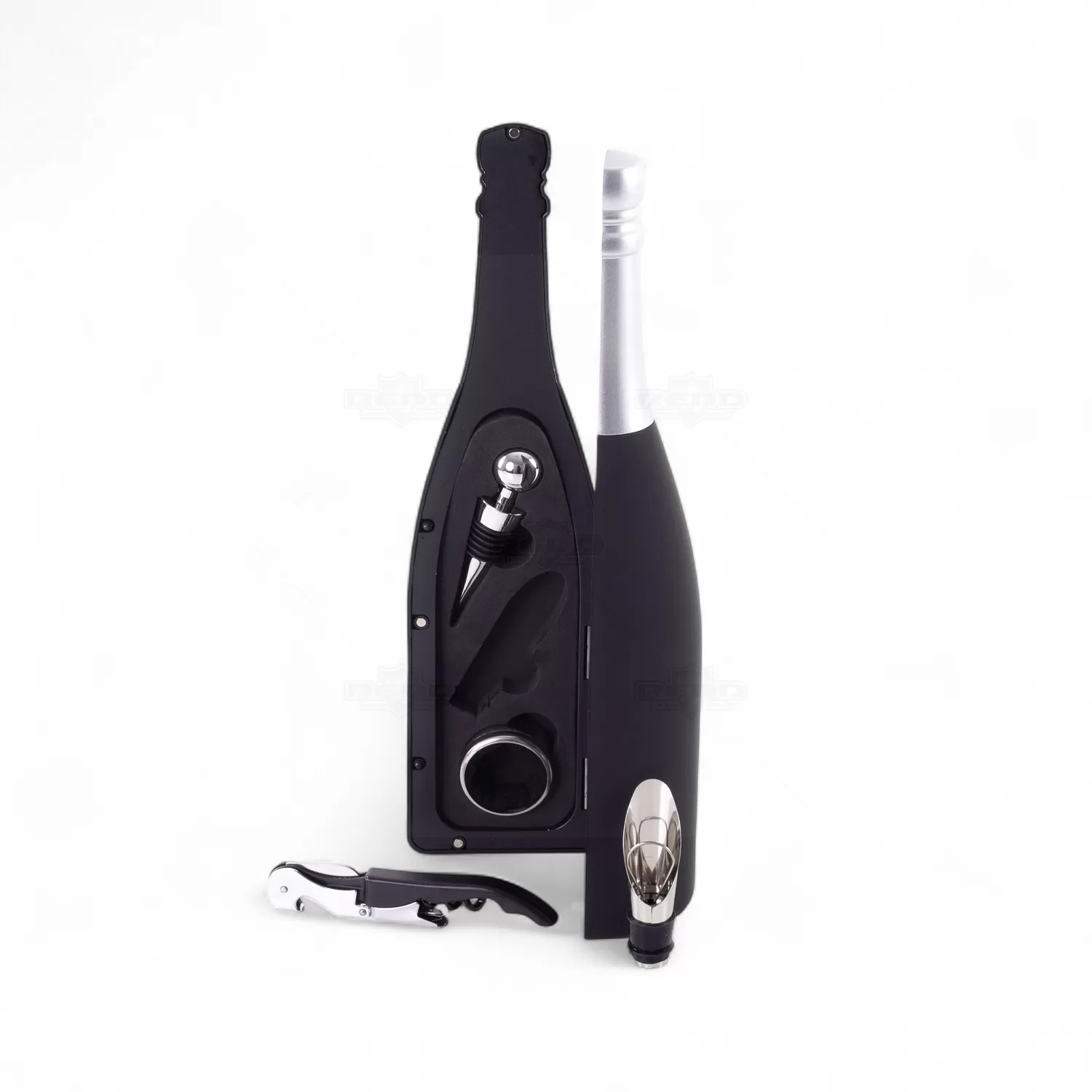 Kit vinho composto por cinco peças, apresentado em um elegante estojo no formato de garrafa, ideal para unir sofisticação e praticidade. O fechamento imantado garante segurança e facilidade no manuseio, enquanto o interior em espuma moldada mantém os acessórios organizados e bem protegidos. O conjunto inclui tampa de bico, bico condutor com tampa para servir sem desperdícios, saca-rolhas metálico 3 em 1 com lâmina de corte e abridor de garrafas, além de um wine collar e cortador de lacre, itens indispensáveis para apreciadores de vinho. Compacto e funcional, o kit é perfeito para ser utilizado em jantares, encontros sociais ou momentos especiais, agregando um toque profissional ao ritual de servir. Sua apresentação diferenciada faz dele uma excelente escolha de presente, além de se destacar como brinde promocional sofisticado para eventos corporativos, ações de relacionamento e campanhas voltadas a clientes e parceiros estratégicos.