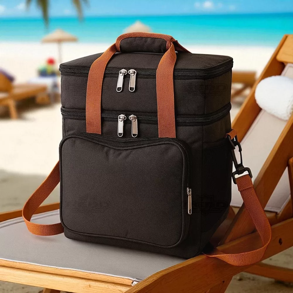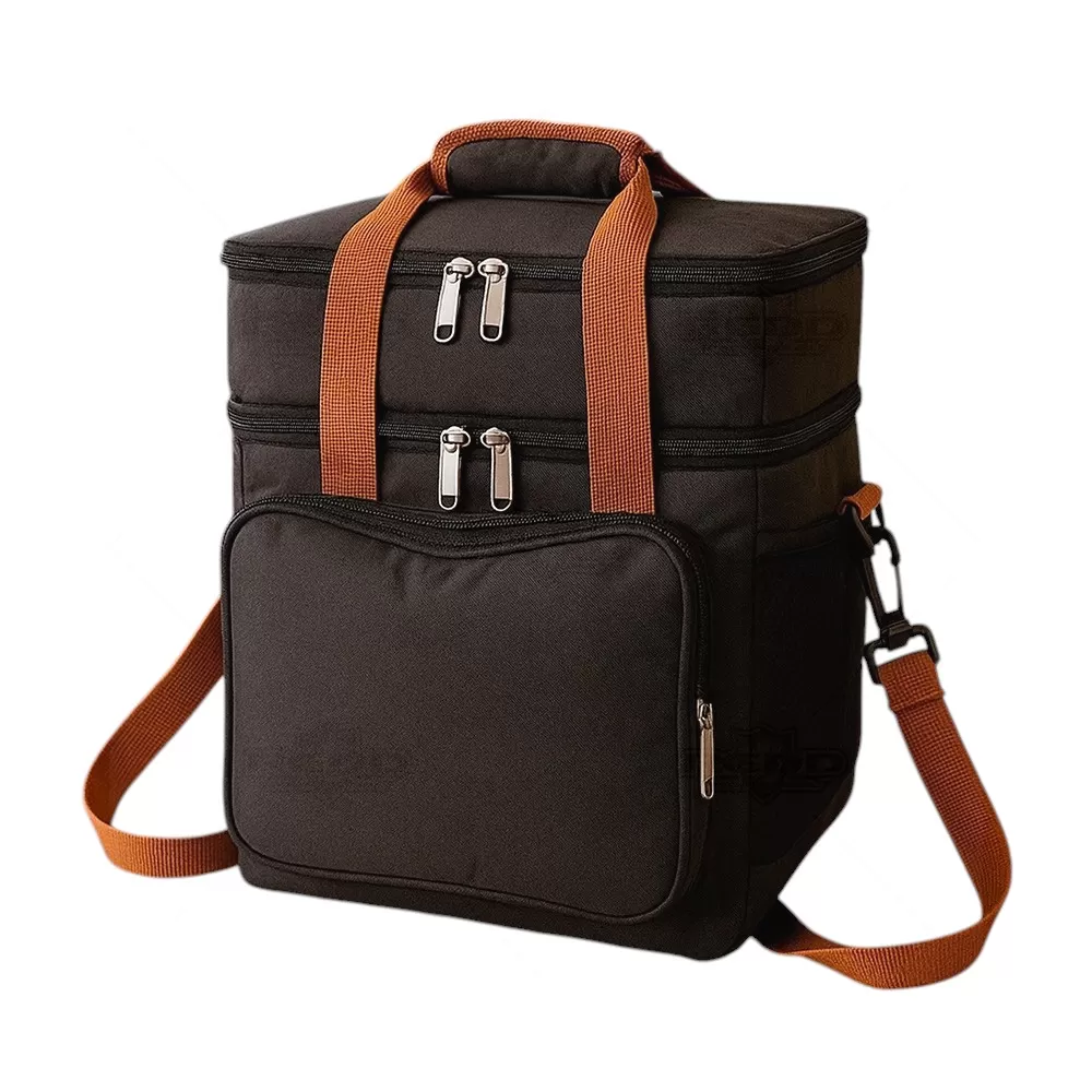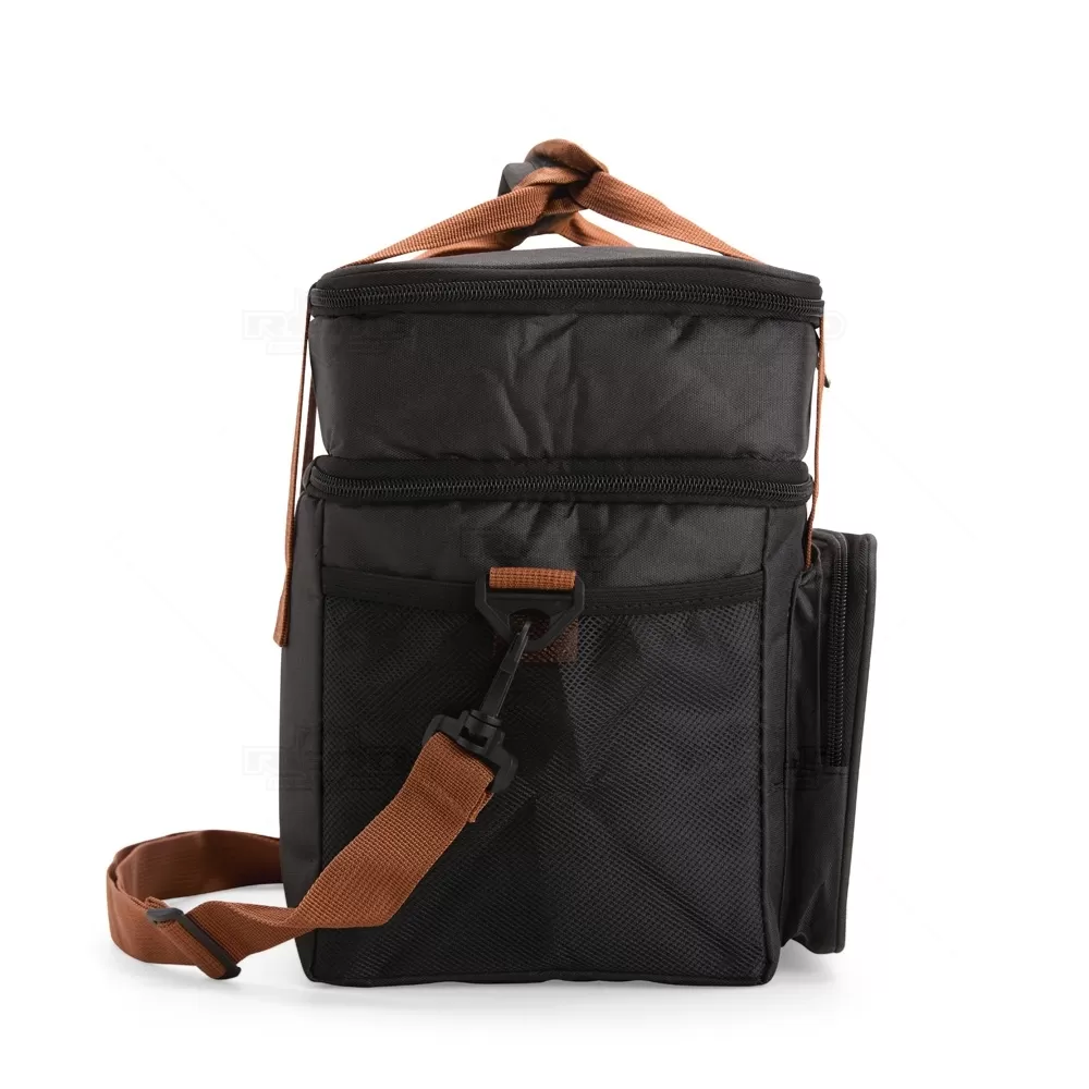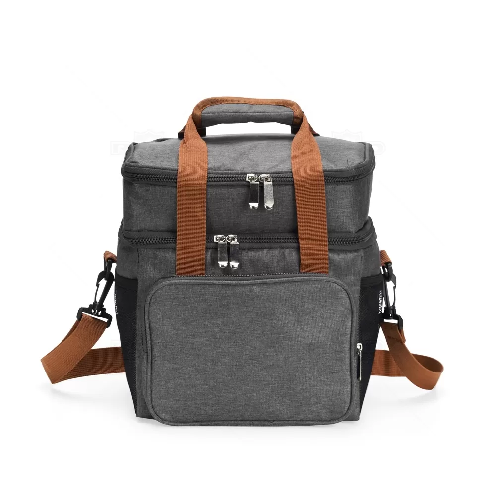 A bolsa térmica dupla em poliéster 300D combina resistência, praticidade e design moderno, sendo ideal para diferentes ocasiões. Com capacidade total de 12 litros, dispõe de dois compartimentos independentes: o inferior, revestido em PEVA, comporta até 9 litros, garantindo a conservação de alimentos e bebidas; já o superior, com revestimento em alumínio, possui capacidade de 3 litros, perfeito para separar itens menores ou mais delicados. Além disso, conta com bolso frontal para acessórios, bolsos laterais em tela e alças de mão com suporte de juntura, oferecendo maior conforto no transporte. A alça transversal é regulável e removível, proporcionando versatilidade no uso. Seu formato funcional e compacto facilita a organização e o transporte em viagens, piqueniques, praia ou trabalho. Por sua área ampla de personalização e utilidade prática, é também uma excelente escolha como brinde promocional, agregando valor à marca em ações corporativas e eventos especiais.