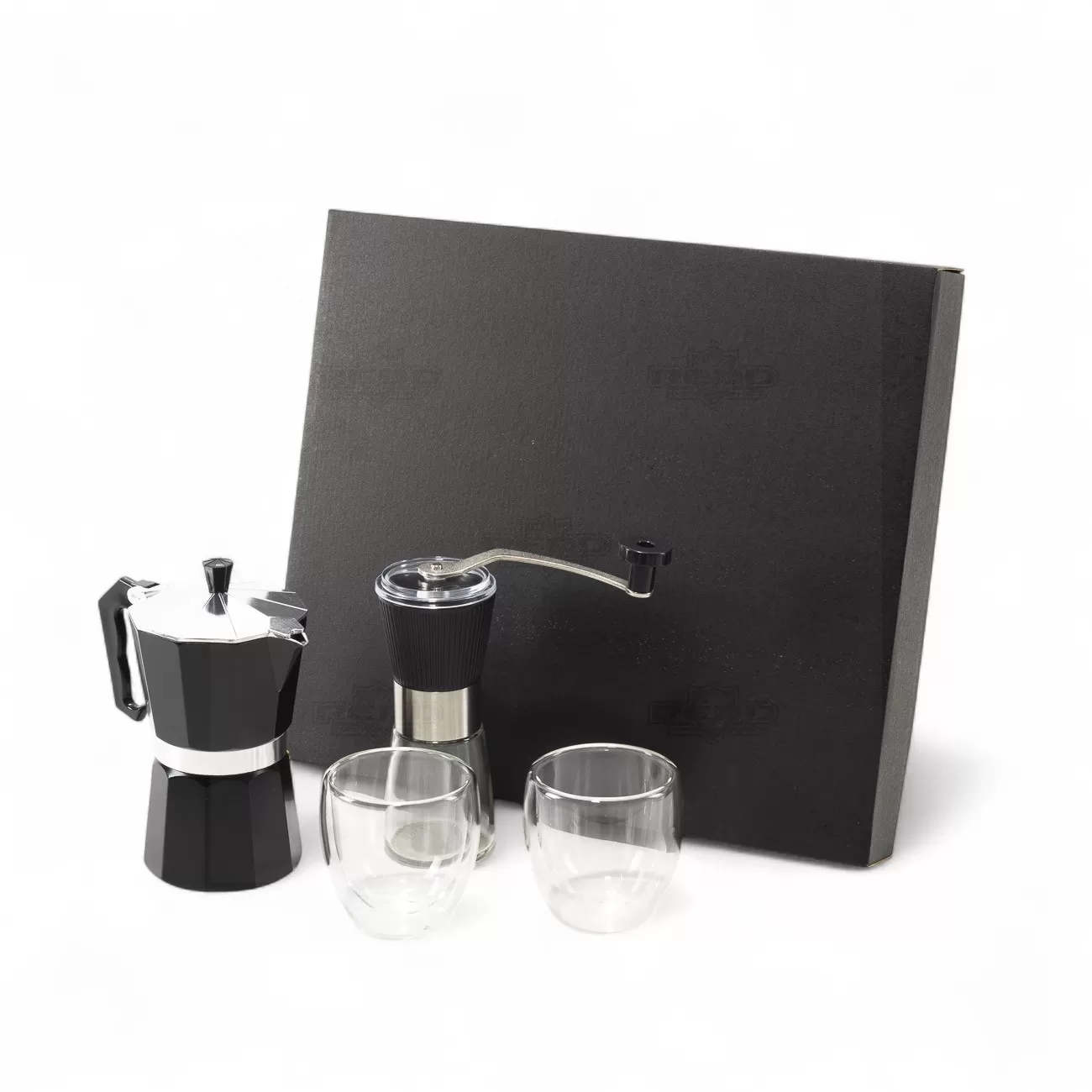 Este sofisticado kit para café é composto por uma cafeteira modelo italiana em alumínio, um moedor manual para café confeccionado em vidro e inox, além de dois copos em vidro com parede dupla de 250 ml cada. A cafeteira italiana proporciona um preparo tradicional, preservando o aroma e o sabor intenso do café, enquanto o moedor manual permite triturar os grãos na hora, garantindo frescor e qualidade superior. Os copos de parede dupla mantêm a temperatura ideal da bebida por mais tempo e proporcionam conforto ao segurar. O conjunto apresenta um design moderno e funcional, combinando resistência, elegância e praticidade. Todos os itens estão cuidadosamente acomodados em uma caixa presenteável, ideal para brindes promocionais, eventos corporativos ou presentes personalizados. Um kit que une estilo e tradição, perfeito para apreciadores de um bom café preparado com excelência.