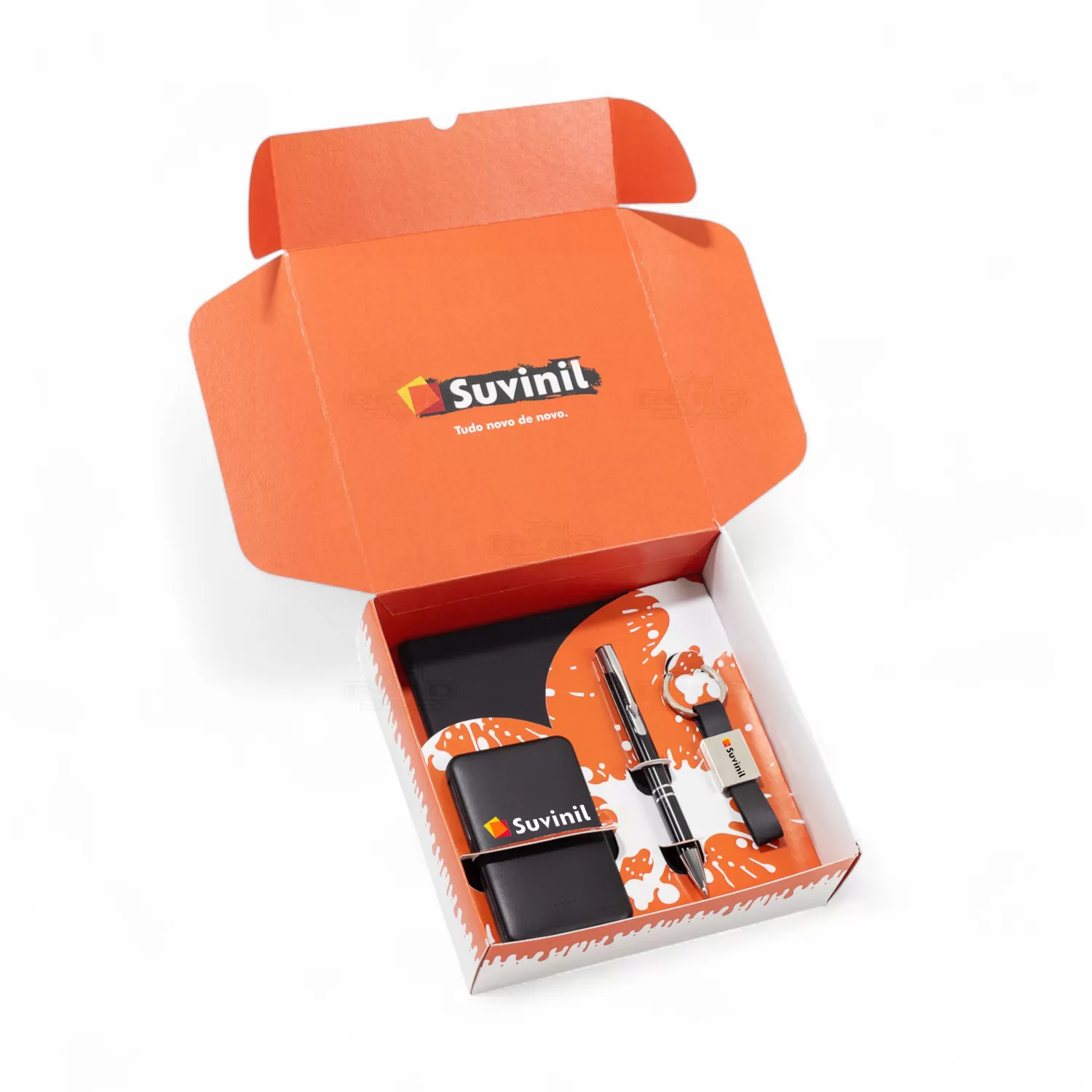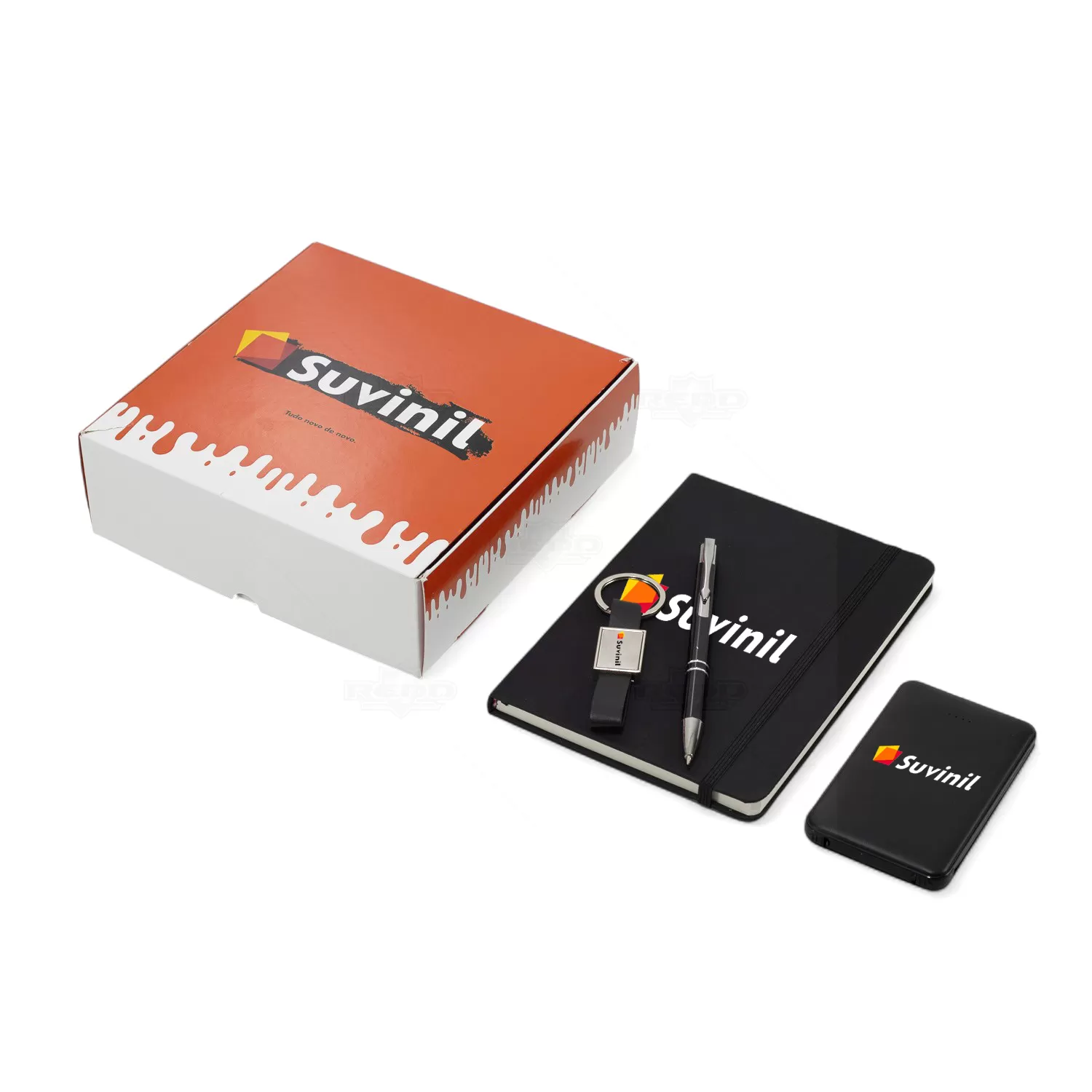 Kit composto por bloco de anotações com capa rígida e 80 folhas pautadas (BL74), caneta metálica de acabamento sofisticado e escrita fluida (CM07), além de chaveiro em metal com detalhe em tecido sintético que agrega elegância e durabilidade (CH03). Acompanha power bank de 5000mAh (TEC610), ideal para recarregar dispositivos eletrônicos com praticidade no dia a dia, garantindo energia extra em qualquer situação. Todos os itens são apresentados em embalagem personalizada confeccionada em papel triplex 300g/m², valorizando o visual e reforçando a identidade da marca. O conjunto combina funcionalidade e estilo, tornando-se uma excelente opção para brindes promocionais, eventos corporativos e presentes personalizados. Sua composição versátil e aparência moderna evidenciam qualidade e bom gosto, transmitindo uma imagem profissional e sofisticada para empresas que desejam destacar sua marca em campanhas e ações institucionais.
