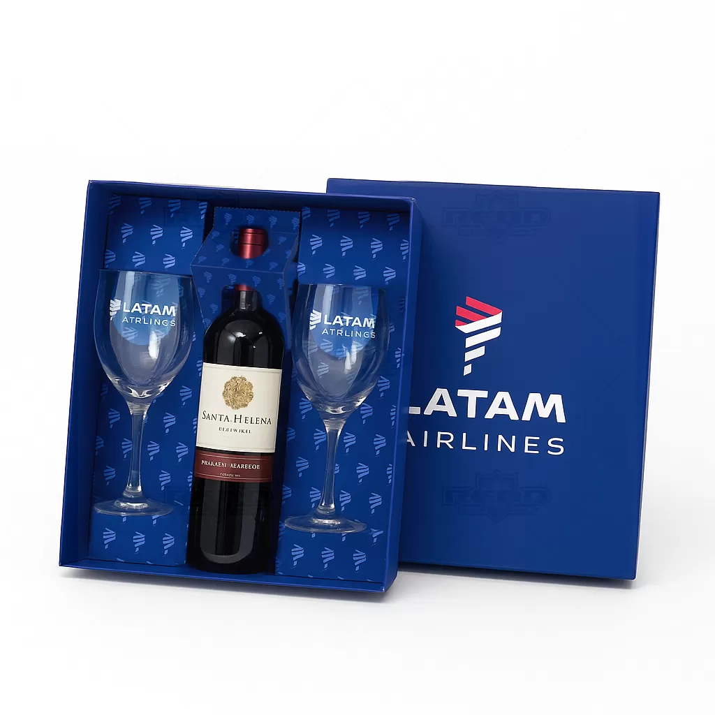 Kit Taças para Vinho personalizado, composto por duas taças de vidro com bojo amplo, haste longa e boca levemente fechada, ideais para apreciar vinhos com elegância. Acompanha uma garrafa de vinho cuidadosamente acondicionada em embalagem personalizada conforme o seu logo, confeccionada em caixa cartonada com papel Paraná, revestida em Alta Alvura 120g/m². A caixa possui excelente acabamento e pode ser totalmente personalizada com a identidade visual da marca, tornando o conjunto uma opção sofisticada para brindes corporativos, ações promocionais e presentes de fim de ano. As taças oferecem transparência e brilho, valorizando a experiência de degustação, enquanto o interior da embalagem apresenta berço ajustado que garante segurança e apresentação impecável. Este kit é perfeito para celebrar momentos especiais, reforçar relacionamentos comerciais e transmitir requinte e valorização da marca em qualquer ocasião.