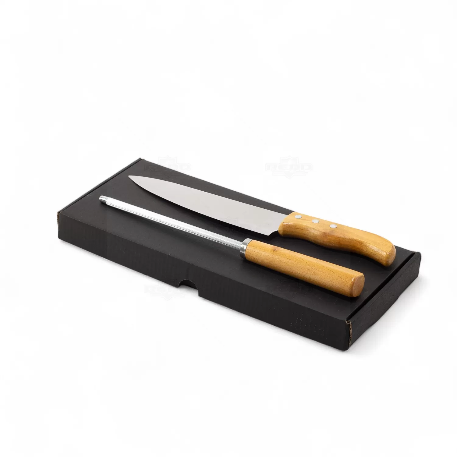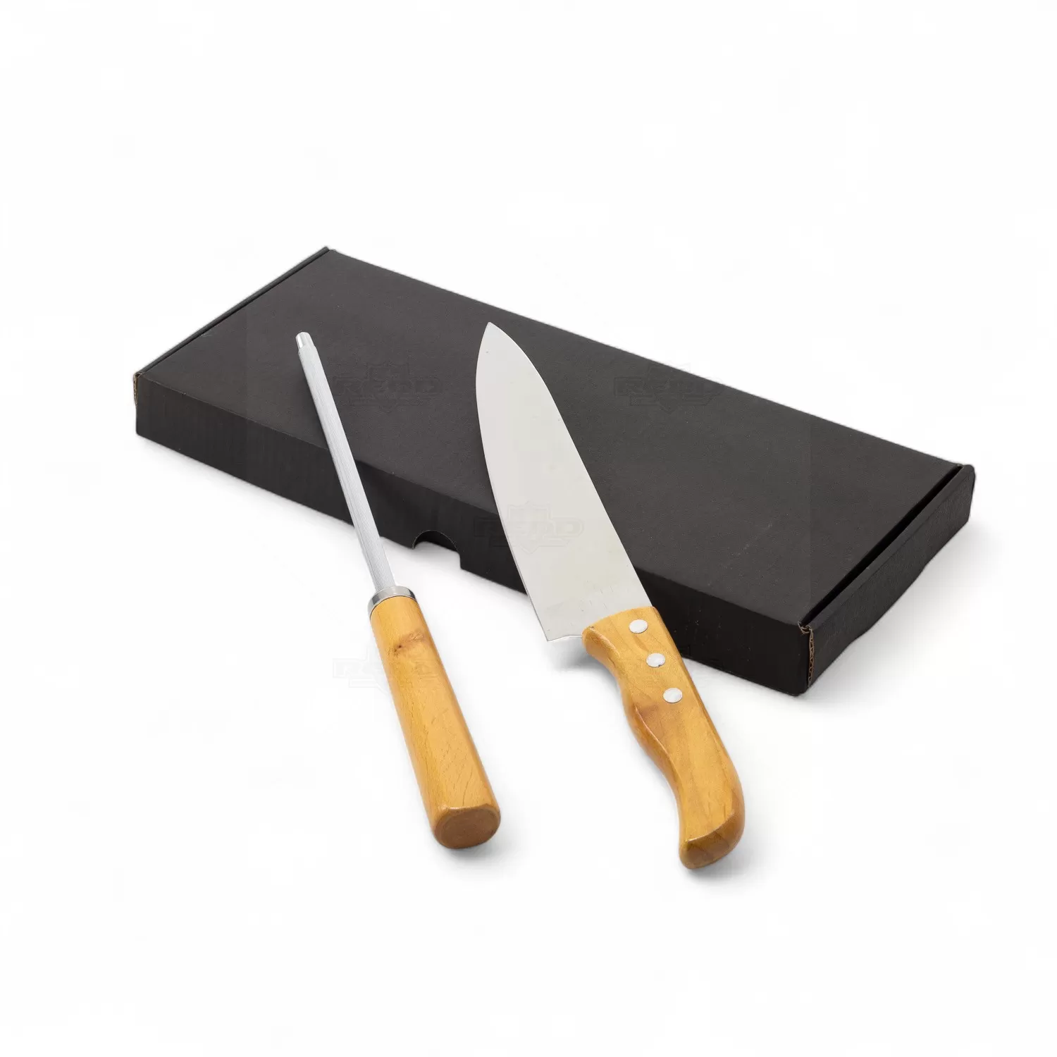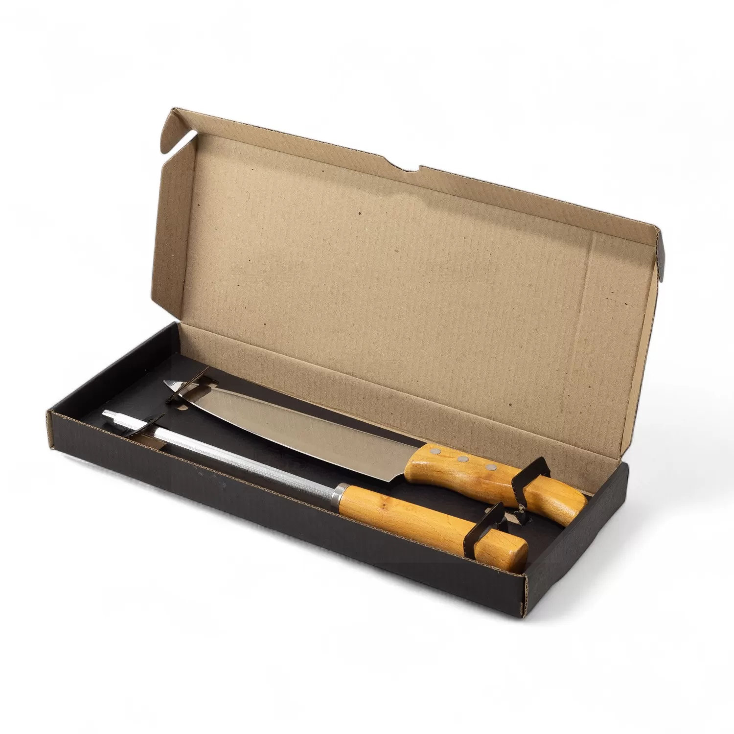 Conjunto composto por faca de 8” em madeira e inox e chaira em bambu e inox, ideal para o preparo e afiação de carnes com precisão e praticidade. A lâmina da faca proporciona excelente corte e durabilidade, enquanto o cabo anatômico garante firmeza e conforto durante o manuseio. A chaira auxilia na manutenção do fio da lâmina, mantendo o desempenho constante em cada uso. Ambos os itens apresentam acabamento refinado que une resistência e estética natural, valorizando o conjunto. Acondicionados em caixa de papel cartão, os utensílios ficam bem organizados e protegidos, prontos para presentear. Perfeito para ações promocionais, brindes corporativos e eventos personalizados, o kit é uma excelente escolha para quem busca funcionalidade e elegância em utensílios de cozinha, sendo também uma opção sofisticada para amantes de churrasco e gastronomia.