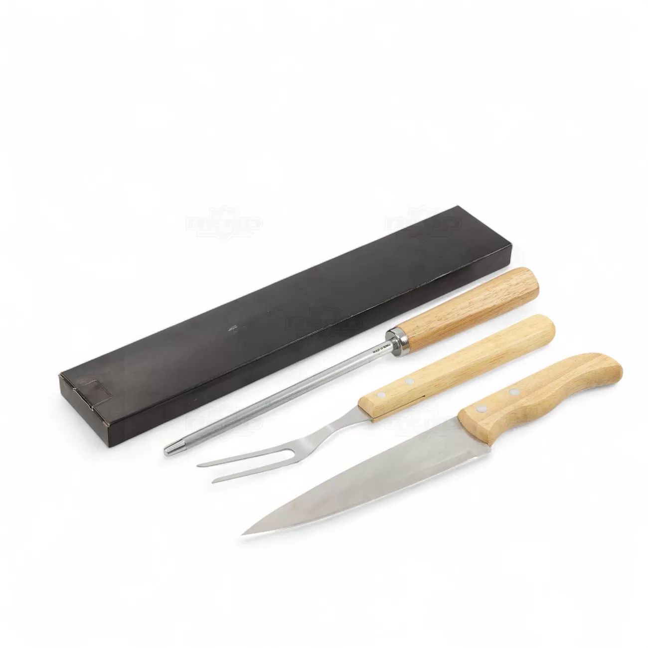 Conjunto composto por faca 7”, garfo trinchante e chaira, todos confeccionados em madeira e aço inox de alta resistência. A faca possui lâmina afiada que garante cortes precisos e seguros, enquanto o garfo trinchante proporciona firmeza ao manusear carnes e alimentos. A chaira mantém o fio da lâmina sempre pronto para o uso, oferecendo praticidade no preparo de churrascos e refeições especiais. As peças contam com cabos ergonômicos em madeira natural, fixados com rebites metálicos que conferem durabilidade e excelente acabamento. Acompanha caixa para presente em papel cartão rígido, ideal para armazenar e transportar o conjunto de forma segura e elegante. Perfeito para uso doméstico ou profissional, é também uma excelente opção de brinde promocional ou presente personalizado em eventos corporativos, valorizando o bom gosto e a funcionalidade em cada detalhe.