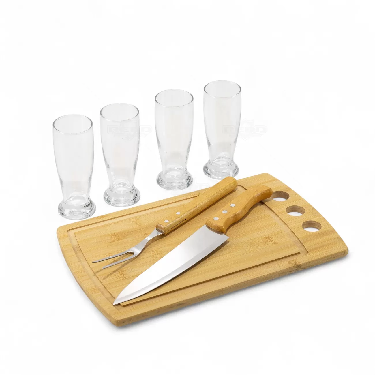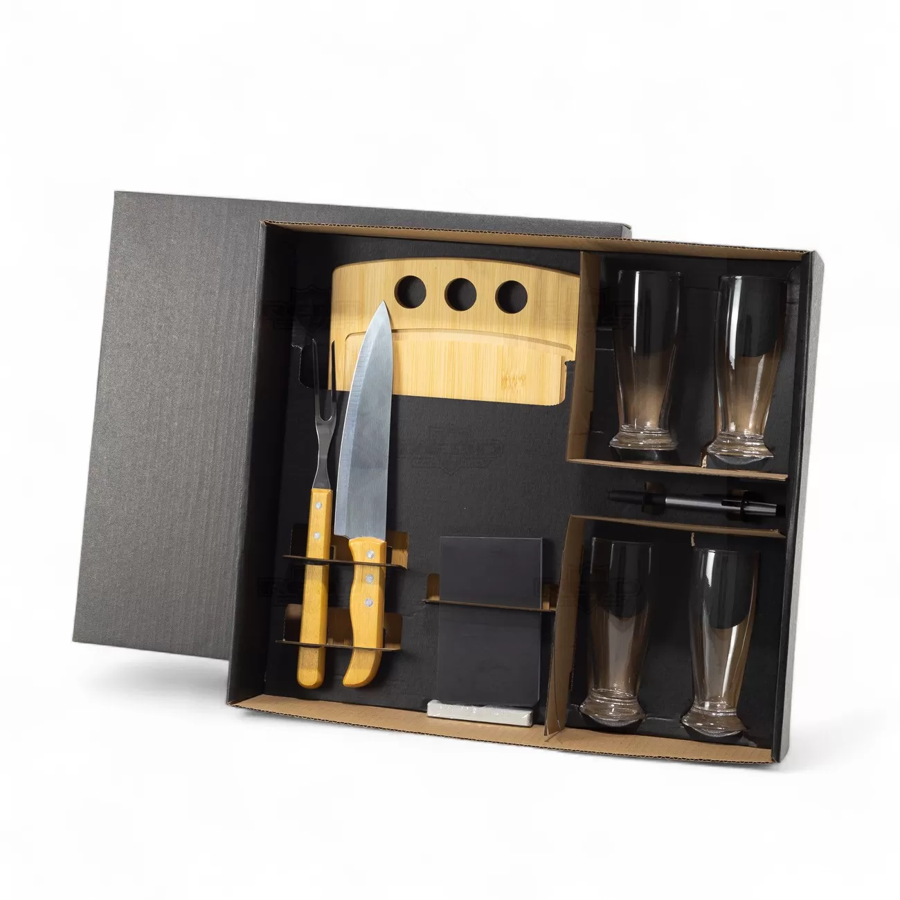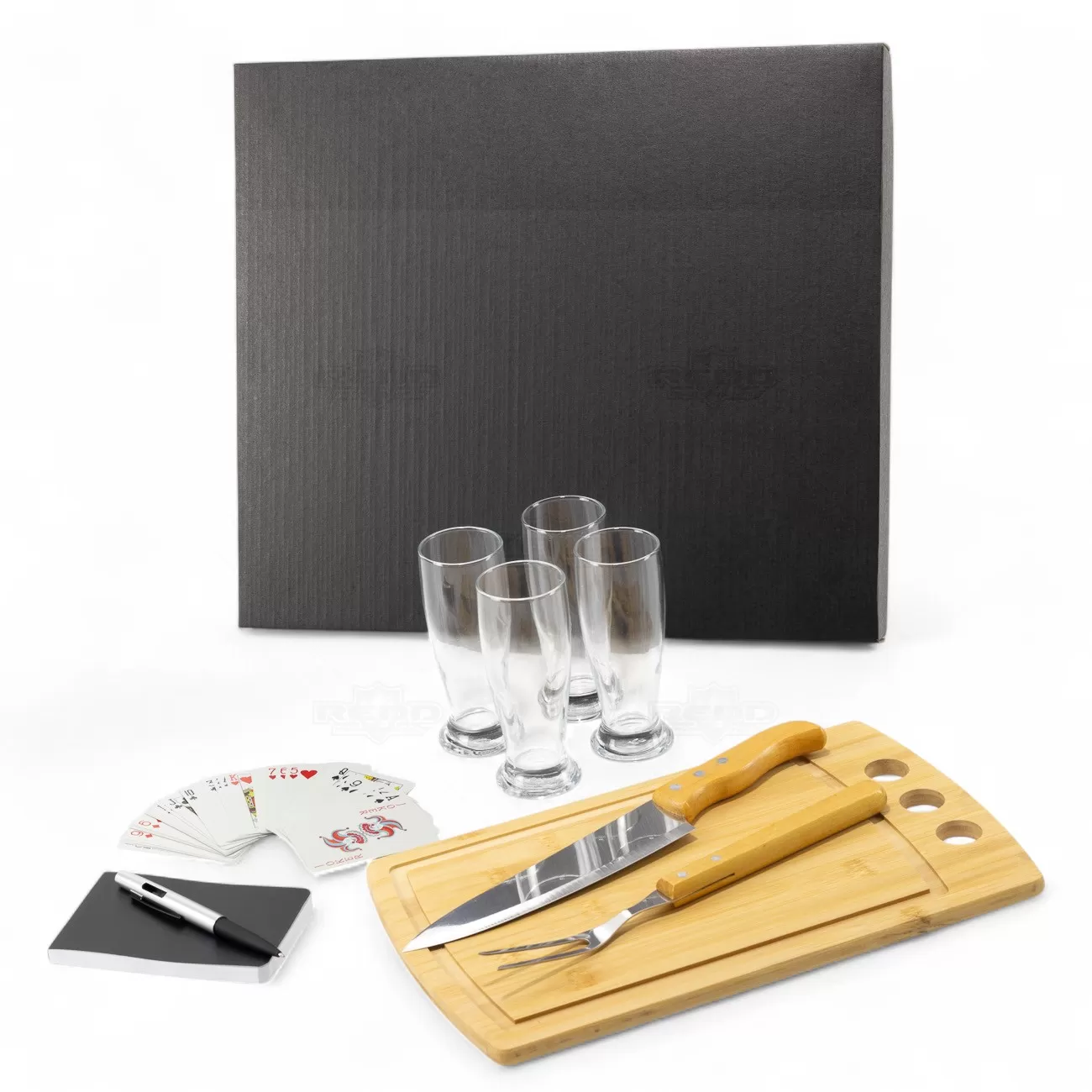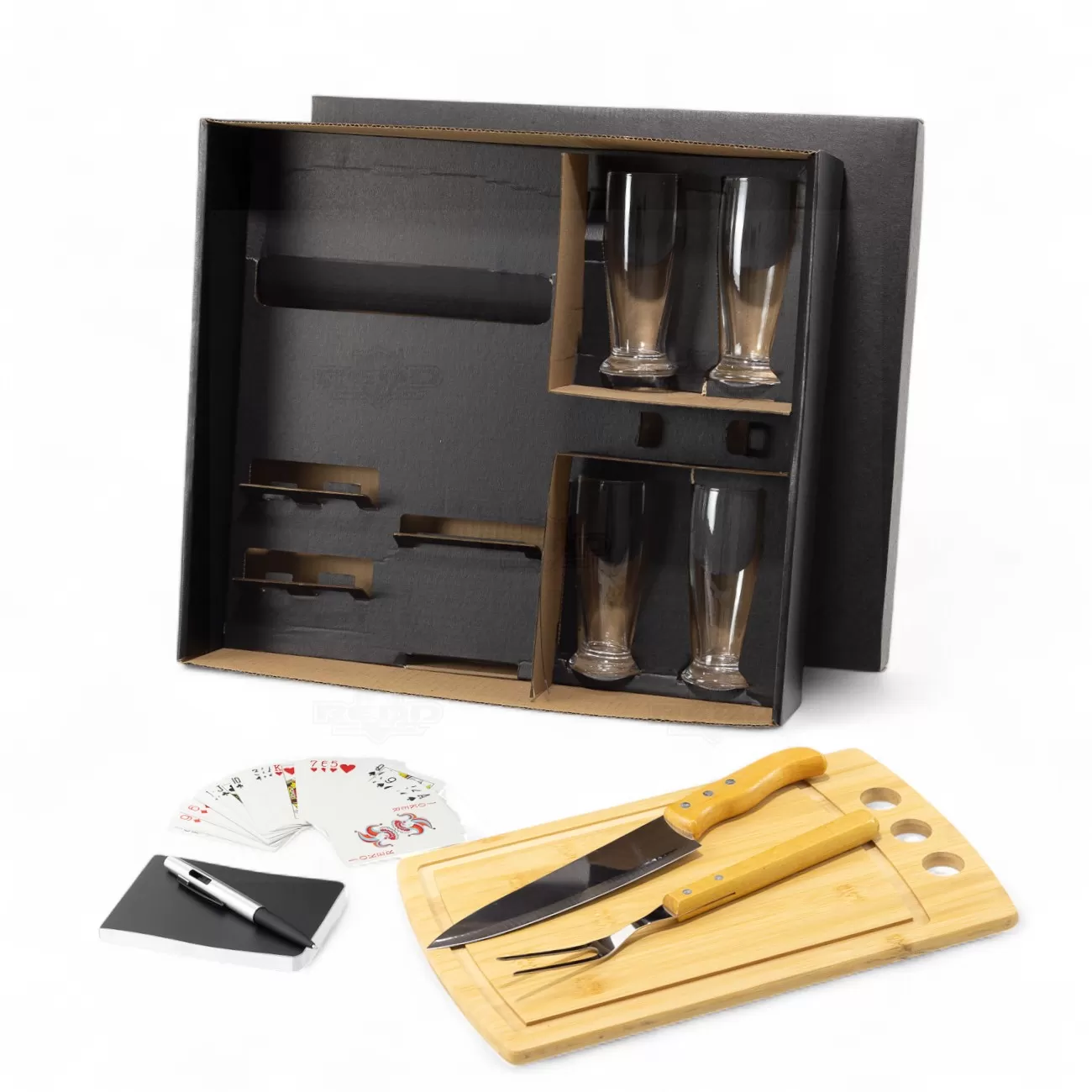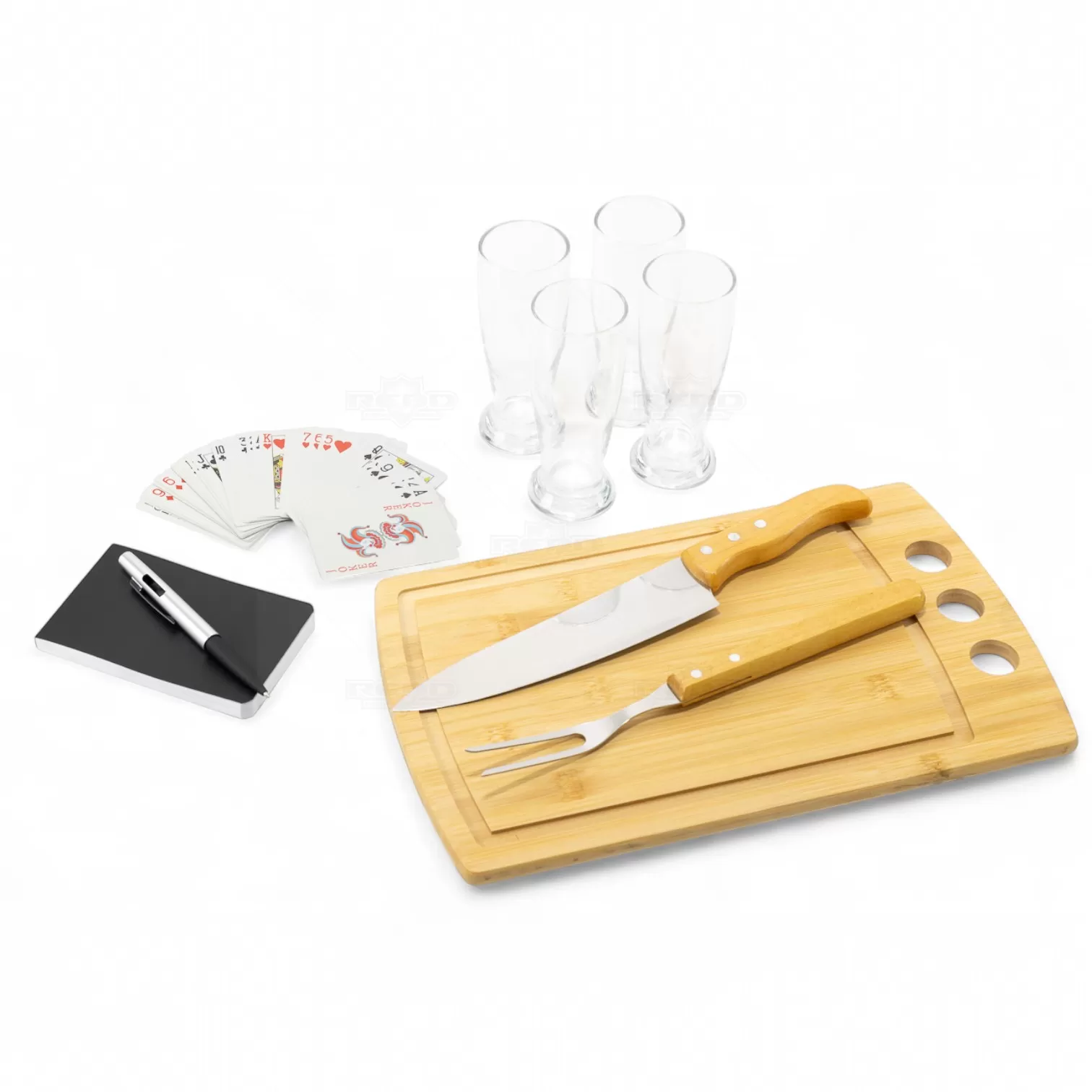 Kit completo para momentos de lazer e descontração, composto por tábua em bambu com três furos, faca 8” e garfo trinchante em madeira e aço inox, quatro copos de cerveja em vidro, baralho, bloco de anotações e caneta esferográfica. A tábua é produzida com tripla camada invertida, que proporciona maior durabilidade e evita deformações com o uso contínuo. A faca e o garfo oferecem excelente desempenho para o preparo e serviço de carnes, enquanto os copos são ideais para saborear bebidas geladas. O baralho e o bloco com caneta completam o kit, tornando-o perfeito para churrascos, jogos e confraternizações. Acondicionado em caixa presenteável, é uma escolha sofisticada para brindes promocionais, eventos corporativos ou presentes personalizados, unindo funcionalidade, estilo natural e praticidade em um único conjunto versátil e elegante.