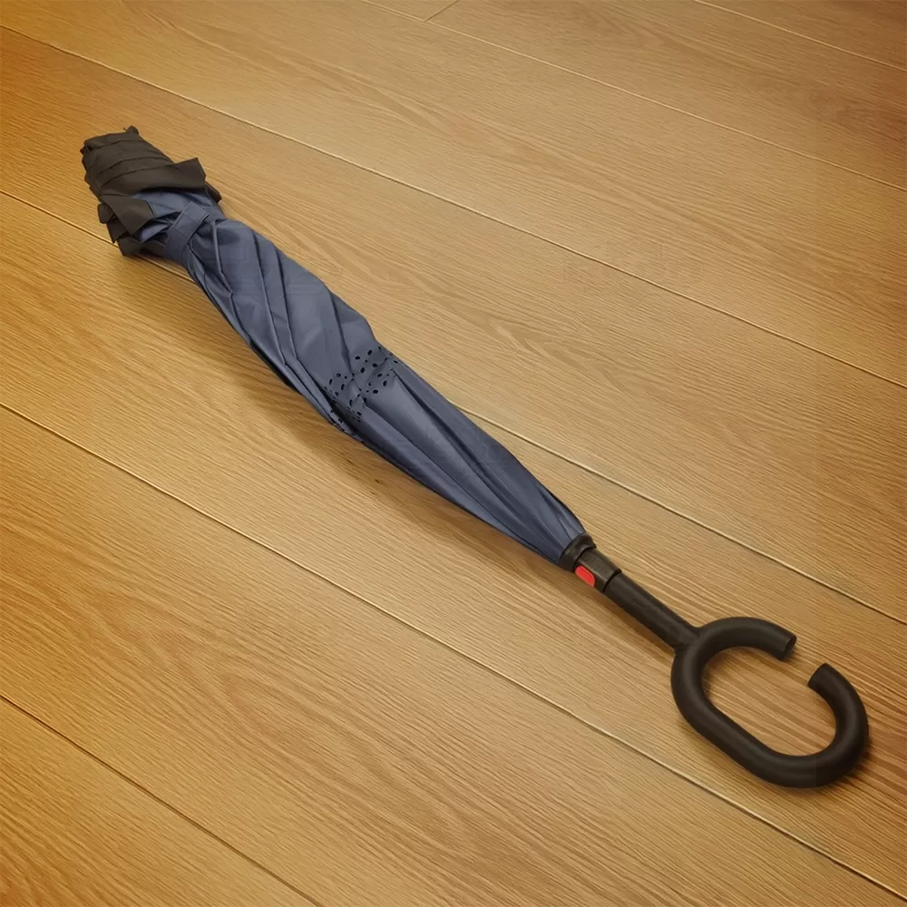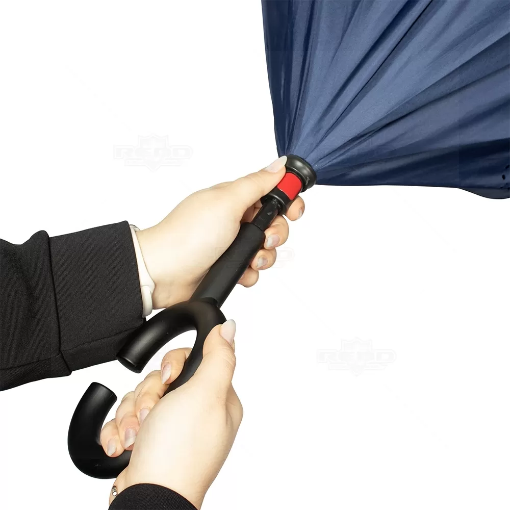 Guarda-chuva de abertura invertida manual confeccionado em nylon impermeável, projetado para oferecer proteção eficiente e praticidade em dias de chuva. Sua estrutura metálica com oito varetas garante resistência e estabilidade, enquanto a camada interna de forro contribui para maior durabilidade e acabamento refinado. O sistema de abertura invertida facilita o uso ao entrar ou sair de veículos e ambientes, evitando respingos e mantendo a parte molhada voltada para dentro ao fechar. O pegador em plástico fosco no formato de C permite apoio confortável no braço, deixando as mãos livres para carregar bolsas, sacolas ou realizar outras tarefas. Conta ainda com botão para fechamento e fita com ponta em velcro que mantém o guarda-chuva organizado após o uso. É uma opção funcional e elegante para ações promocionais, brindes corporativos e eventos que buscam oferecer um item útil e de design diferenciado.