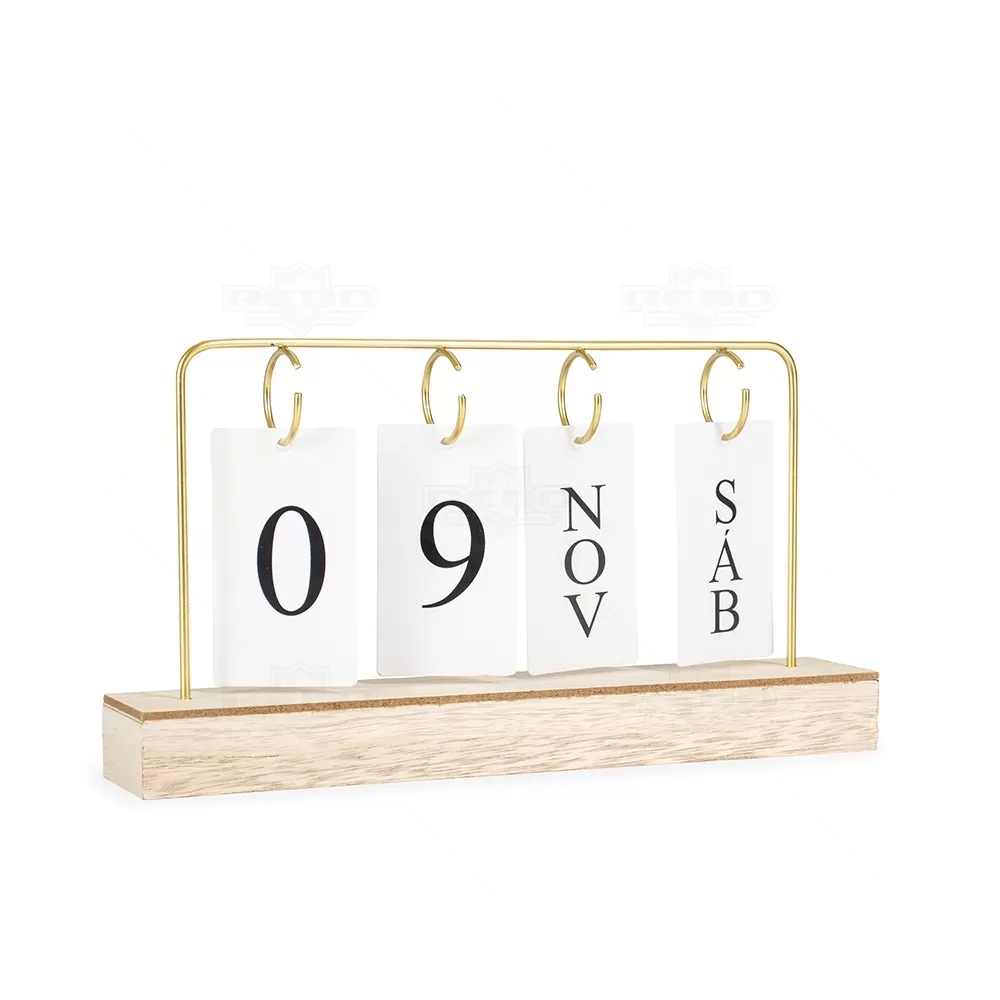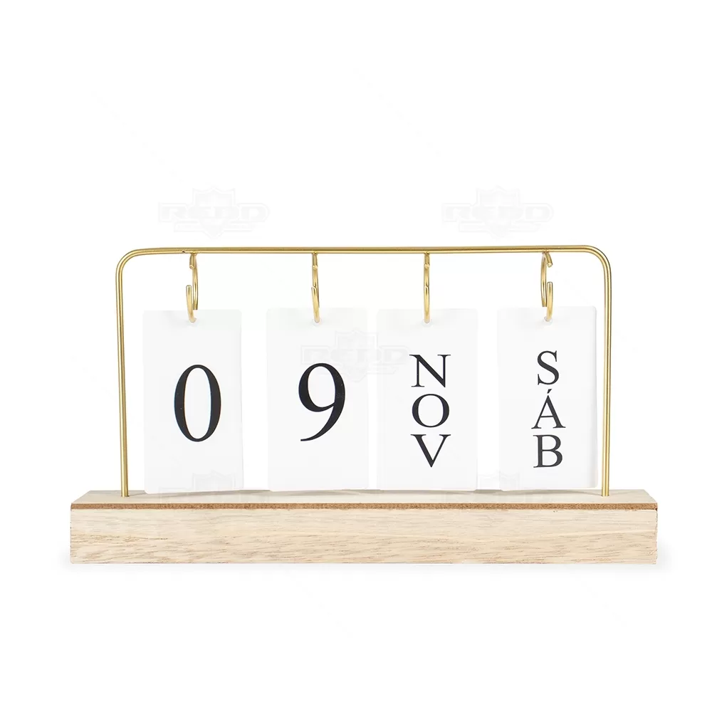Calendário permanente com base em MDF e estrutura em ferro. Composição resistente e estável, indicada para uso contínuo. Possui fichas móveis em papel cartão, permitindo a montagem manual da data. Exibe dia em números, além de mês e dias da semana em formato abreviado. Produto permanente, não vinculado a ano específico, o que garante reutilização prolongada. Estrutura compacta, de fácil manuseio e boa visibilidade sobre mesas e superfícies planas. Indicado para organização do dia a dia, auxilia no acompanhamento de datas de forma prática e visual, sendo ideal para mesas de trabalho, estudo ou recepção. Uma opção funcional e decorativa para escritórios, home office e ambientes corporativos, combinando durabilidade, design moderno e uso atemporal, contribuindo para uma rotina mais organizada e elegante.