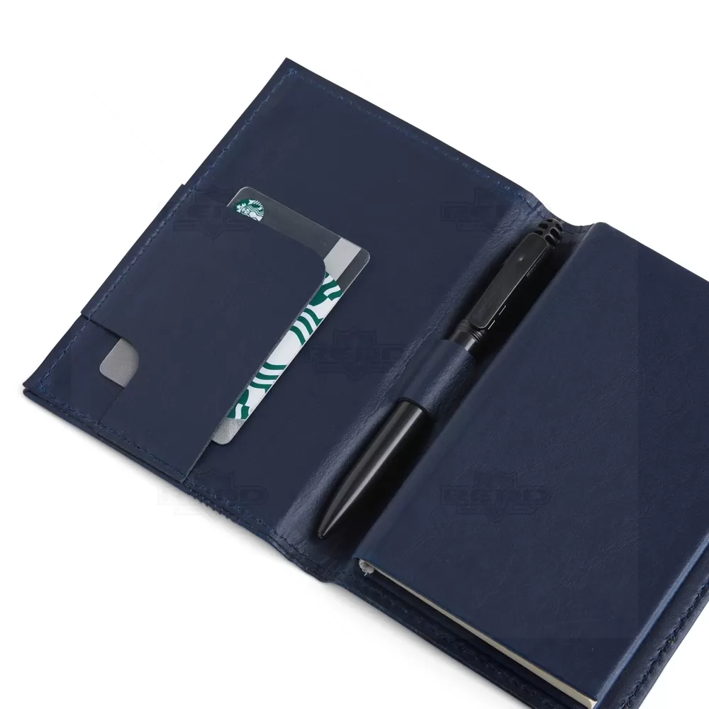 Bloco de anotações com capa em couro sintético formato compacto. Contém aproximadamente 80 folhas marfim sem pauta, adequadas para escrita manual. Capa com acabamento em costura e detalhes em baixo relevo. Possui porta-caneta integrado e compartimento para cartão, agregando praticidade ao uso diário. Caneta não inclusa. Indicado para anotações do dia a dia, lembretes, planejamentos rápidos e organização pessoal. O tamanho compacto facilita o transporte em bolsas, mochilas ou pastas, permitindo o uso em diferentes ambientes com comodidade. Uma opção funcional e elegante para trabalho, estudos ou rotina pessoal, unindo praticidade, bom acabamento e versatilidade, sendo ideal para quem busca um bloco de anotações prático e com apresentação sofisticada.