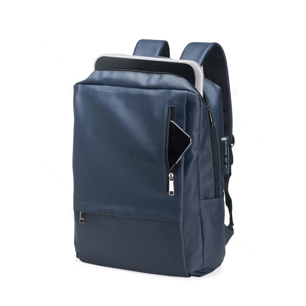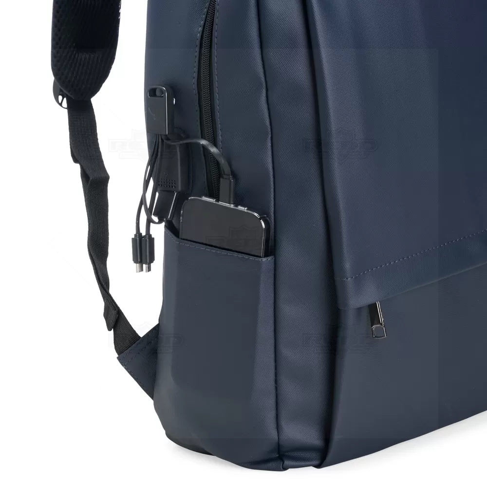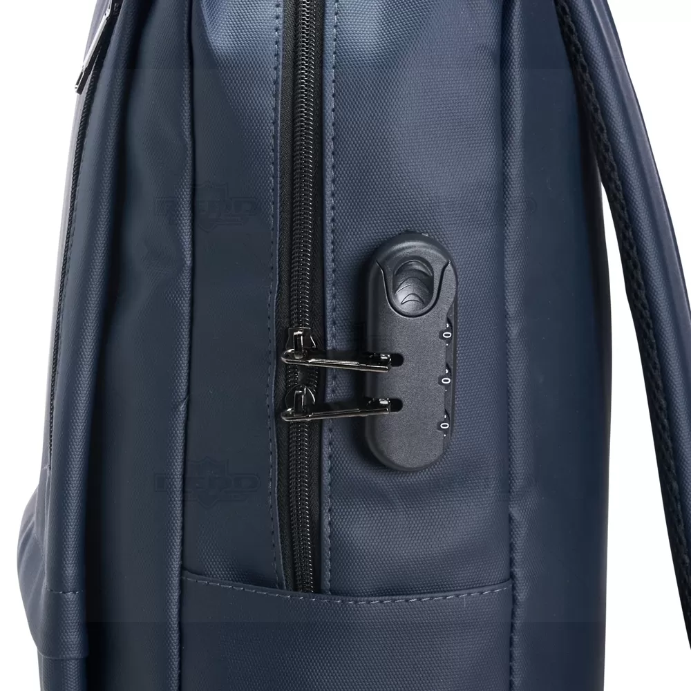 Mochila impermeável em PU e capacidade para até 22 litros, ideal para quem busca praticidade e proteção no dia a dia. Confeccionada em PU resistente, oferece excelente desempenho contra umidade e respingos, preservando documentos e equipamentos eletrônicos. Possui compartimento interno com divisória para notebooks de até 15,6 polegadas, garantindo organização e segurança no transporte. Conta ainda com dois bolsos frontais com fechamento em zíper para itens de fácil acesso e mais um par de bolsos laterais abertos que ampliam a funcionalidade. Dispõe de suporte externo USB que facilita o carregamento de dispositivos móveis em deslocamentos, além de cadeado numérico que reforça a segurança. As alças de mão e de costas com revestimento acolchoado proporcionam conforto mesmo em uso prolongado. Versátil e moderna, é excelente opção para brindes promocionais, eventos corporativos e presentes personalizados com foco em tecnologia e mobilidade.
