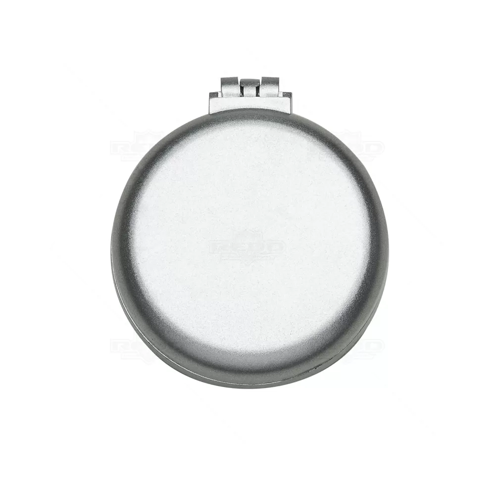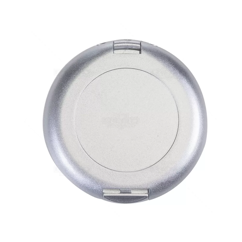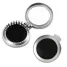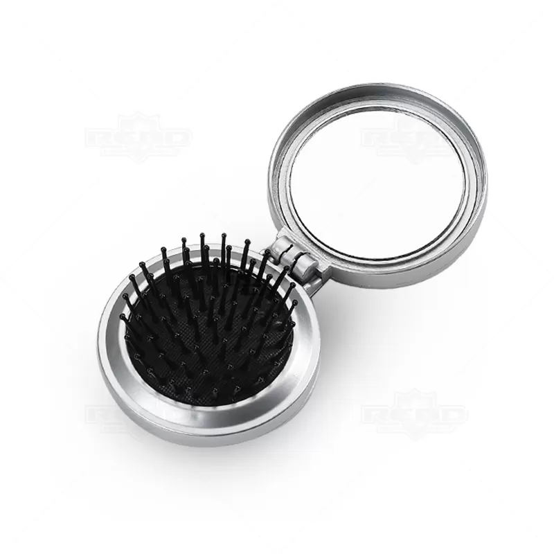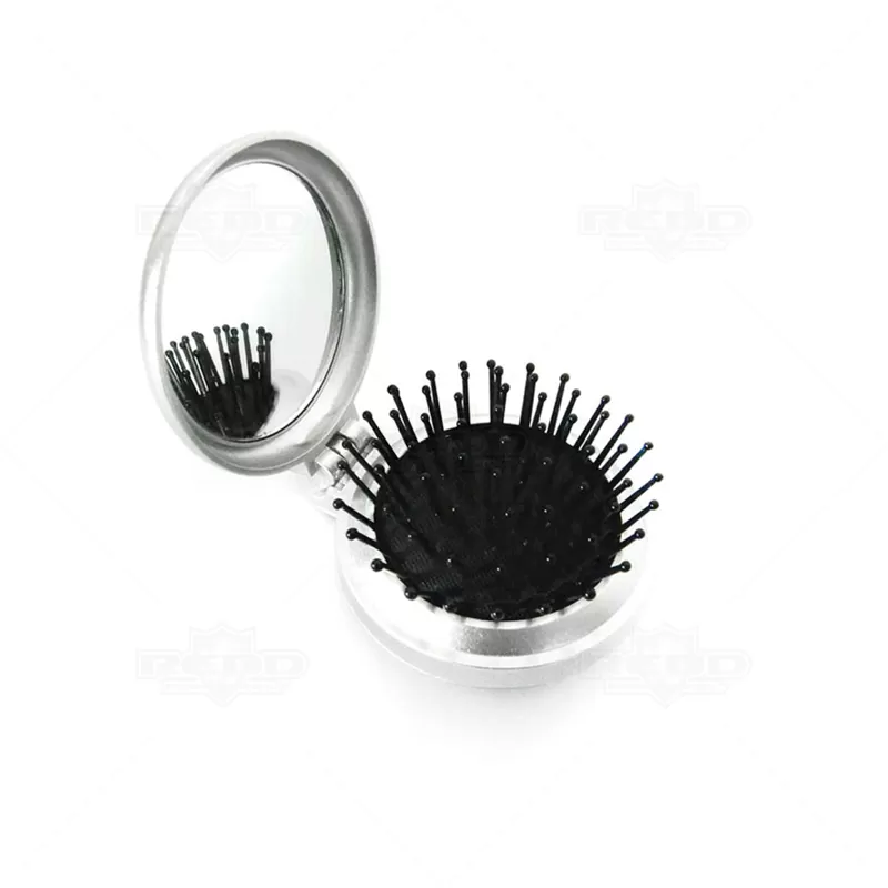 Escova com espelho interno personalizada produzido em plástico com acabamento externo prateado. Possui escova retrátil internamente com cerdas macias de pontas arredondadas. Ideal para brindes promocionais e eventos corporativos.