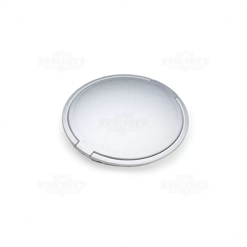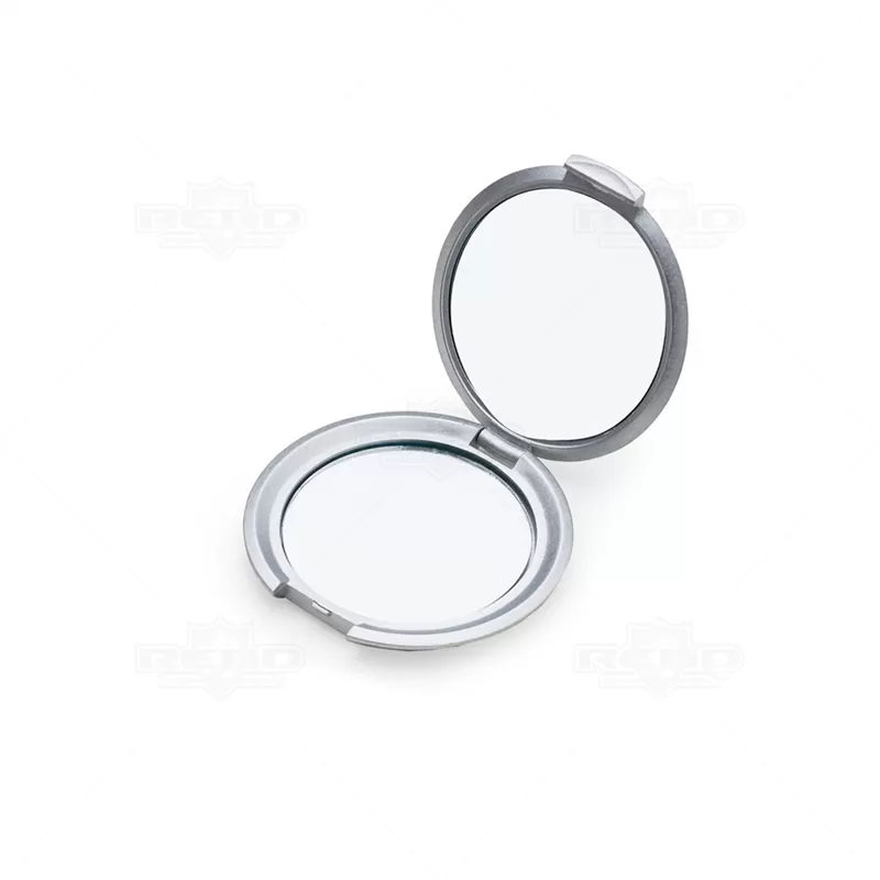 Espelho de bolso duplo personalizado produzido em plástico com acabamento externo prateado. Possui espelho duplo internamente sem lente de aumento e tampa protetora. Ideal para brindes promocionais e eventos corporativos.