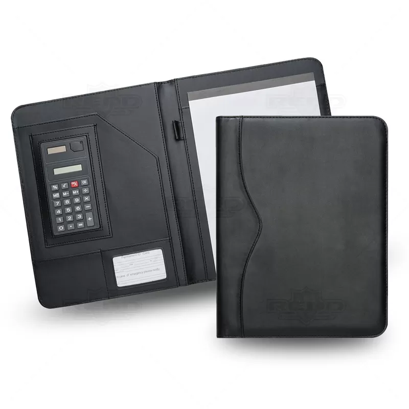 Pasta convenção personalizada, produzida em material sintético, conta com um bloco para anotações com 20 páginas, calculadora digital e porta caneta na parte interna (não acompanha), com um design elegante e moderno. Ideal para brindes promocionais, eventos corporativos e palestras institucionais.