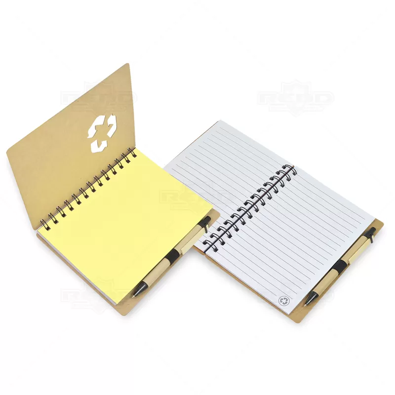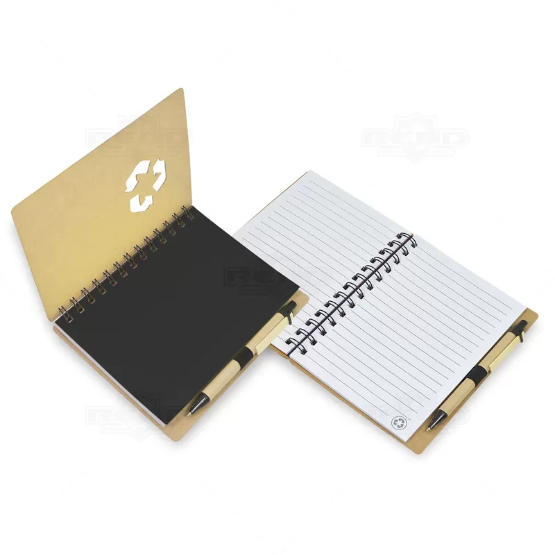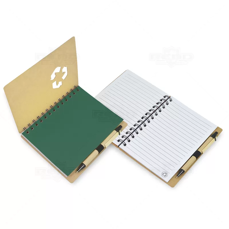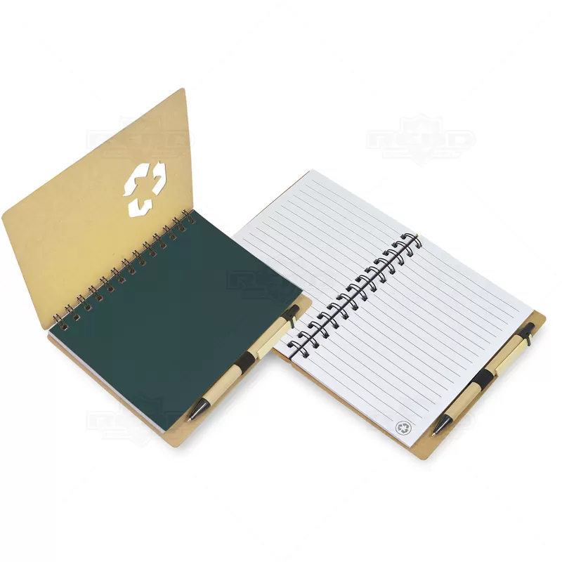 Bloco de anotações personalizado produzido em papel Kraft, possui logotipo universal de material reciclável na capa, espiral wire-o preto, caneta esferográfica com carga azul e folhas internas pautadas. Fácil de transportar, pode ser usado no trabalho, no dia dia em pequenas anotações diárias, campanhas publicitárias, eventos promocionais, brindes corporativos e diversos segmentos que envolvam sua empresa.