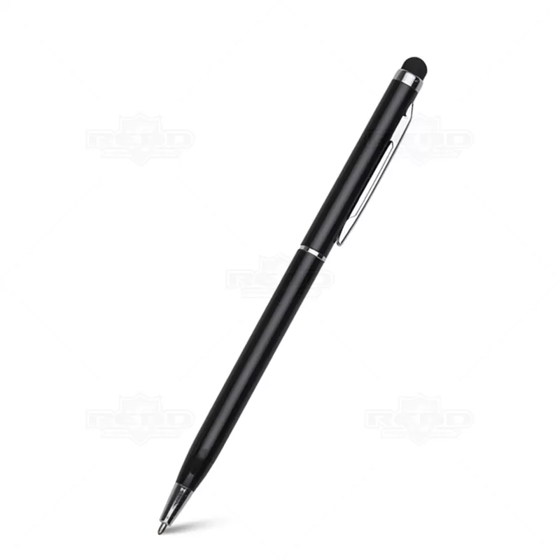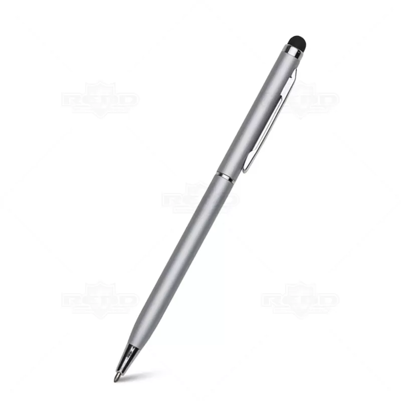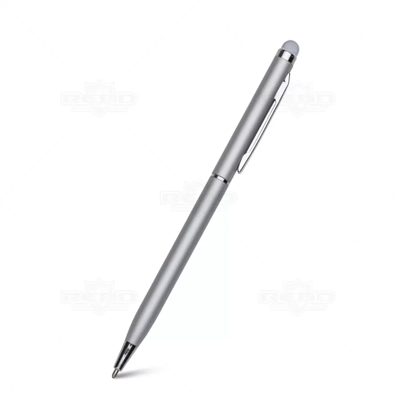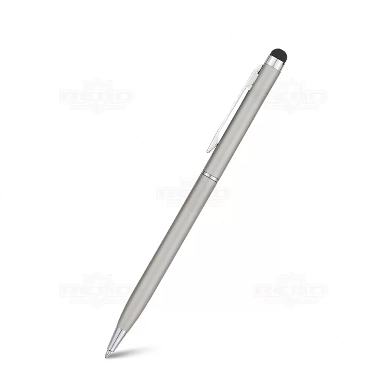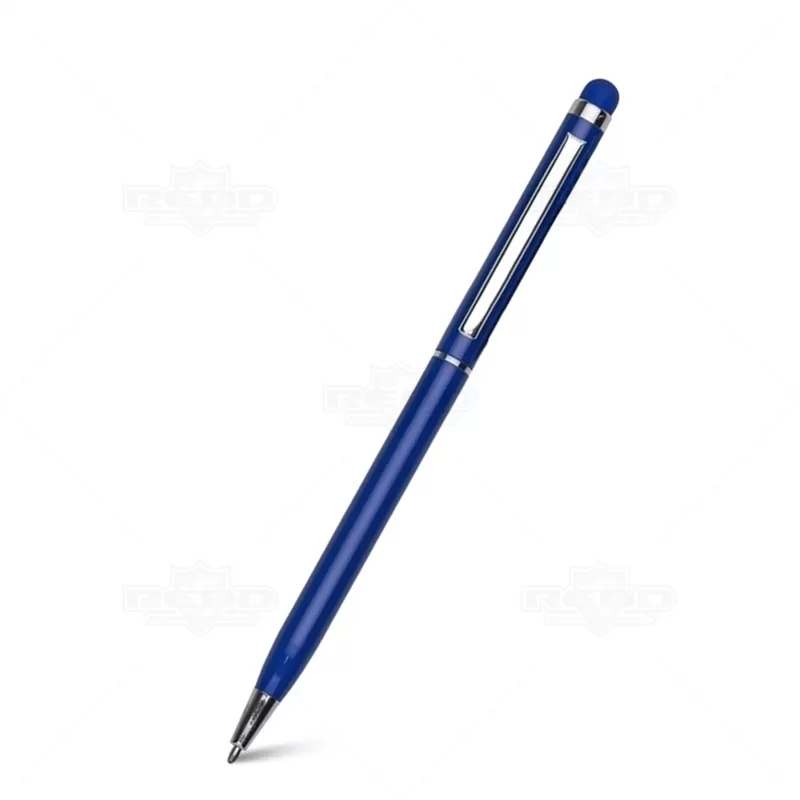 Caneta de metal com ponteira touch personalizada, possui clip de metal, esferográfica na cor azul com acionamento por giro e ponteira touch para uso em tablets e smartphones. Ideal para divulgar sua empresa em eventos corporativos, brindes personalizados e campanhas promocionais. Imagem ilustrativa.