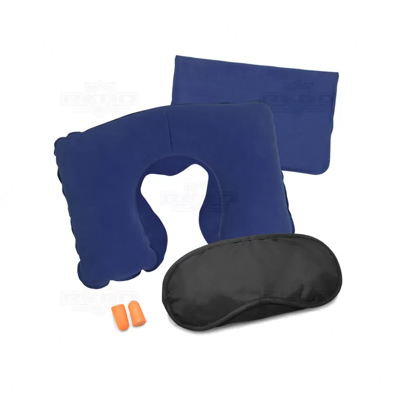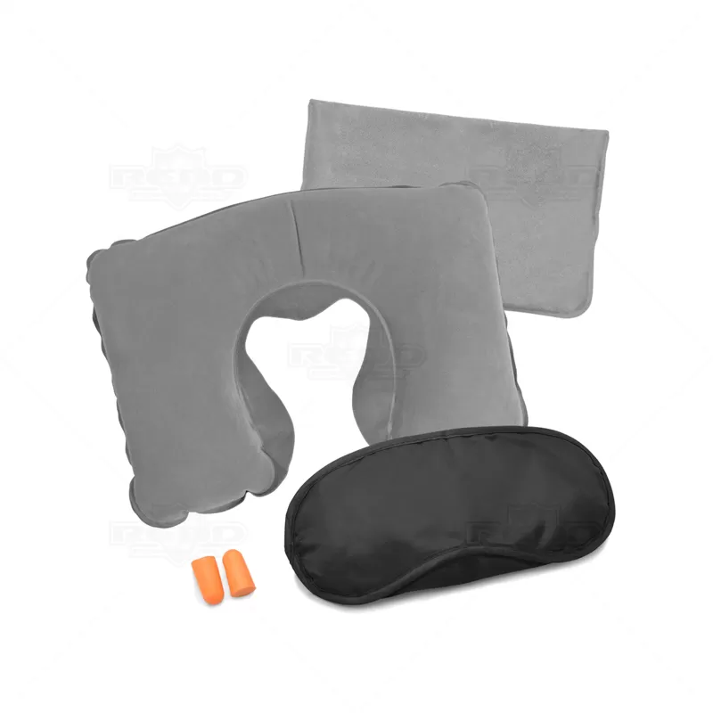 Kit viagem personalizado com travesseiro de pescoço inflável revestido em veludo, máscara em cetim para os olhos, protetor auricular e bolsa para acondicionamento do kit. Travesseiro de pescoço é projetado ergonomicamente para apoiar o pescoço durante o sono, ajudando a evitar rigidez e desconforto. A máscara para os olhos bloqueia a luz, ajudando a criar um ambiente mais escuro e propício ao sono. Feita em cetim leve e confortável para evitar pressão sobre os olhos, é ajustável para se adequar a diferentes formatos de rosto. Os protetores auriculares bloqueiam o ruído ambiente, proporcionando um ambiente mais tranquilo para dormir ou relaxar durante a viagem. Produzido de espuma, são moldáveis, adaptando-se confortavelmente ao canal auditivo e reduzindo significativamente o ruído externo ajudando a tornar viagens longas mais confortáveis, permitindo que você descanse e relaxe melhor durante o trajeto. Ideal para brindes promocionais e eventos corporativos.