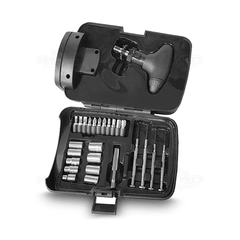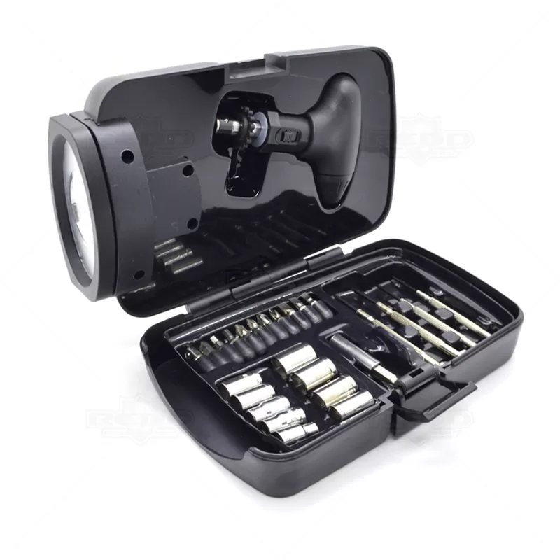 Kit ferramentas com 27 peças e 1 lanterna acoplada personalizada. Ideal para pequenos reparos, brindes promocionais e eventos corporativos.