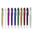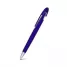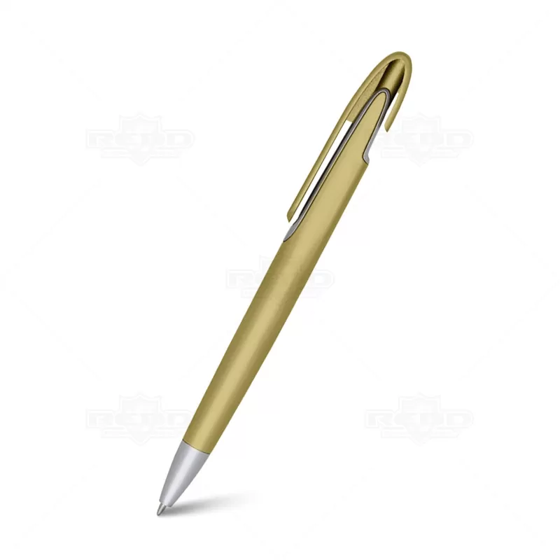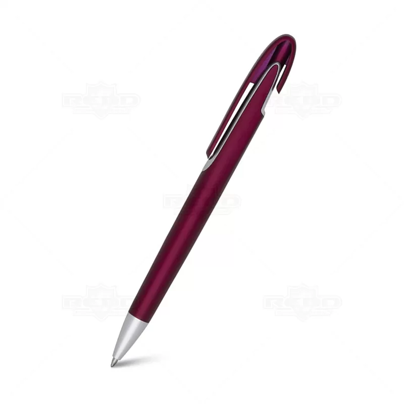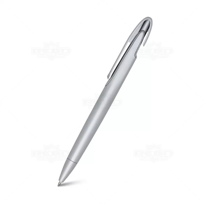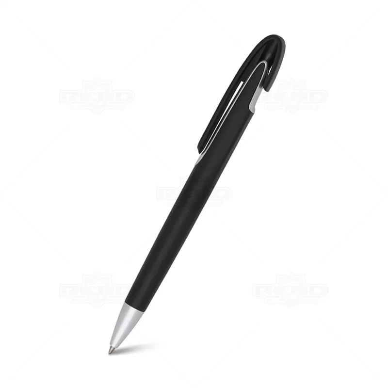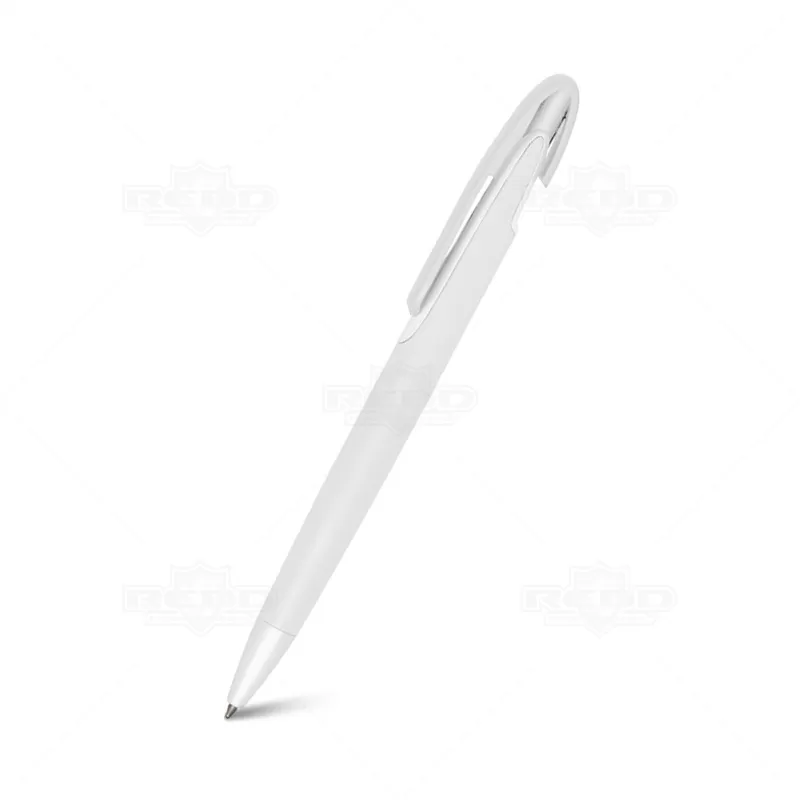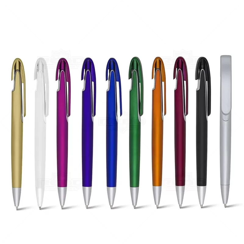 Caneta plástica personalizada com clip diferenciado, acionamento da ponteira por click e escrita na cor azul. Ideal para brindes promocionais e eventos corporativos.