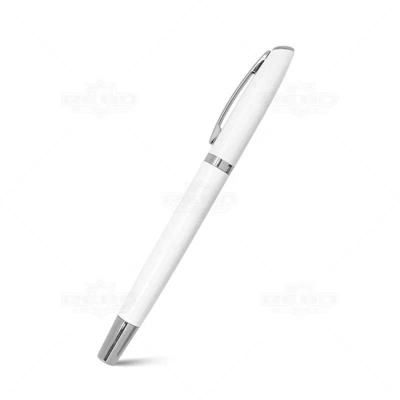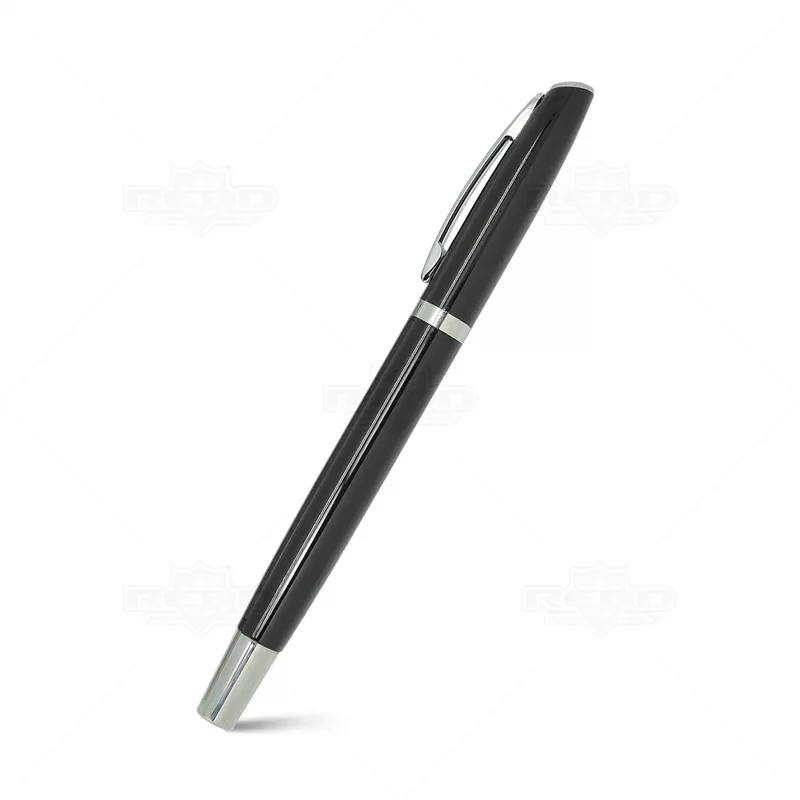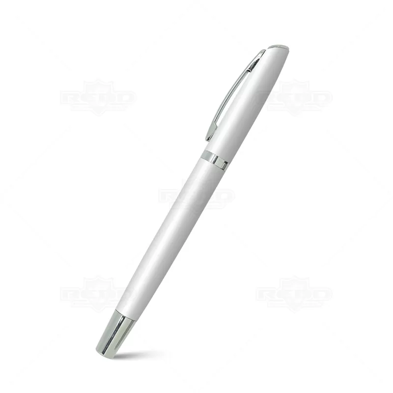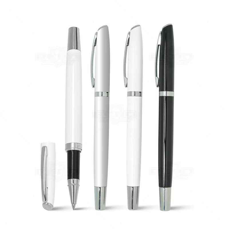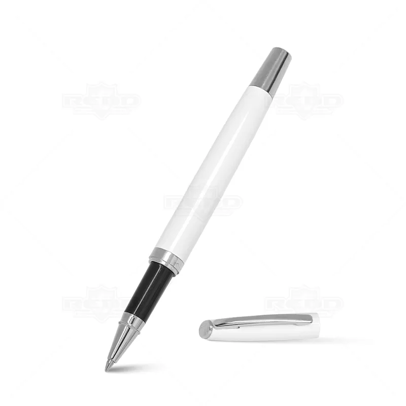 Caneta Roller de metal personalizada com tampa removível, escrita na cor azul, e detalhe em prata e um design elegante. Ideal para divulgar sua empresa em eventos corporativos, brindes personalizados e campanhas promocionais.