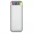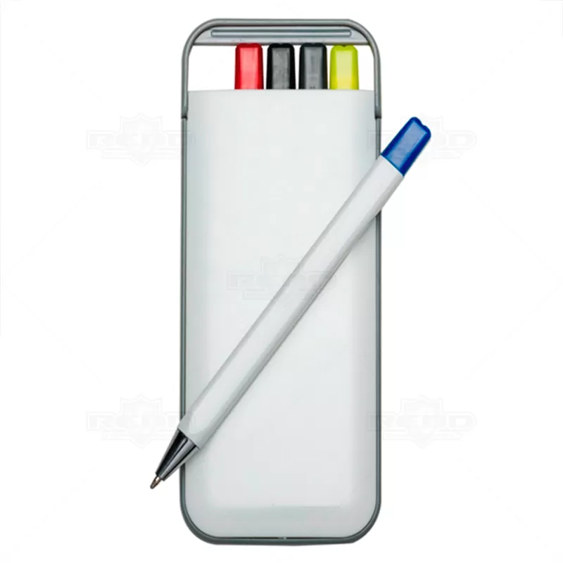Kit 5 em 1 branco em plástico resistente. Possui: caneta/carga azul, caneta/carga preto, caneta/carga vermelha, marca texto amarelo e lapiseira. Lateral e trava(basta movimentar para os lados) superior em cinza.