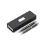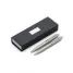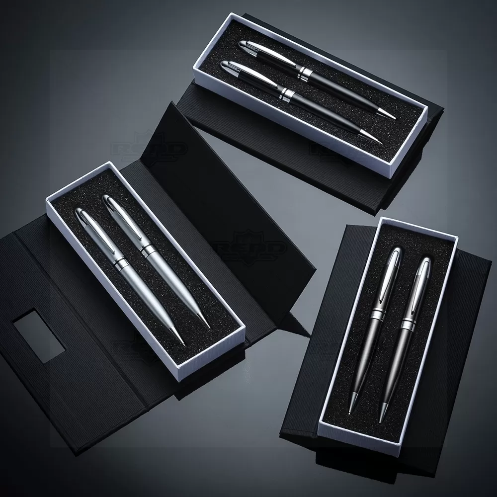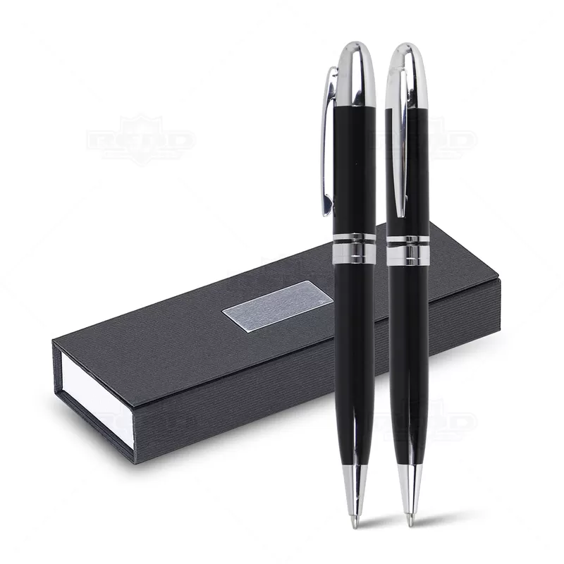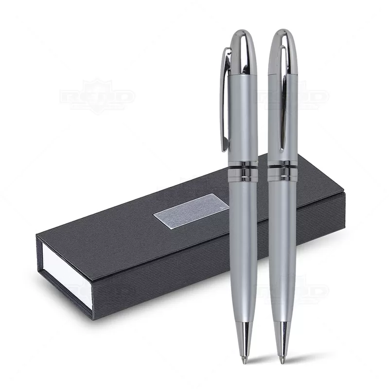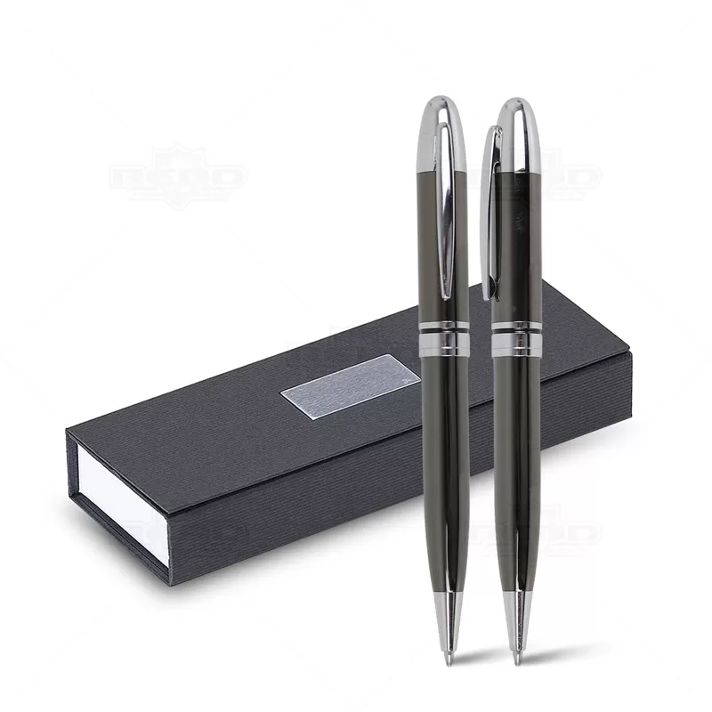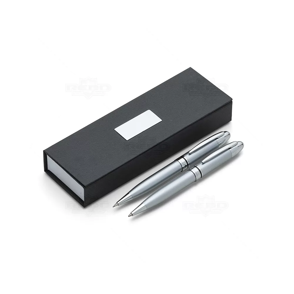 Conjunto de caneta e lapiseira personalizado. Possui 1 caneta de metal esferográfica com carga azul e acionamento da escrita por giro, 1 lapiseira com grafite 0.5, estojo personalizado produzido em cartonagem com berço interno em E.V.A e placa de metal na parte frontal do estojo. Tamanho do estojo: 180 x 65 mm. Ideal para divulgar sua empresa em eventos corporativos, brindes personalizados e campanhas promocionais.